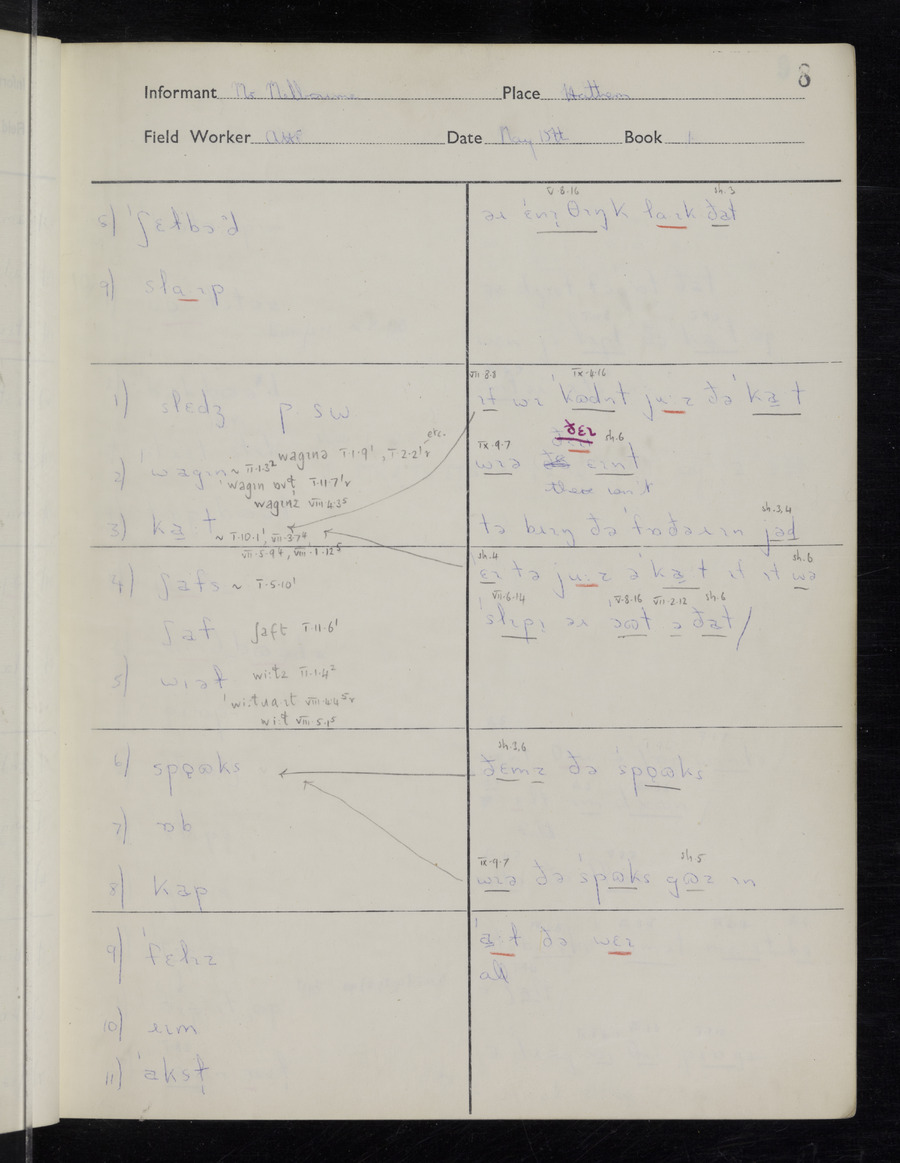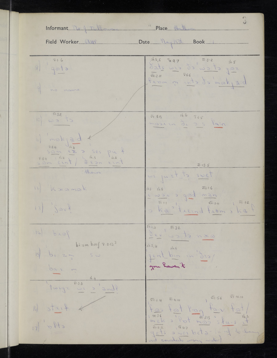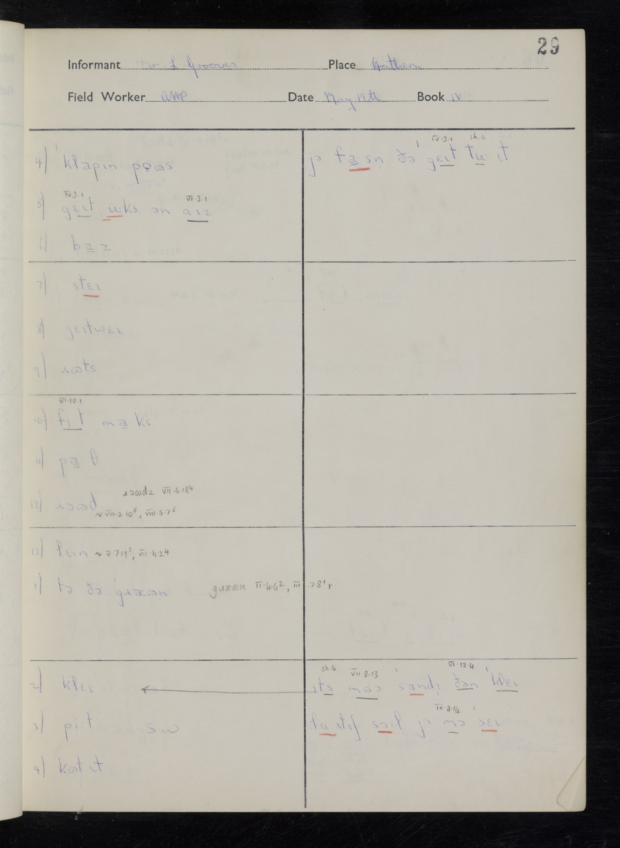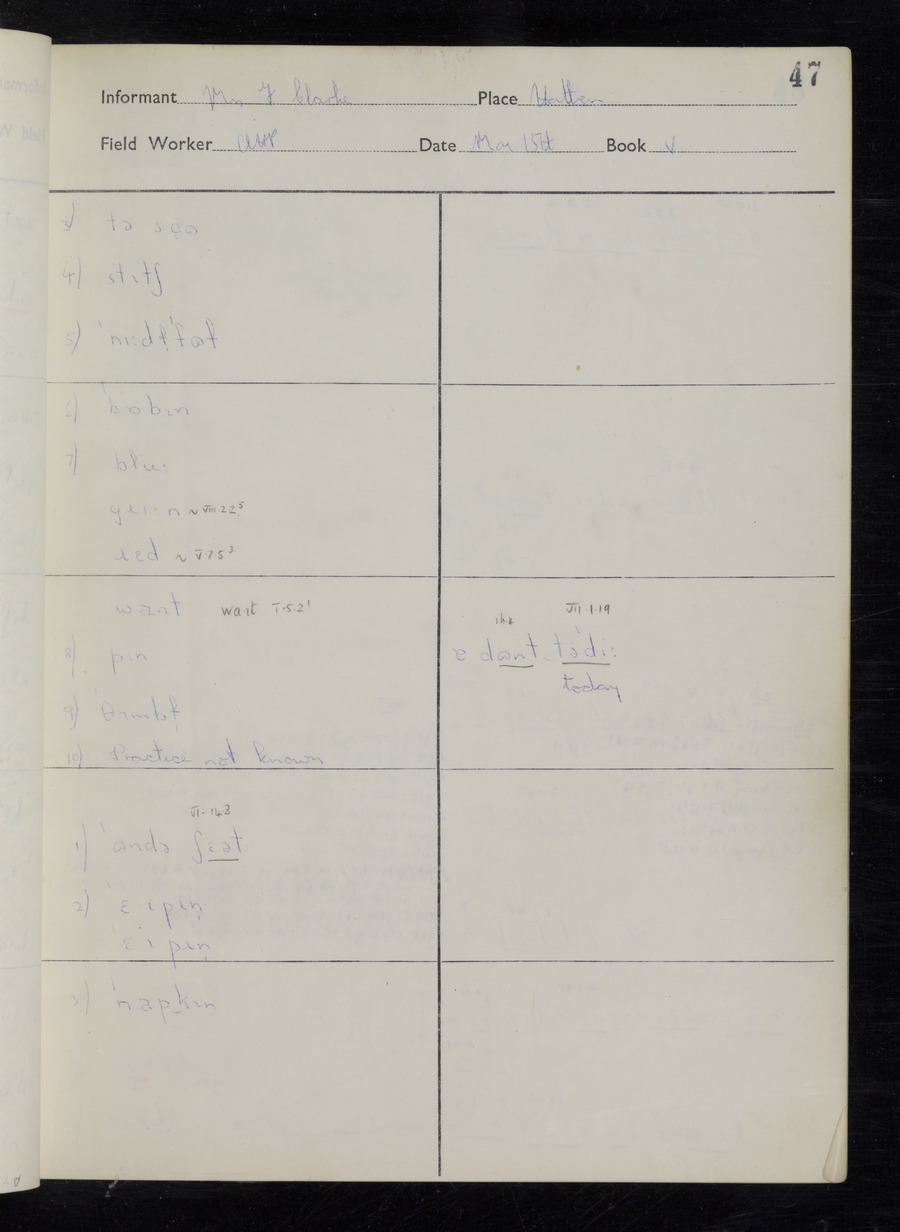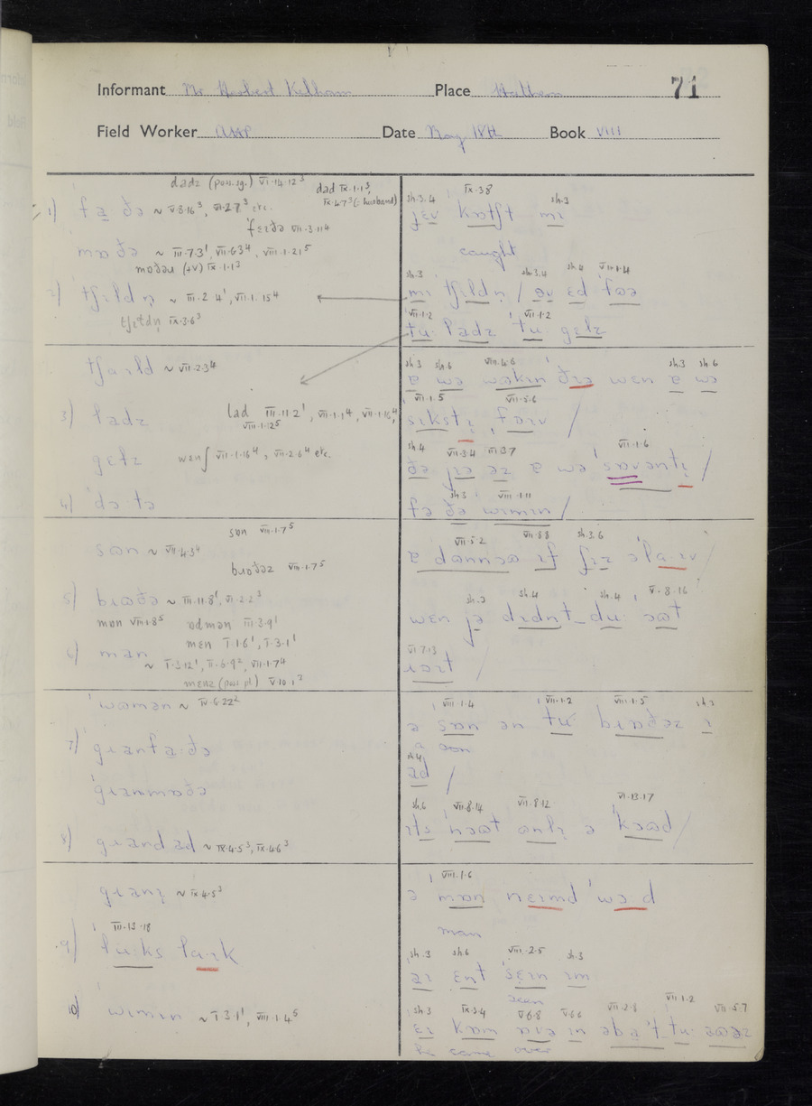 Response book recording the answers given by informants during the Survey of English Dialect. It includes 9 sections that cover a range of topics relating to work, domestic and social life. Answers are recorded in the International Phonetic Alphabet.