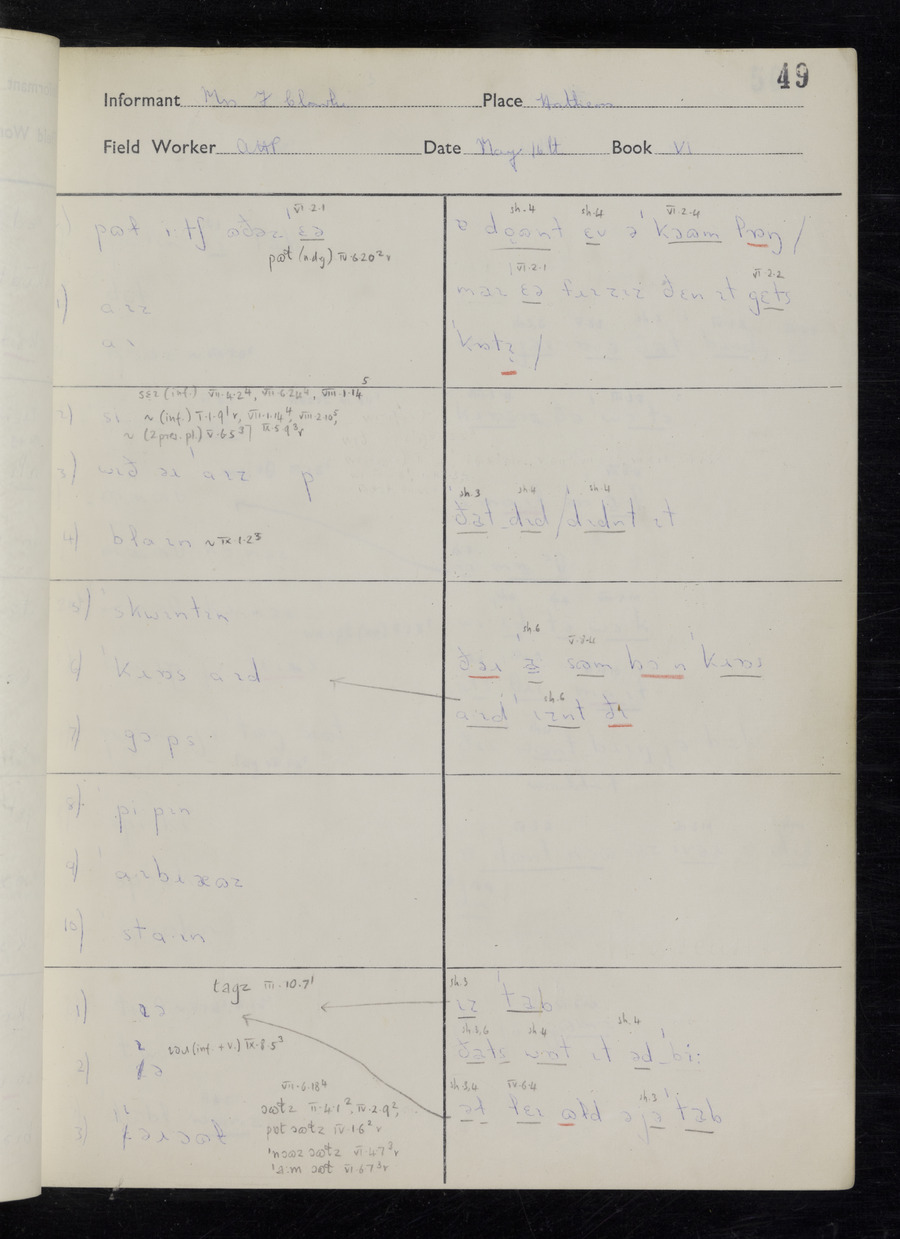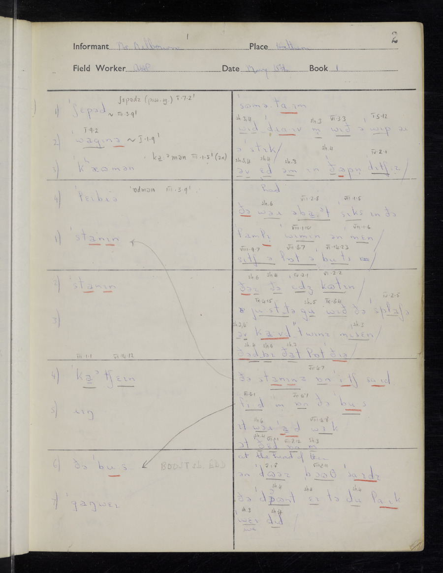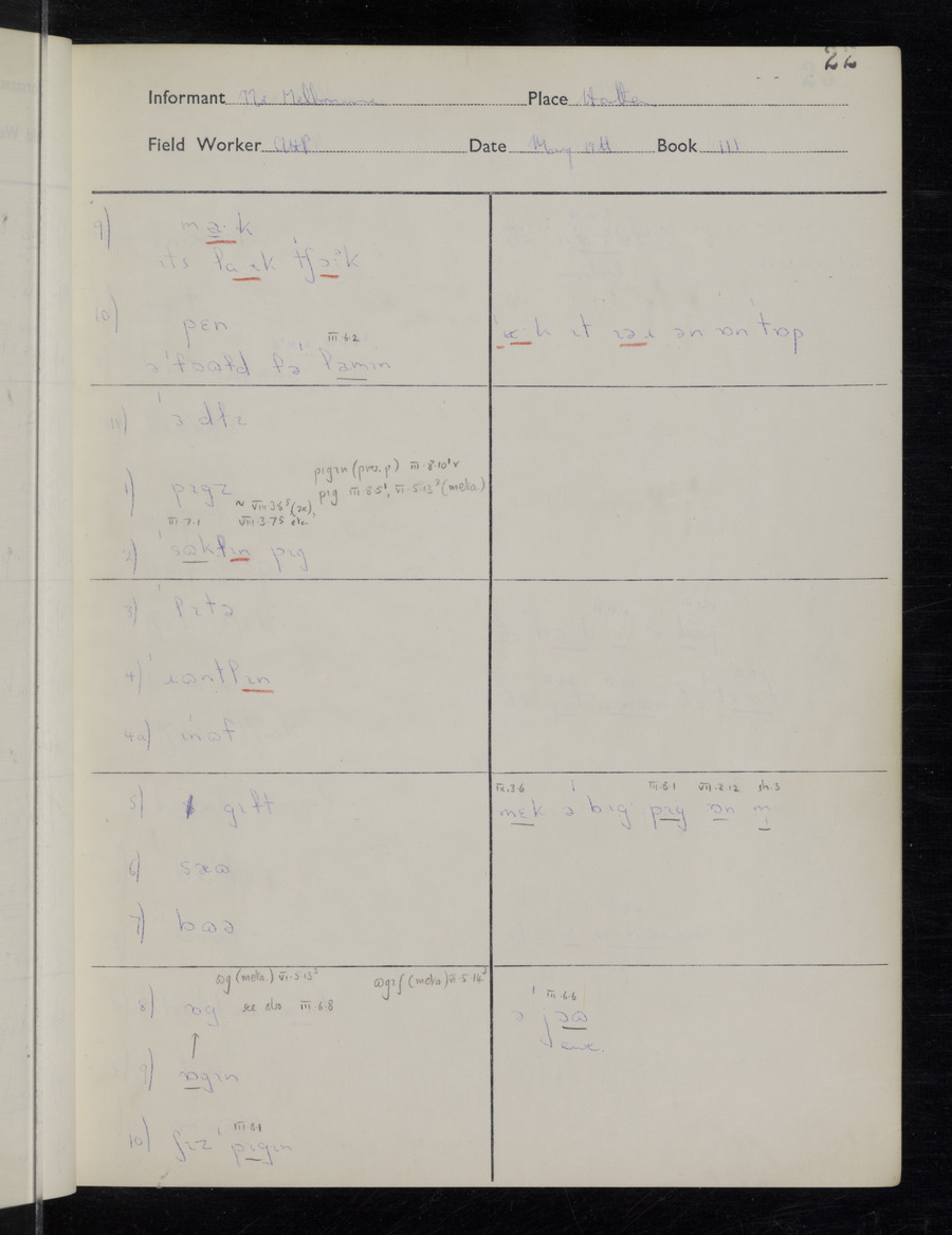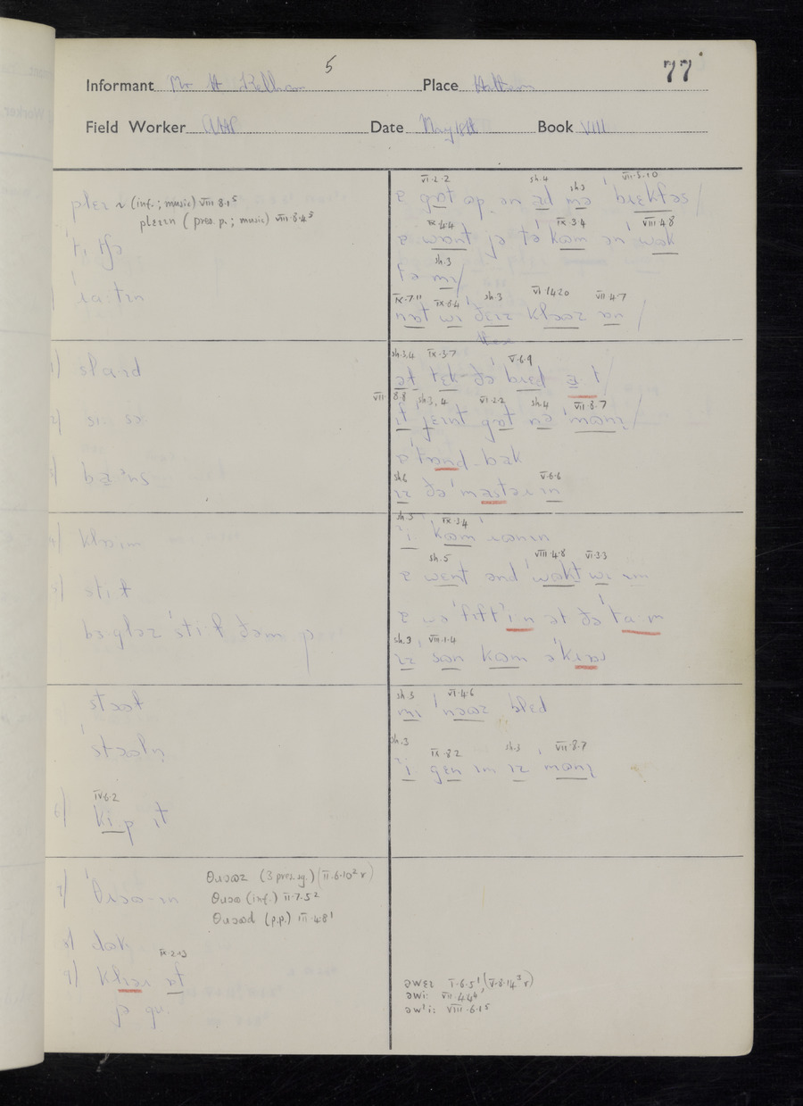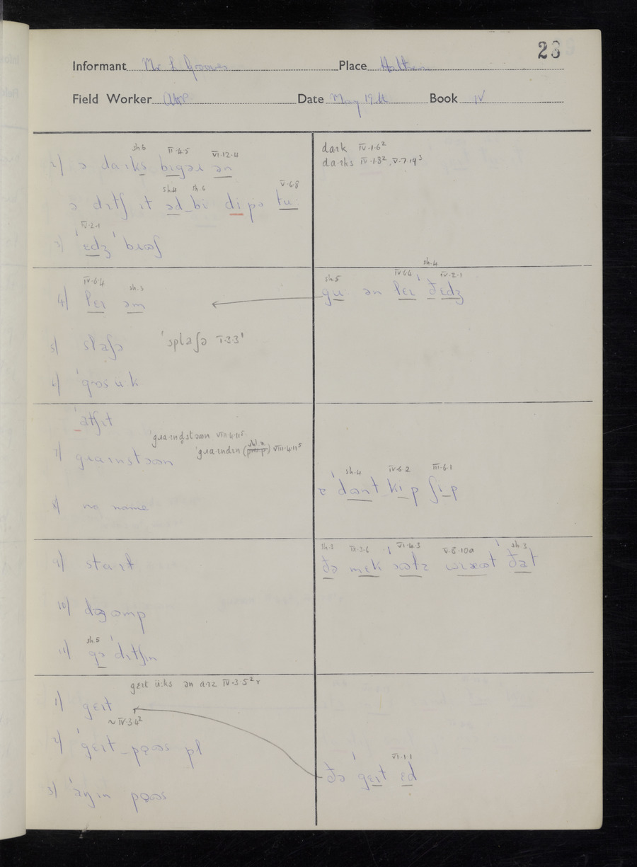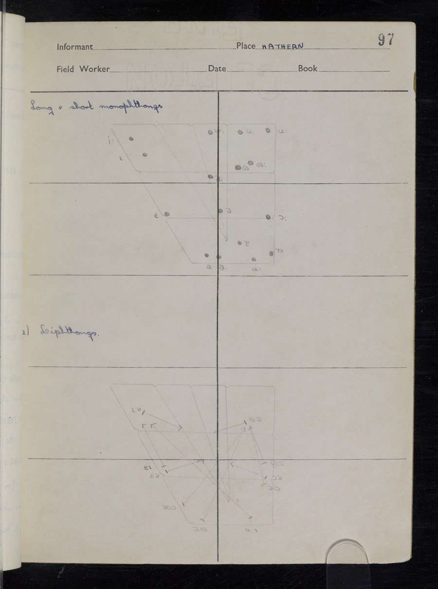 Response book recording the answers given by informants during the Survey of English Dialect. It includes 9 sections that cover a range of topics relating to work, domestic and social life. Answers are recorded in the International Phonetic Alphabet.