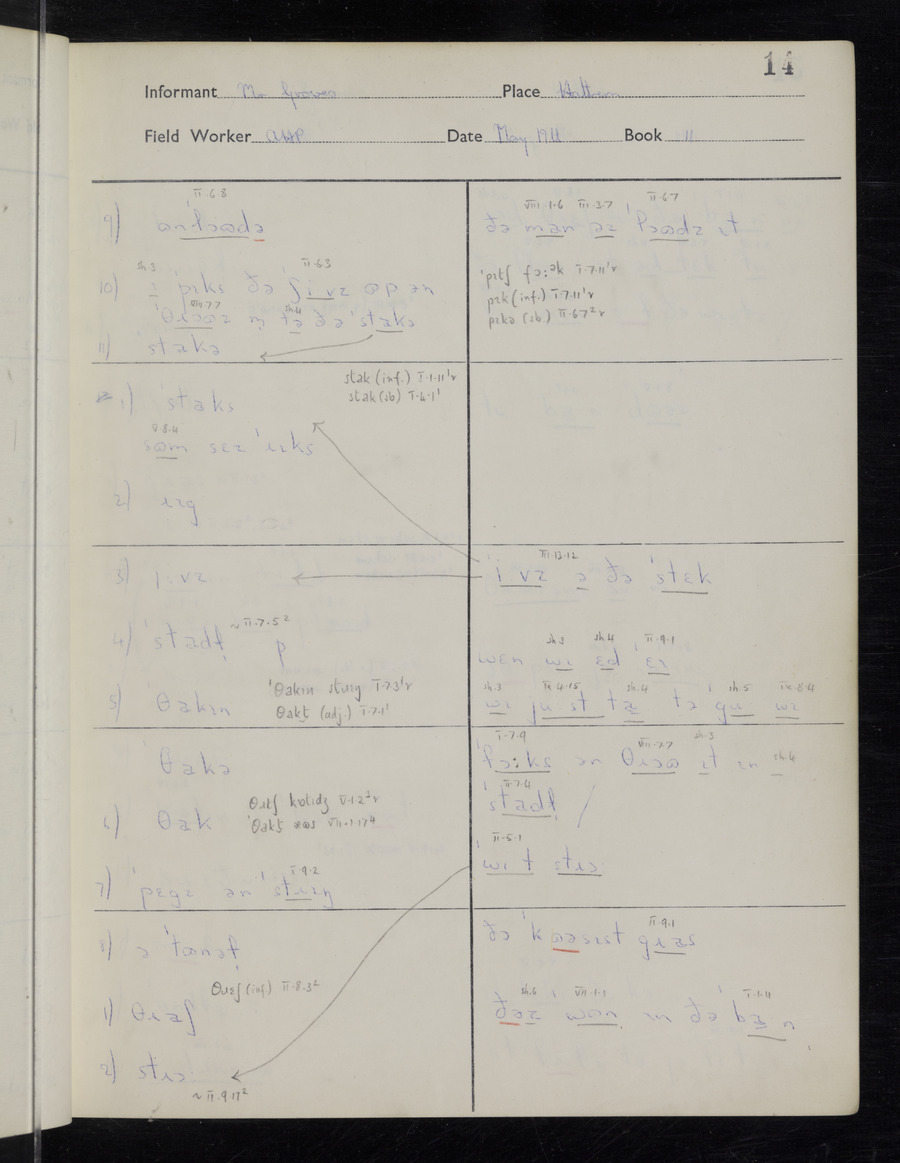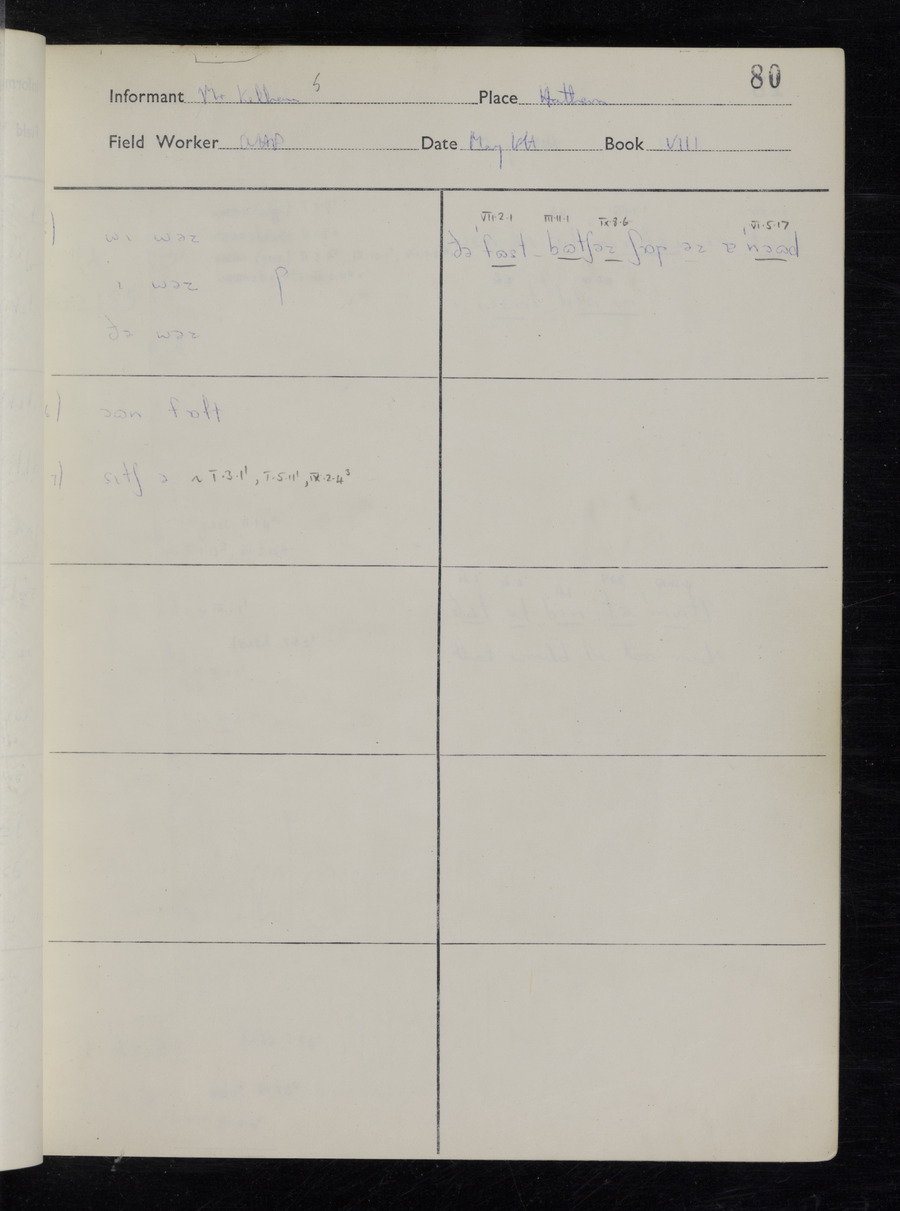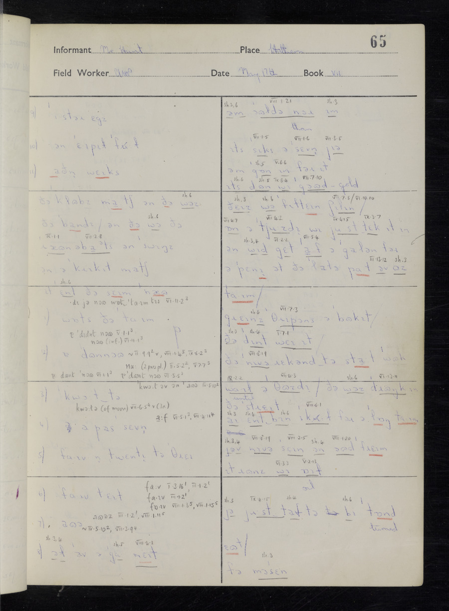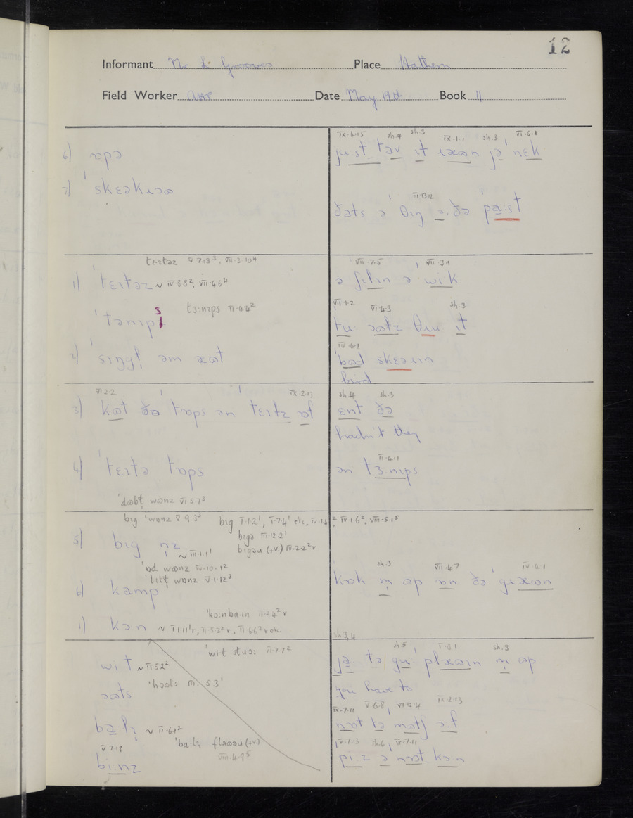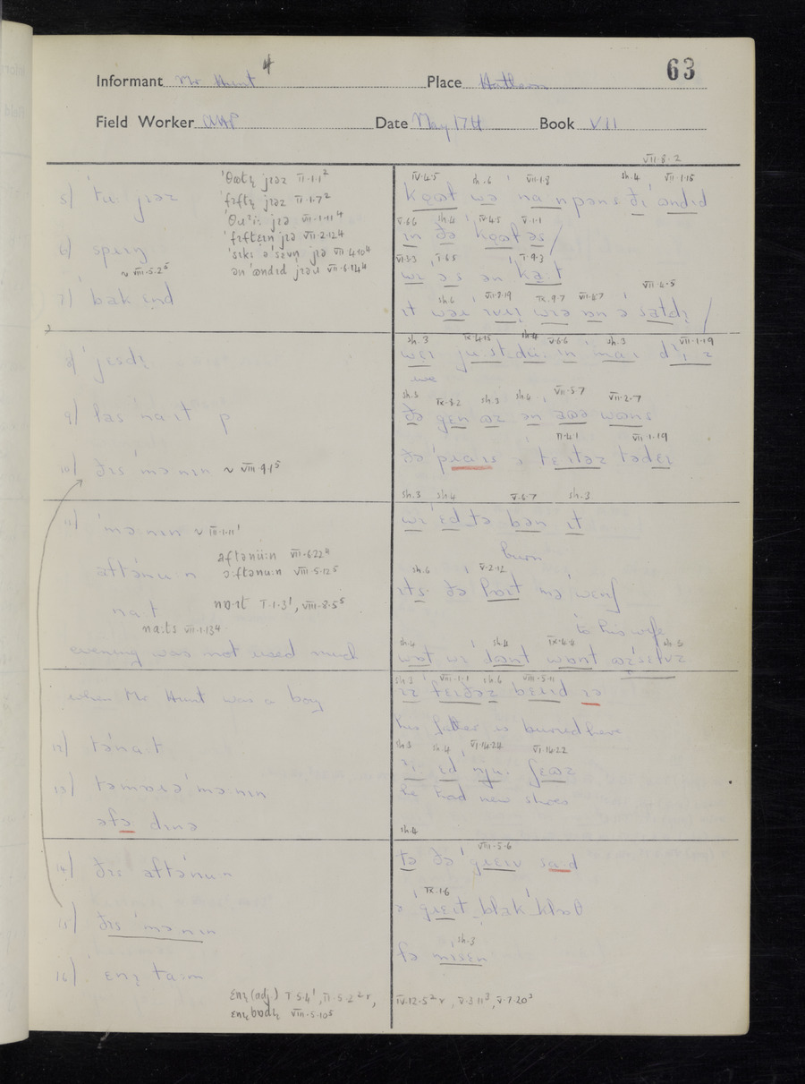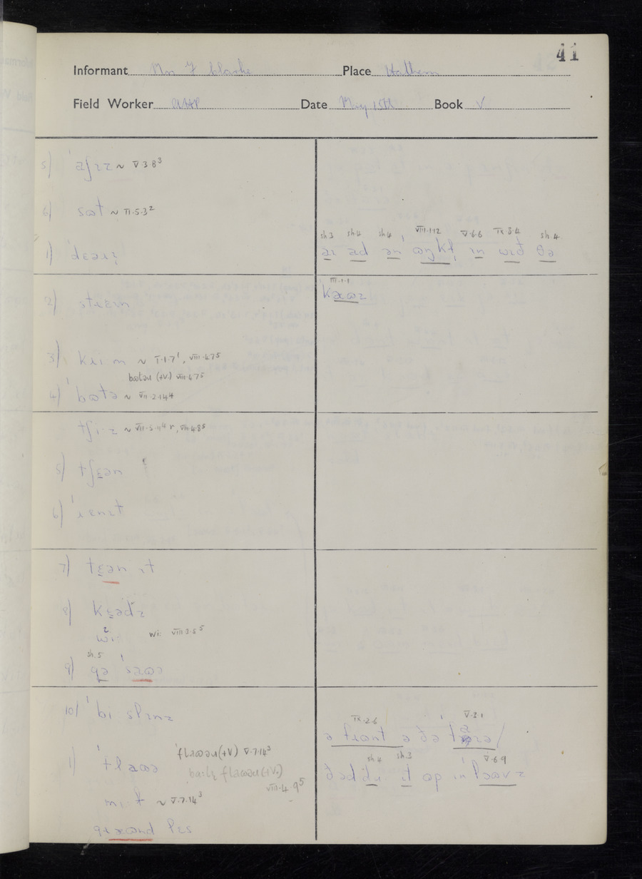 Response book recording the answers given by informants during the Survey of English Dialect. It includes 9 sections that cover a range of topics relating to work, domestic and social life. Answers are recorded in the International Phonetic Alphabet.