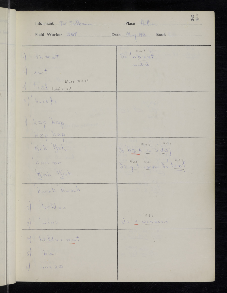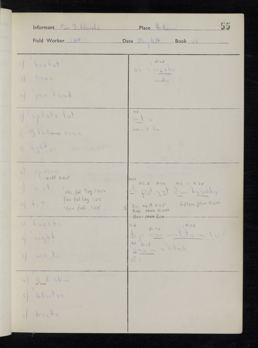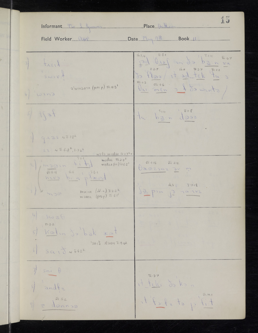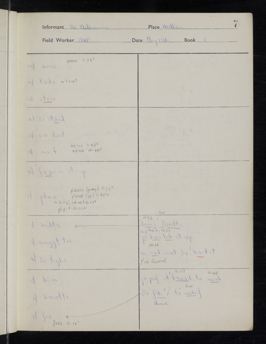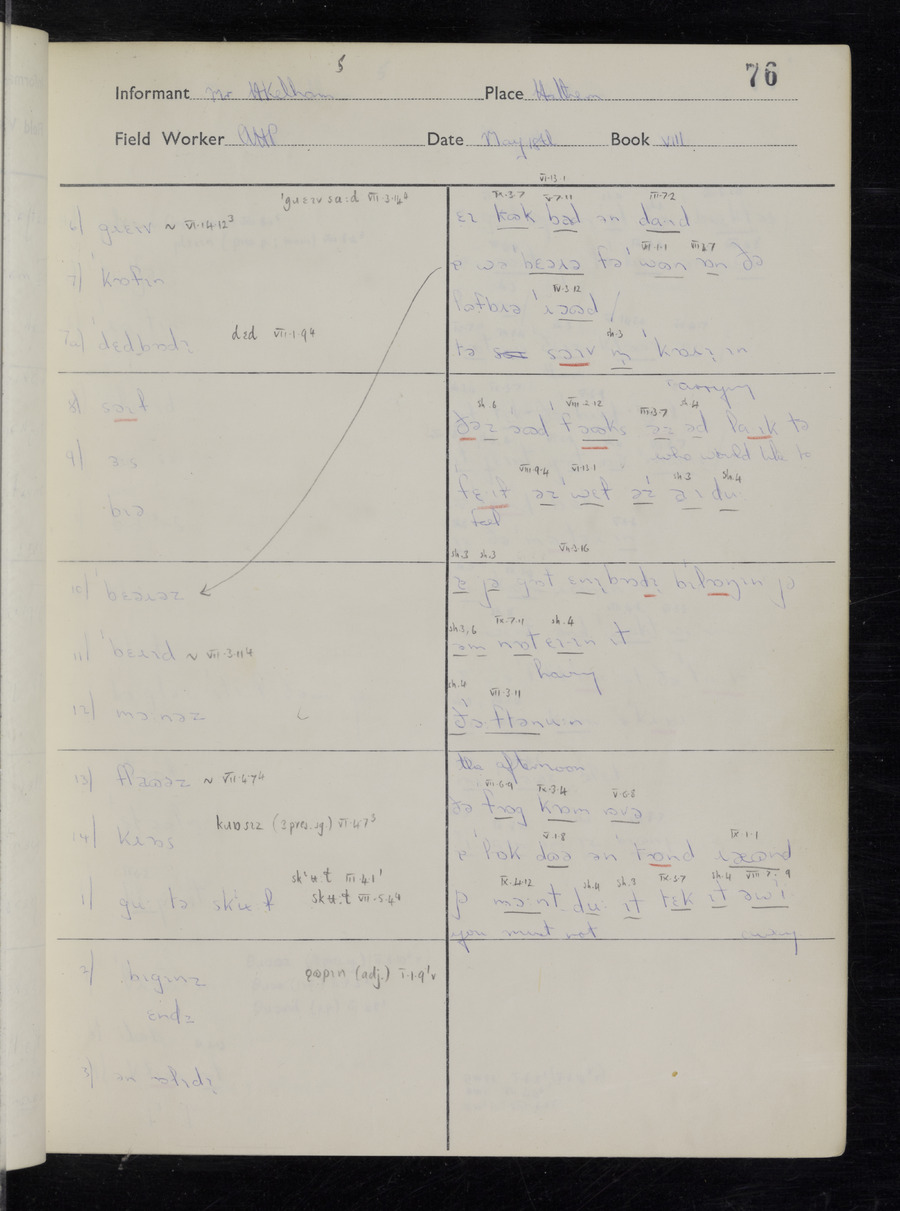 Response book recording the answers given by informants during the Survey of English Dialect. It includes 9 sections that cover a range of topics relating to work, domestic and social life. Answers are recorded in the International Phonetic Alphabet.