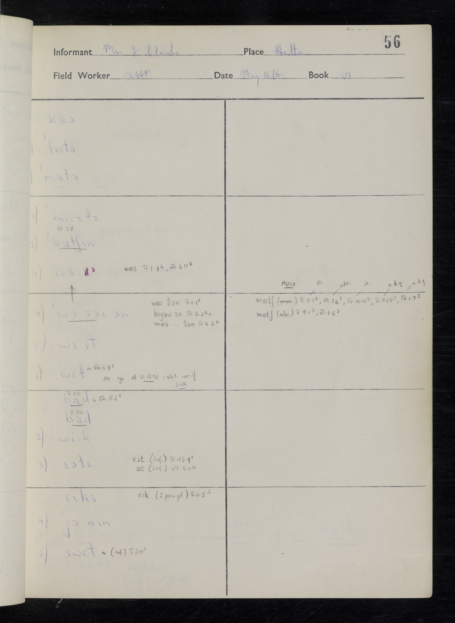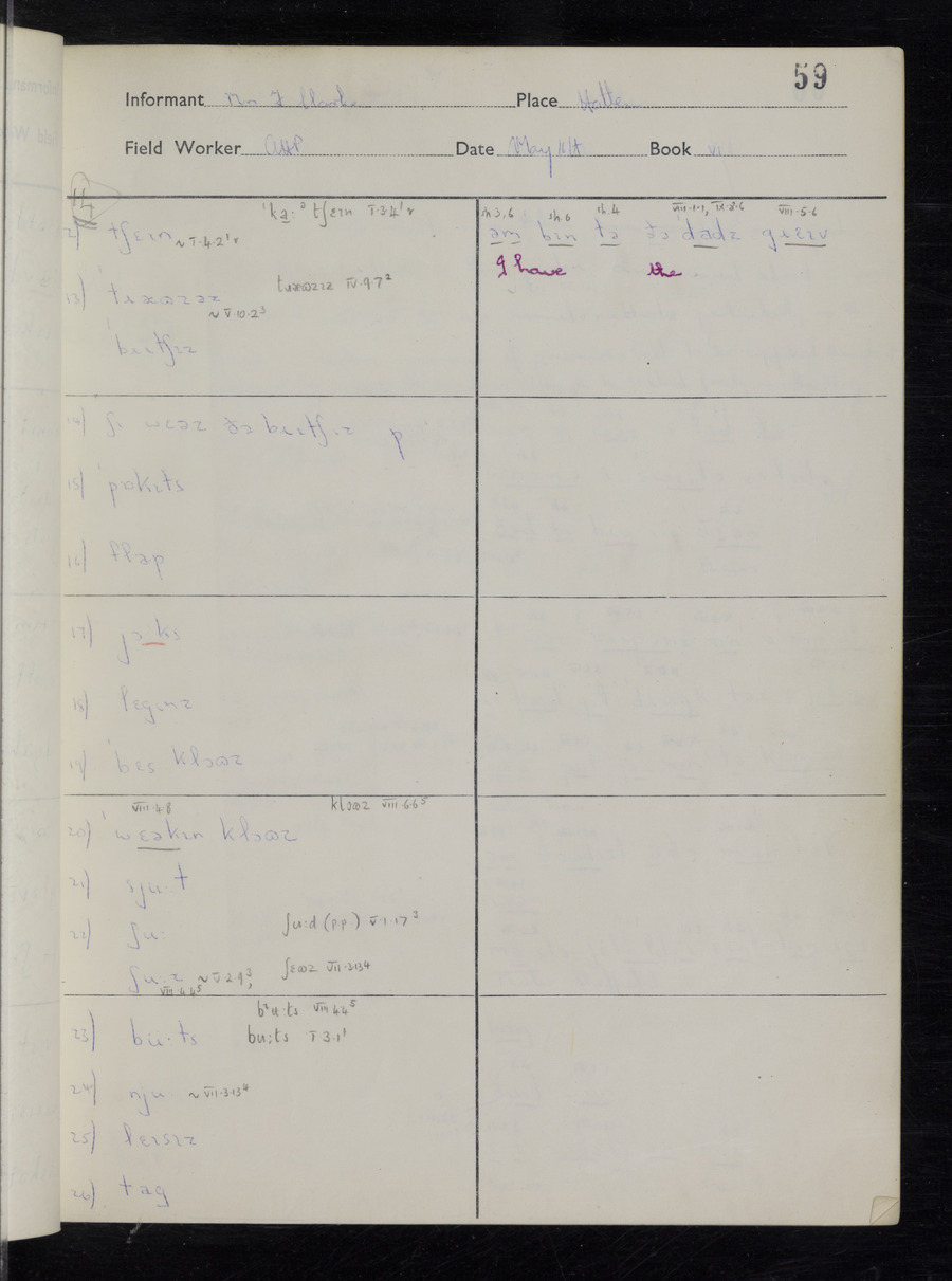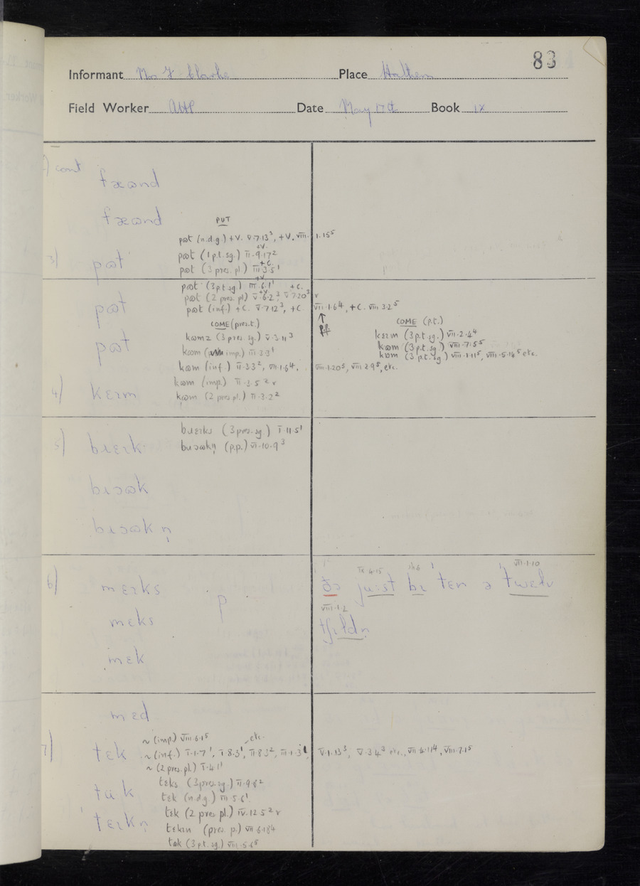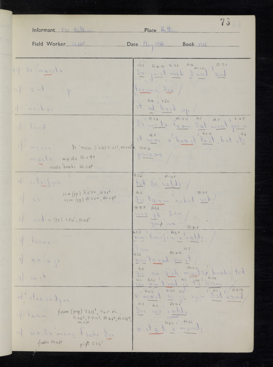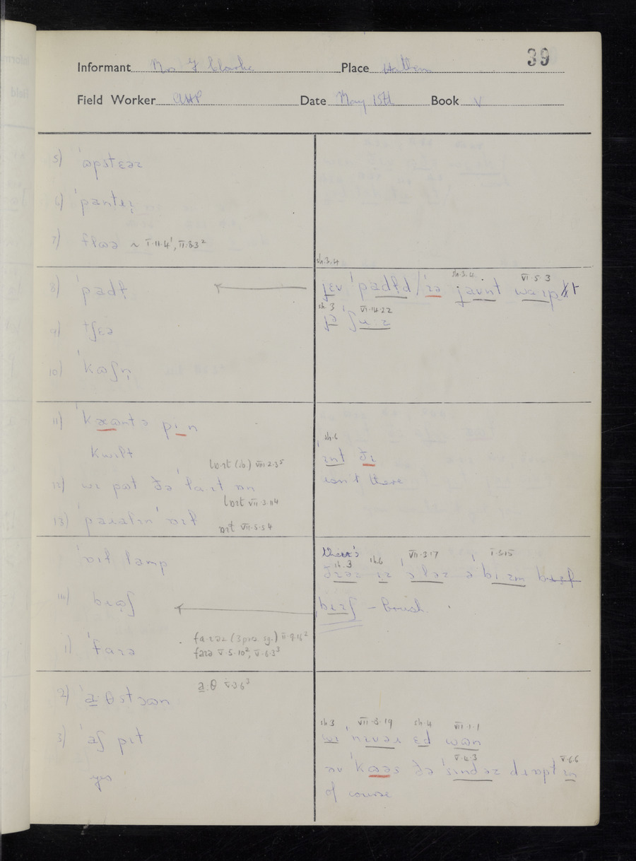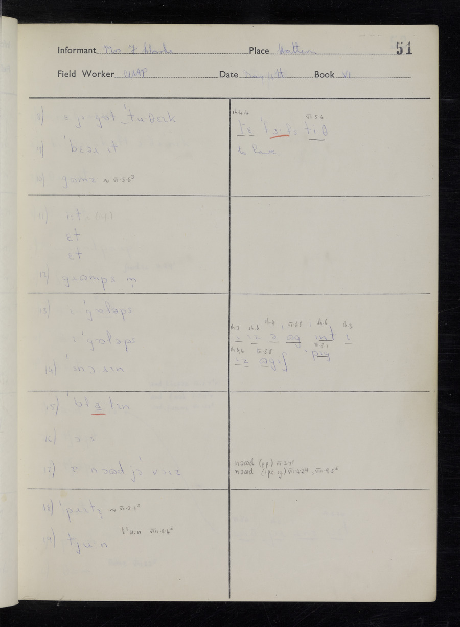 Response book recording the answers given by informants during the Survey of English Dialect. It includes 9 sections that cover a range of topics relating to work, domestic and social life. Answers are recorded in the International Phonetic Alphabet.