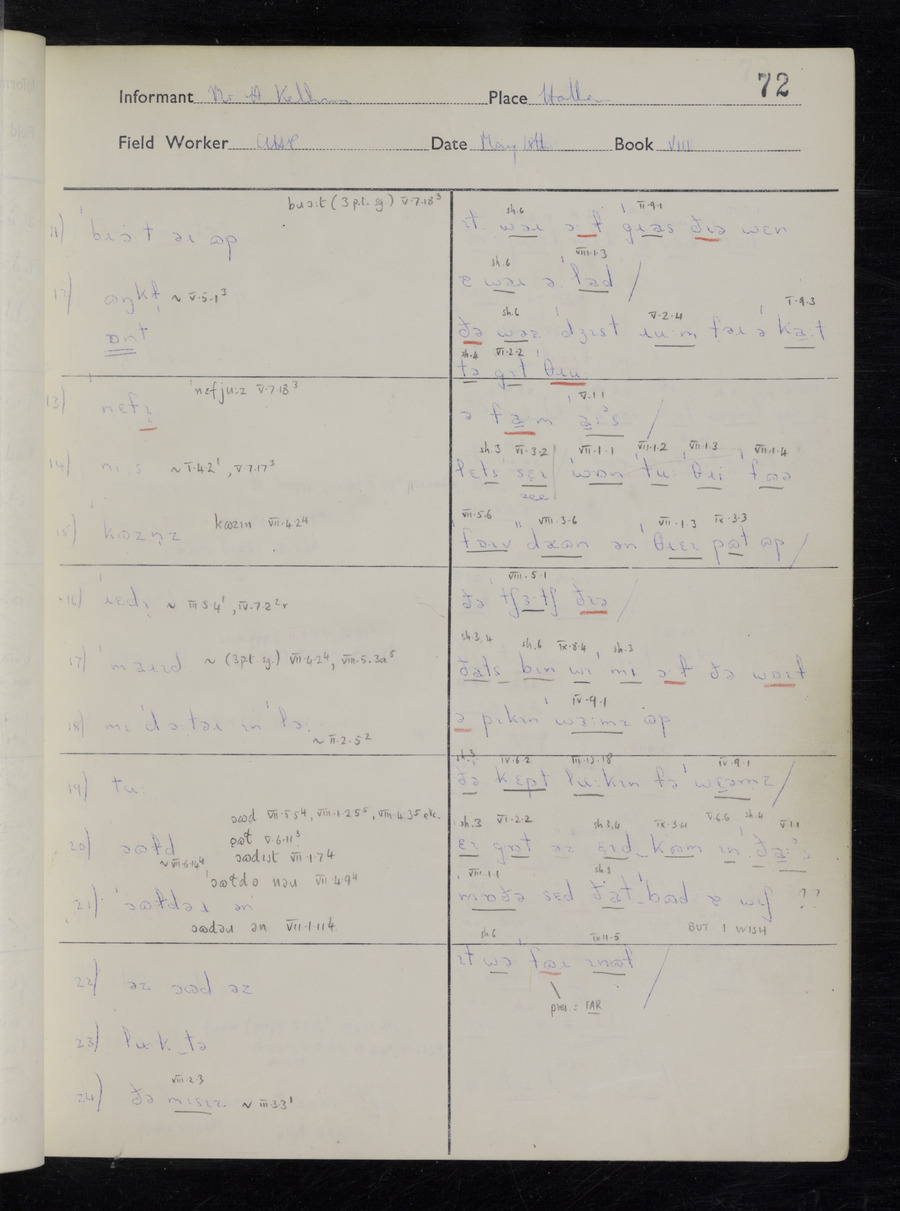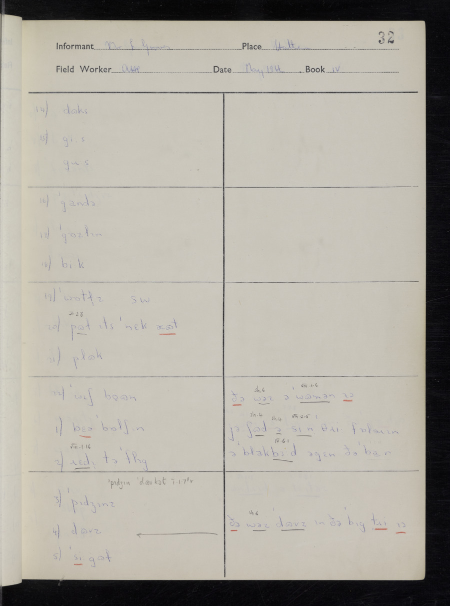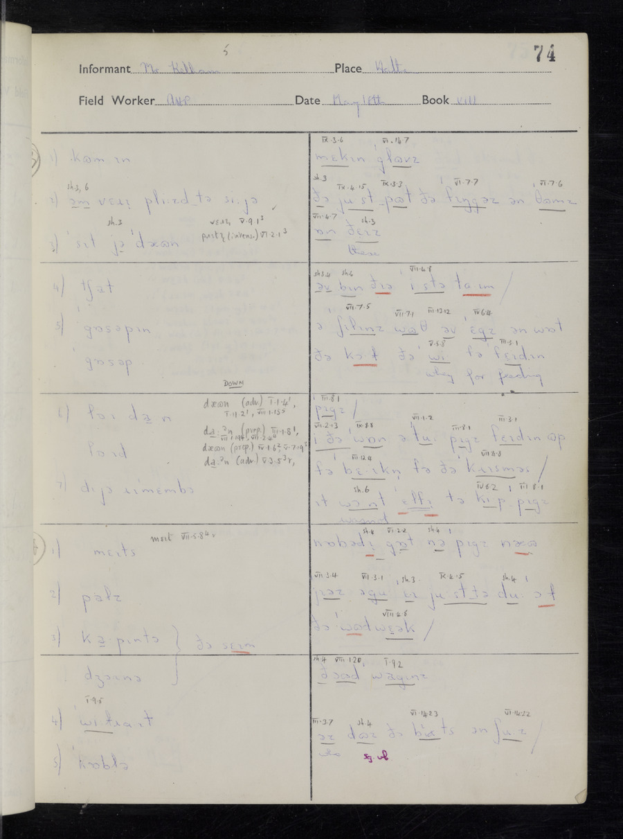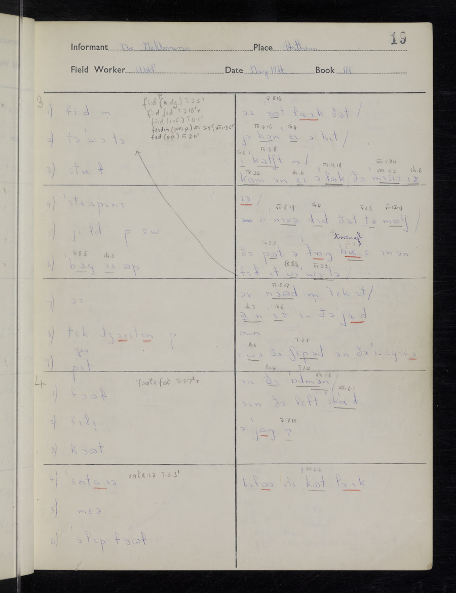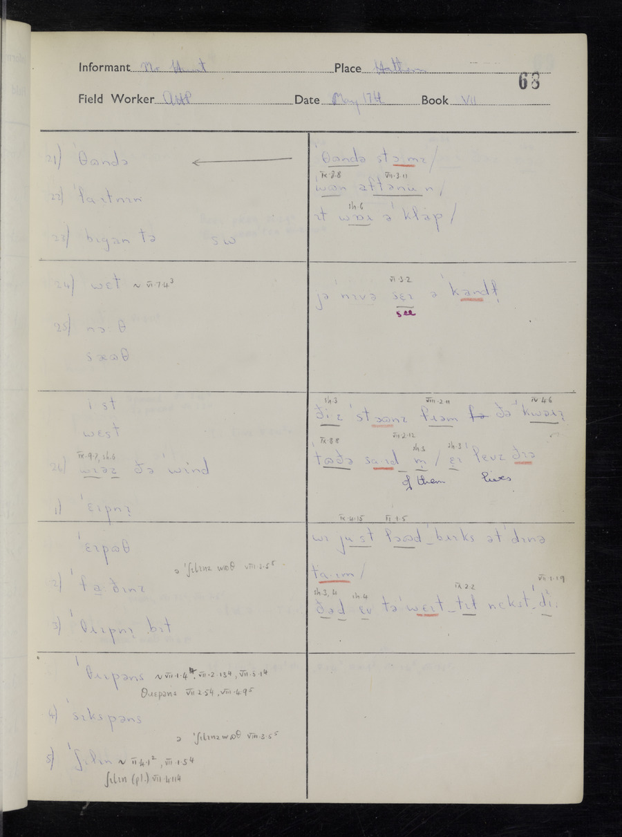 Response book recording the answers given by informants during the Survey of English Dialect. It includes 9 sections that cover a range of topics relating to work, domestic and social life. Answers are recorded in the International Phonetic Alphabet.