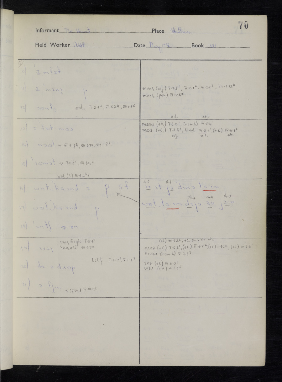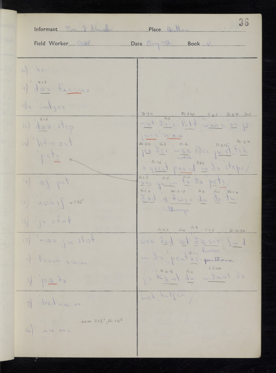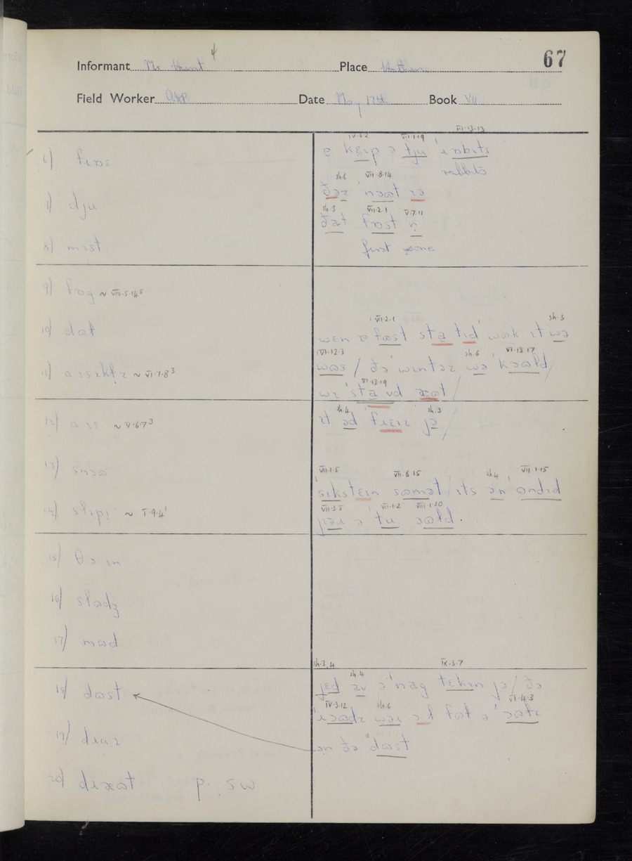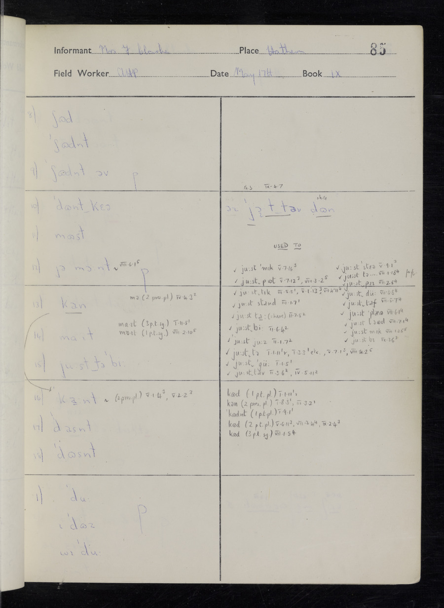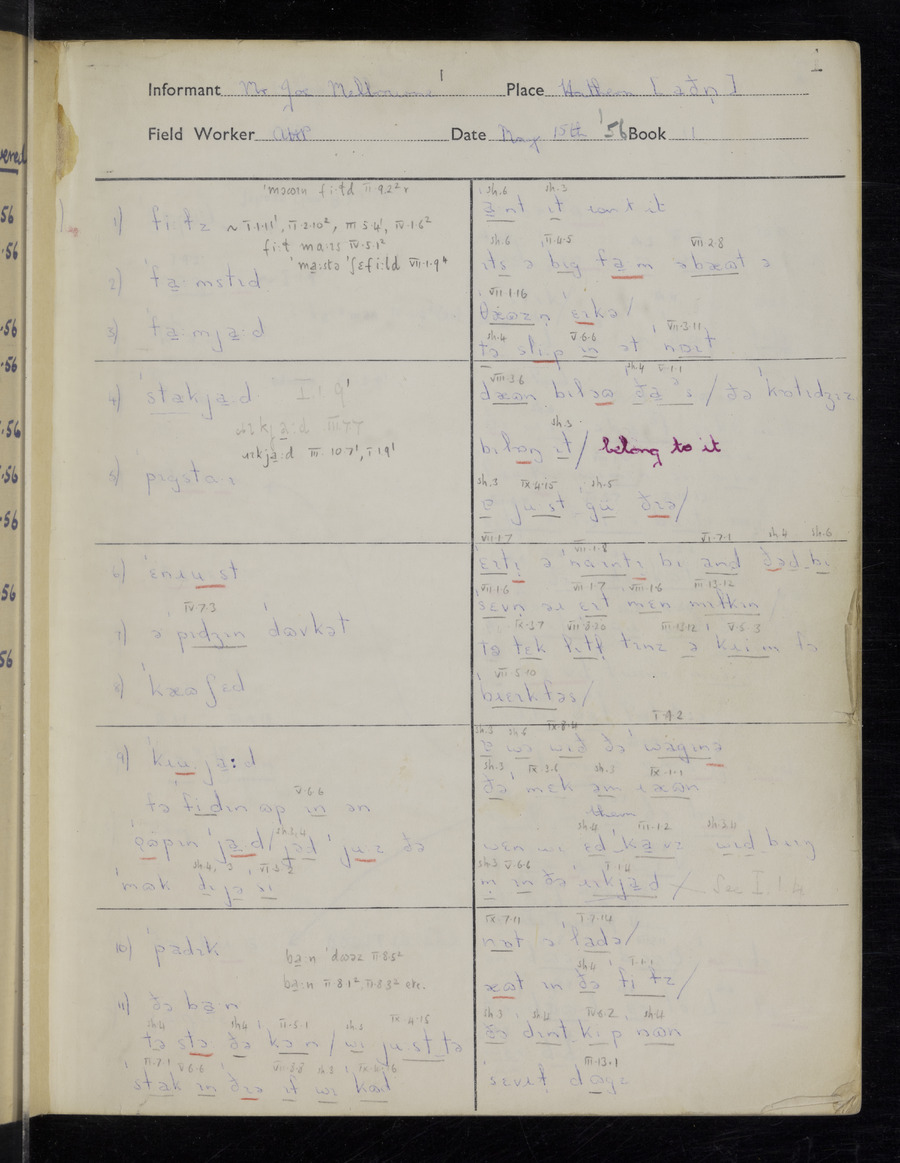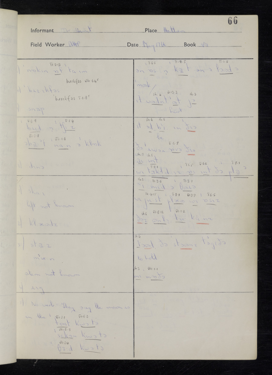 Response book recording the answers given by informants during the Survey of English Dialect. It includes 9 sections that cover a range of topics relating to work, domestic and social life. Answers are recorded in the International Phonetic Alphabet.