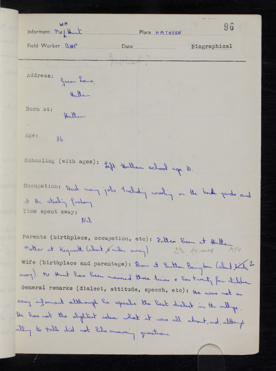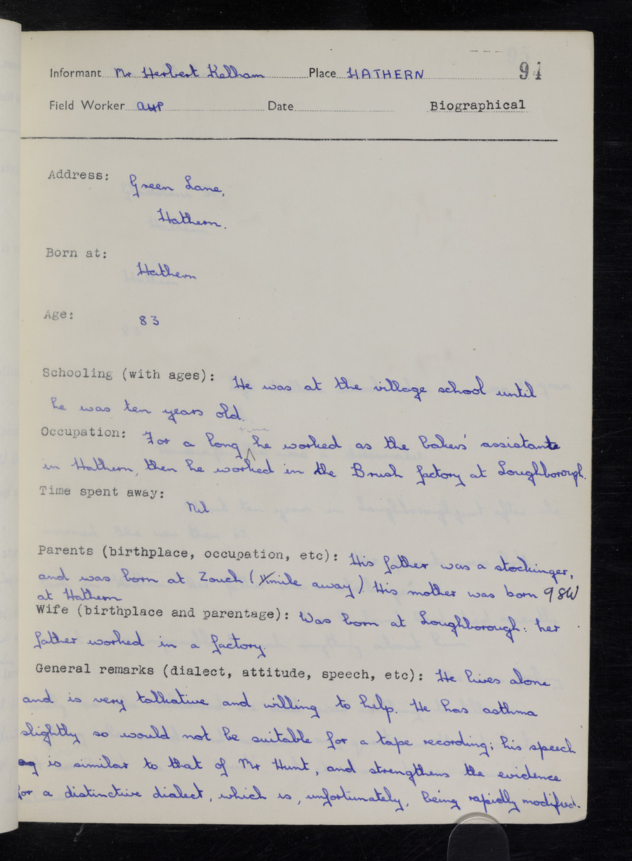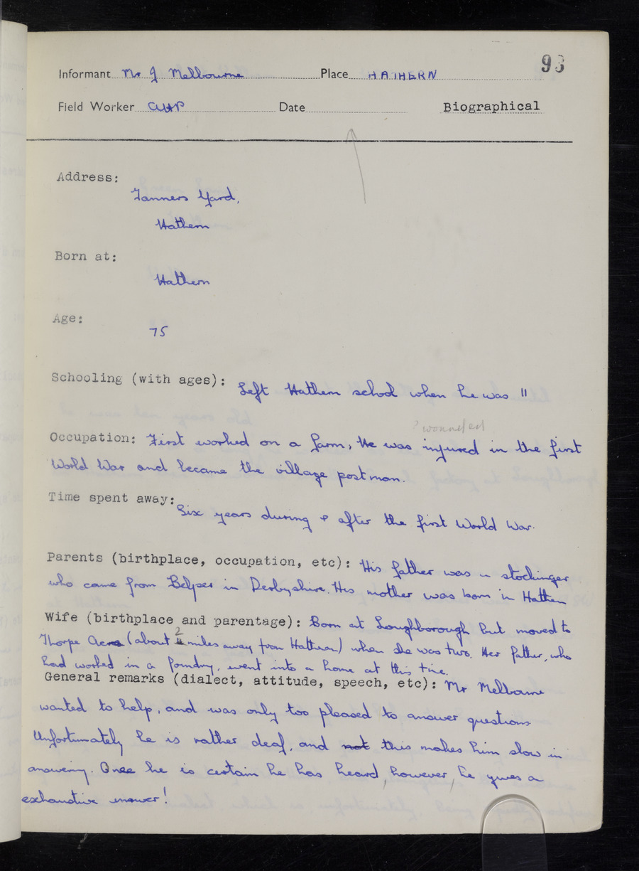 Interviews have been carried out by fieldworker Averil Playford. There are five informants for this response book - Mr J. Melbourne, Mr Laurie Groves, Mrs F. Clarke, Mr W. H. Hunt and Mr Herbert Kelham. Their responses can be found in the following books: Mr J. Melbourne - I, III Laurie Groves - II, IV Mrs F. Clarke - V, VI, IX Mr W. H. Hunt - VII Herbert Kelham - VIII