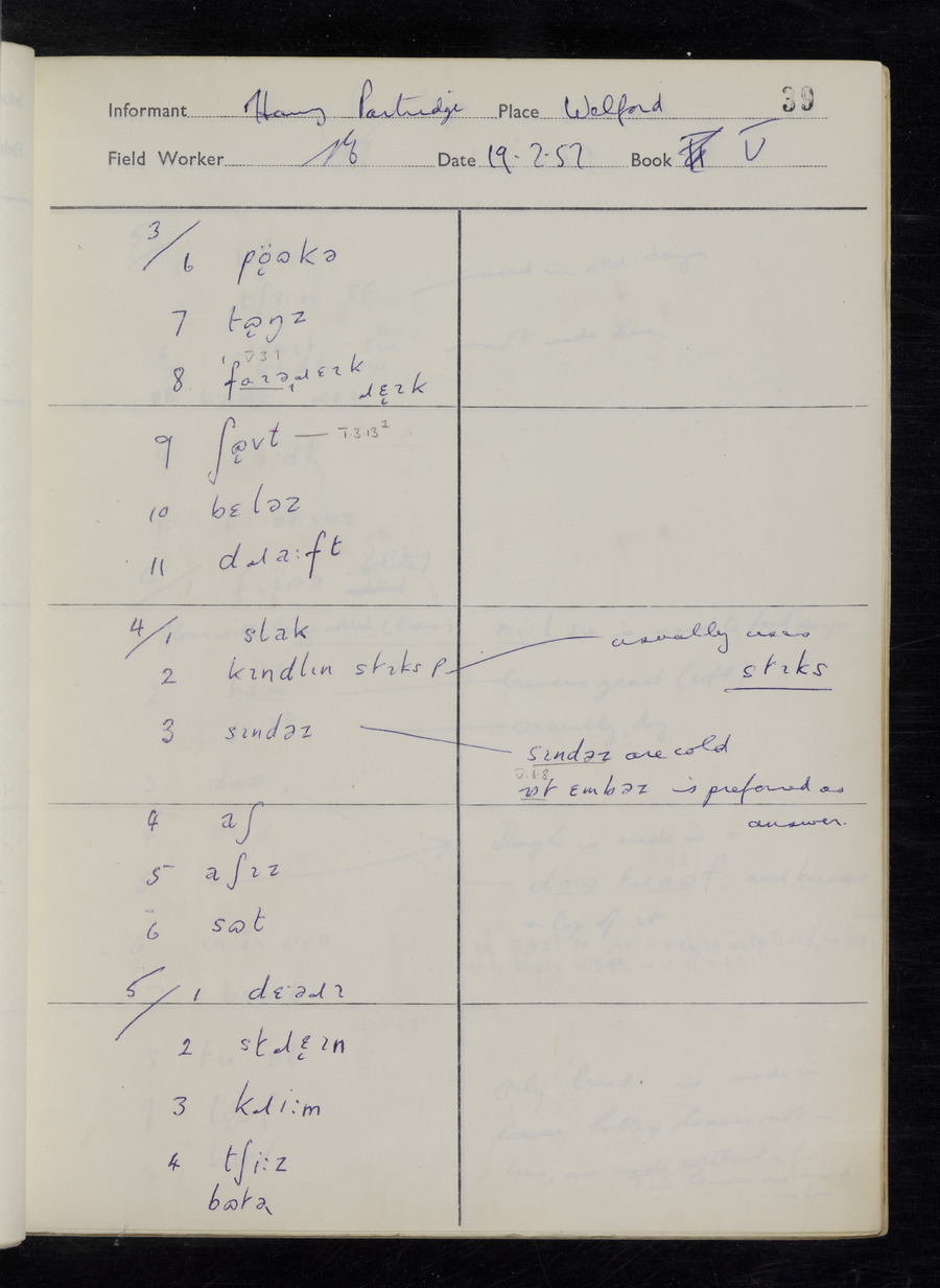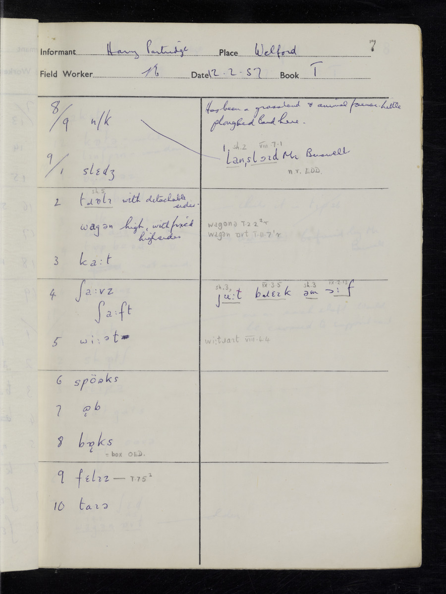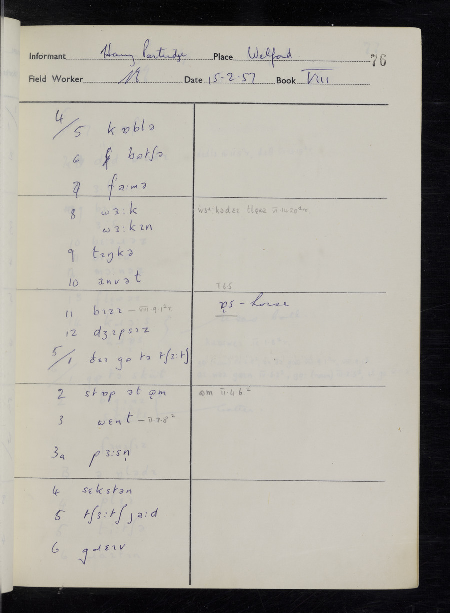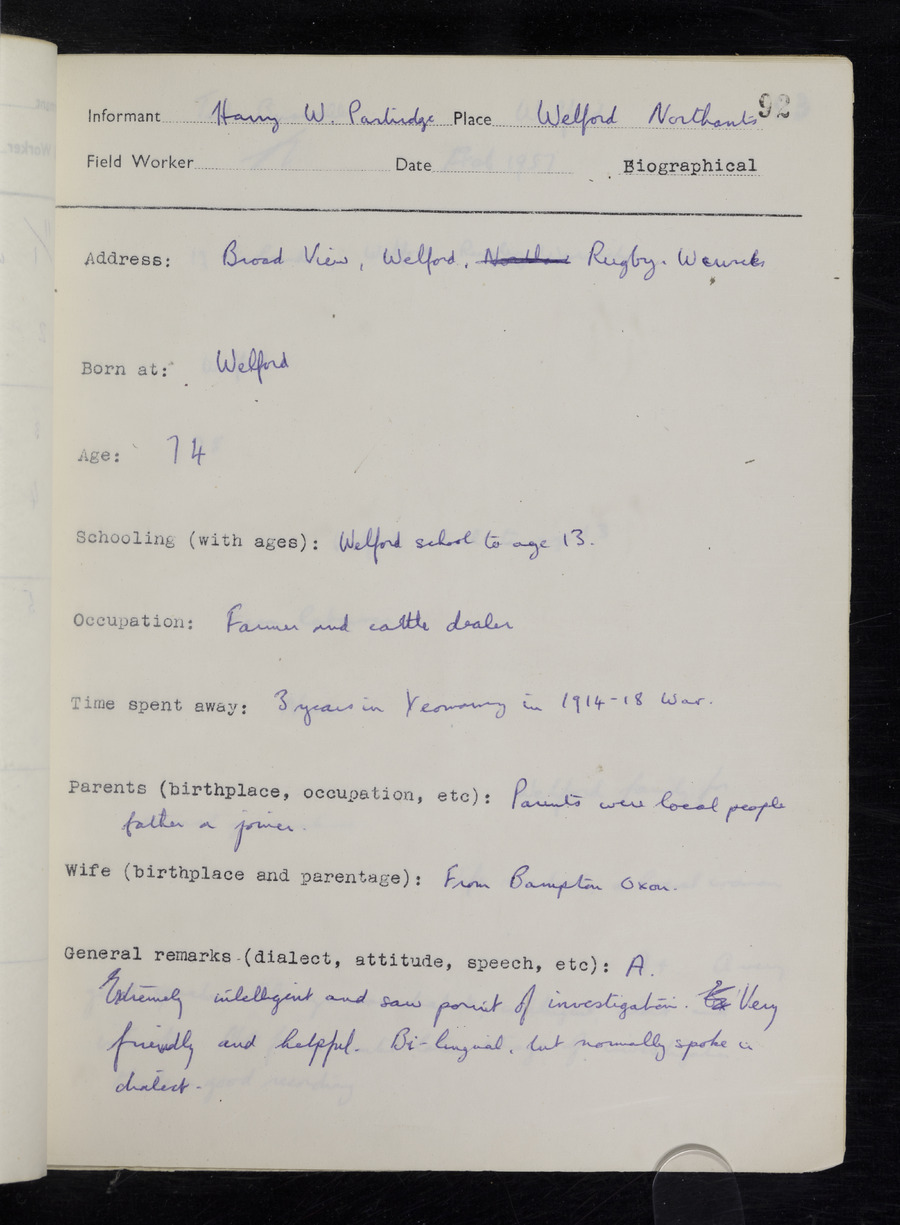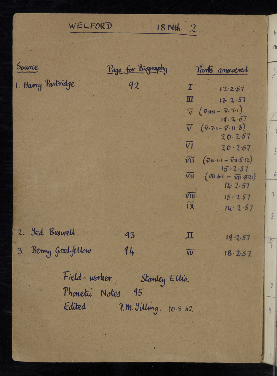 Interviews have been carried out by fieldworker Stanley Ellis. There are three informants for this response book - Harry Partridge, Ted Busurell and Benny Goodfellow. Their responses can be found in the following books: Harry Partridge - I, III, V, VI, VII, VIII, IX Ted Buswell - II Benny Goodfellow - IV