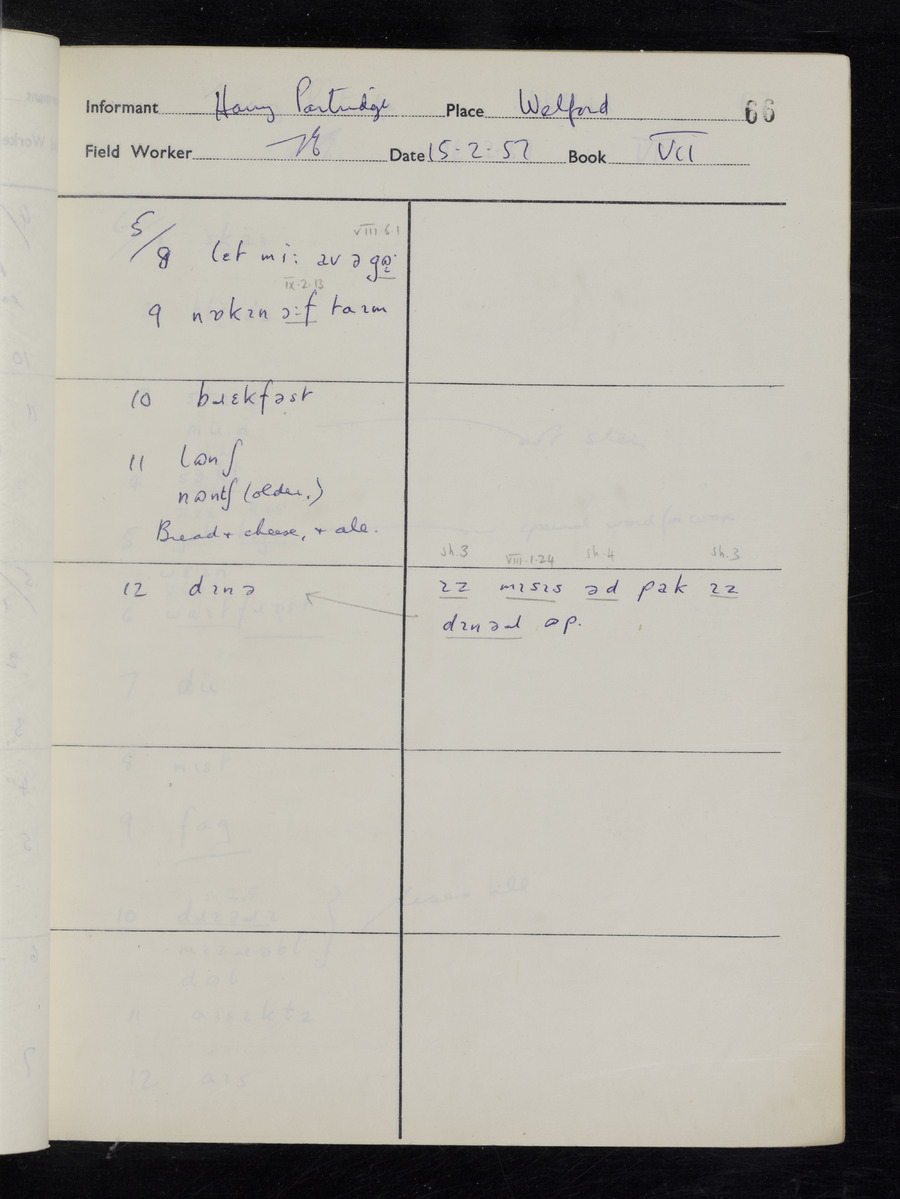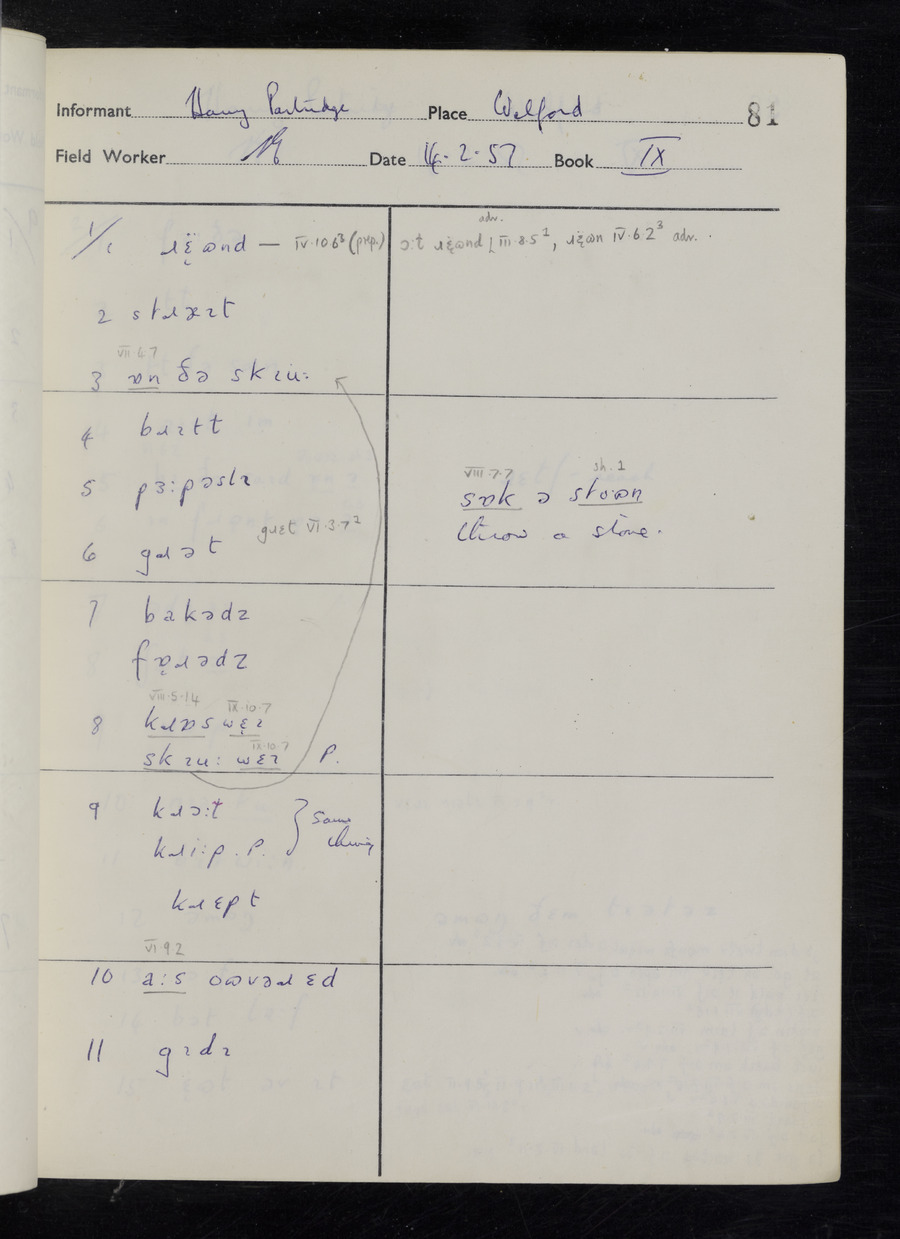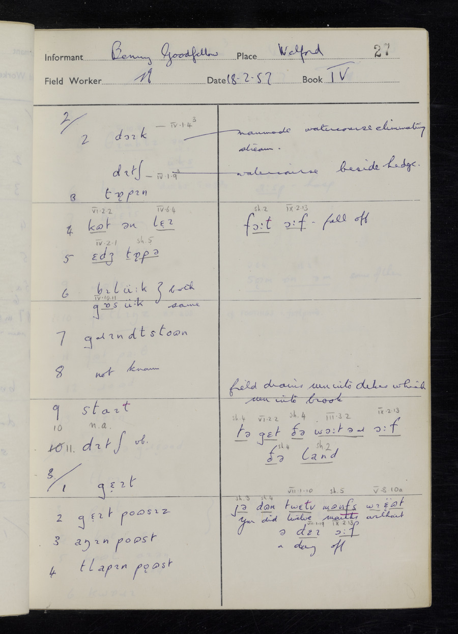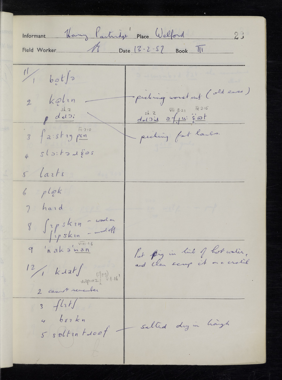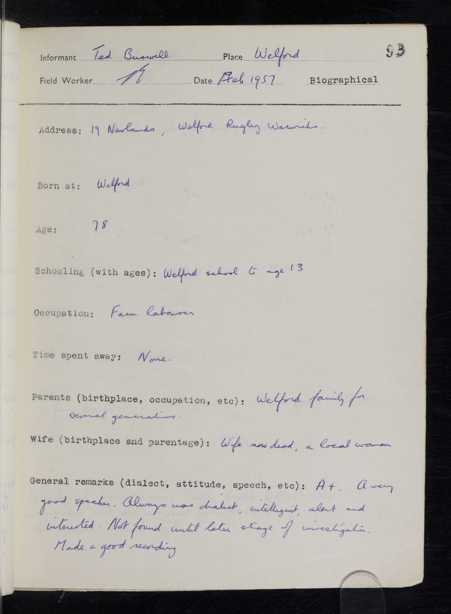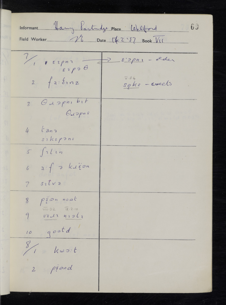 Interviews have been carried out by fieldworker Stanley Ellis. There are three informants for this response book - Harry Partridge, Ted Busurell and Benny Goodfellow. Their responses can be found in the following books: Harry Partridge - I, III, V, VI, VII, VIII, IX Ted Buswell - II Benny Goodfellow - IV