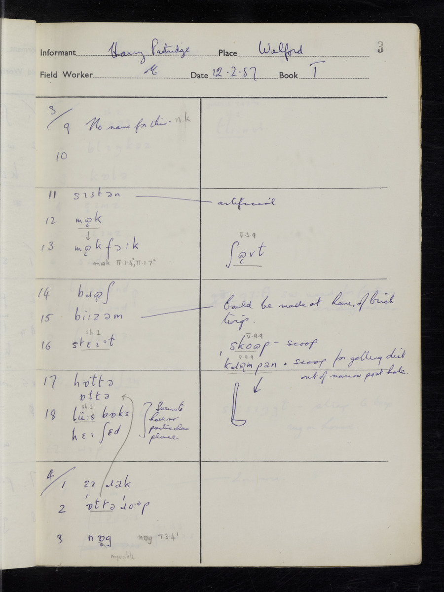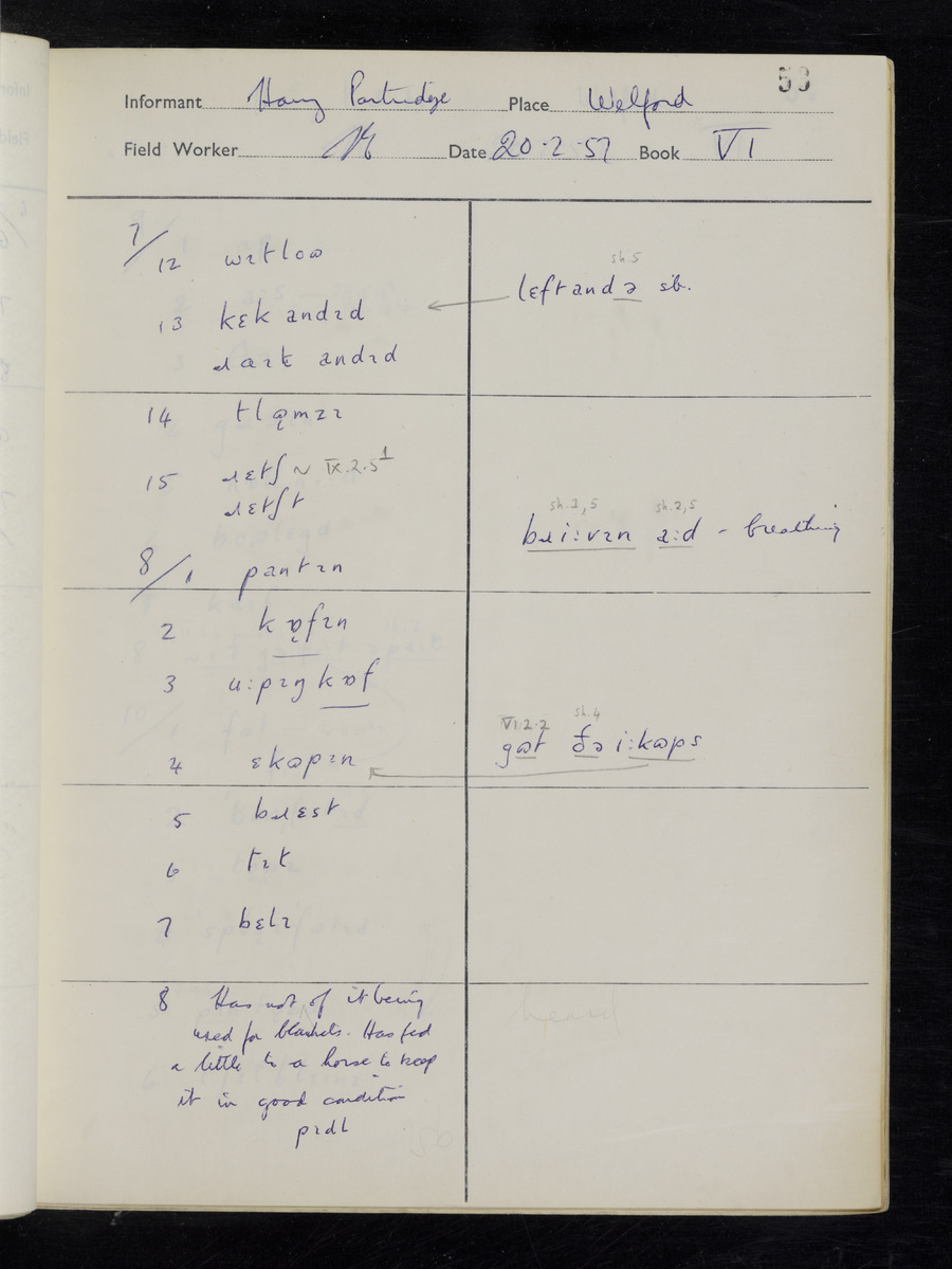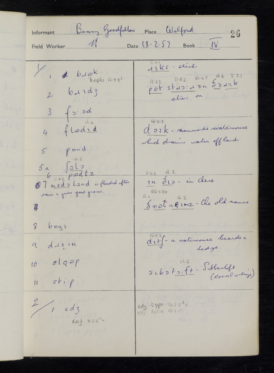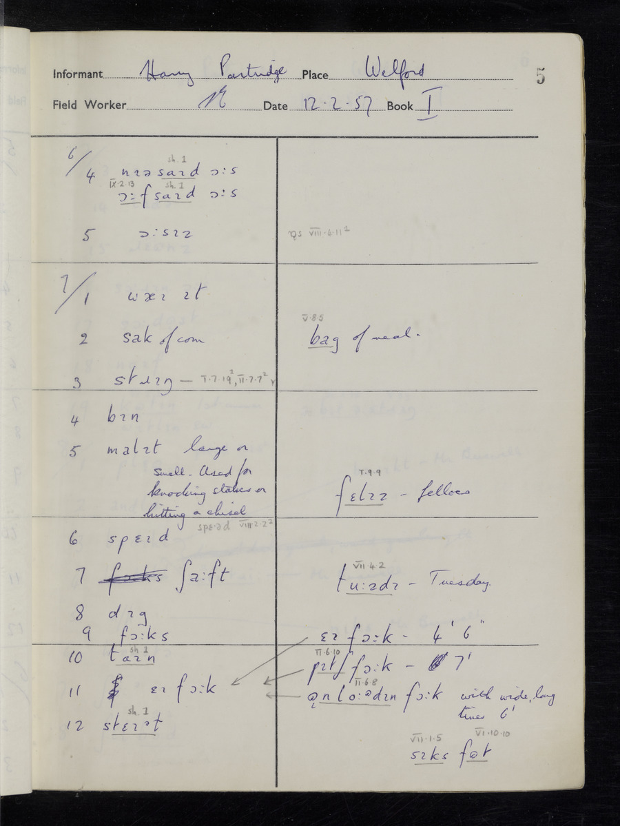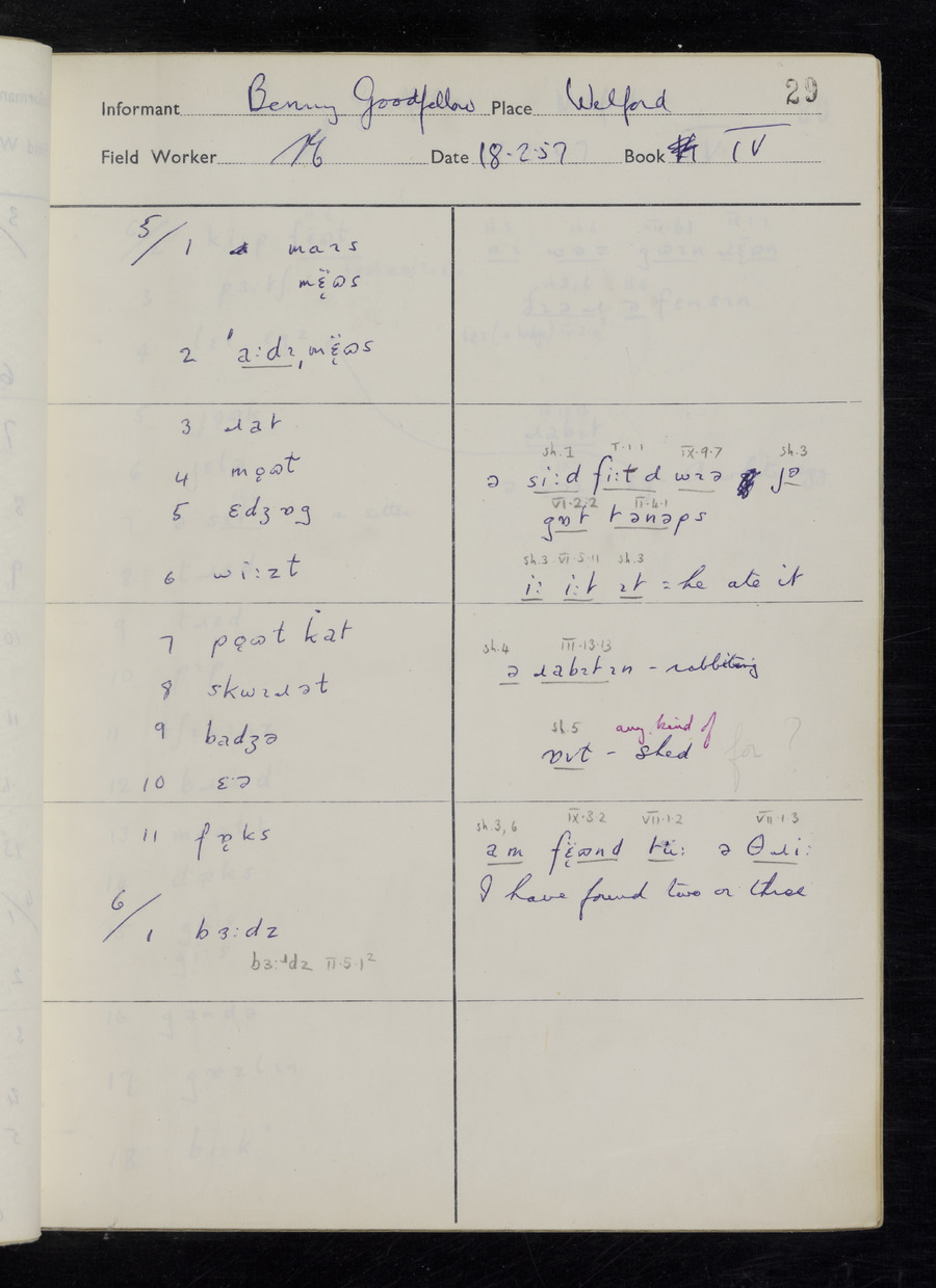 Interviews have been carried out by fieldworker Stanley Ellis. There are three informants for this response book - Harry Partridge, Ted Busurell and Benny Goodfellow. Their responses can be found in the following books: Harry Partridge - I, III, V, VI, VII, VIII, IX Ted Buswell - II Benny Goodfellow - IV