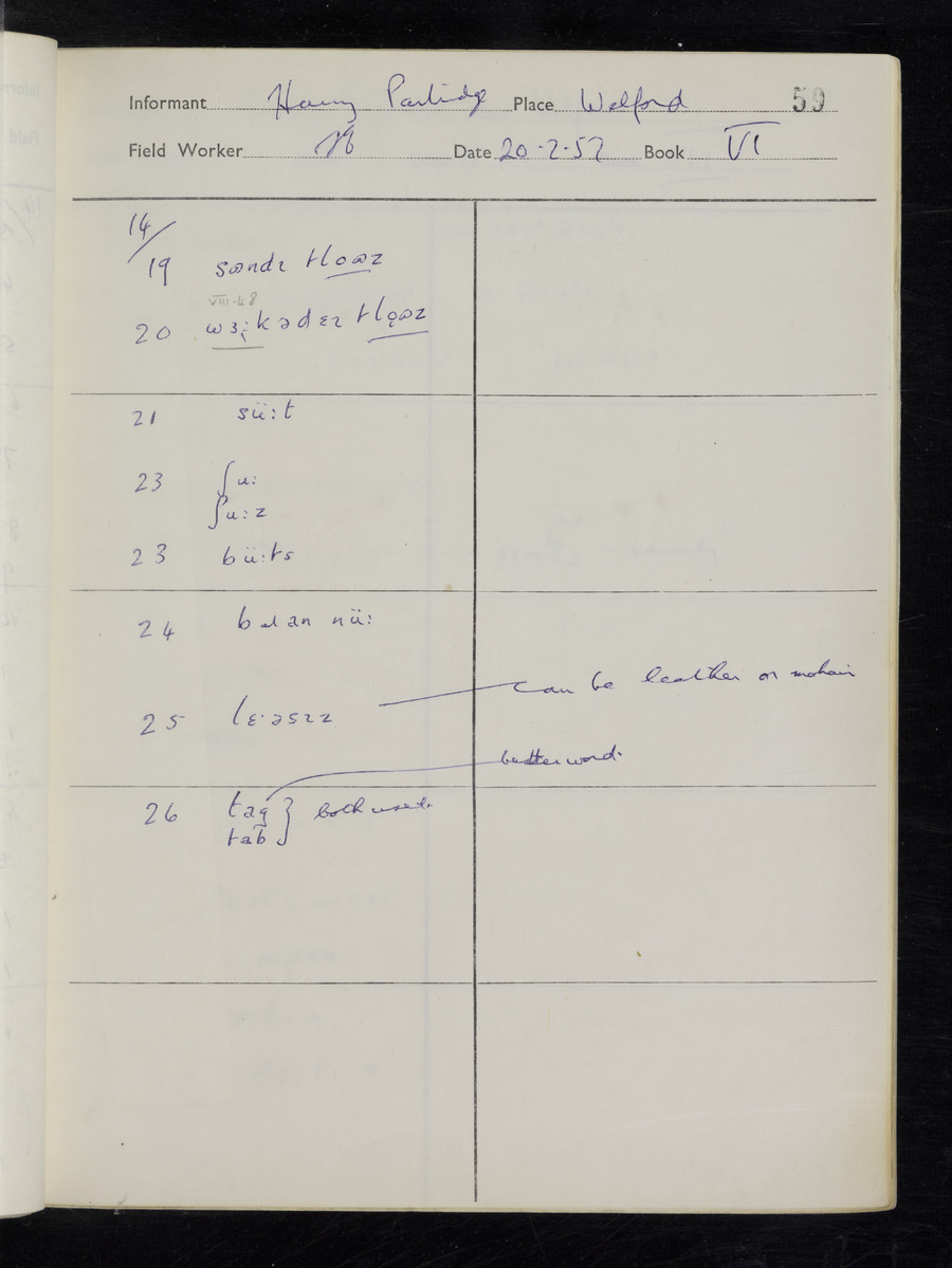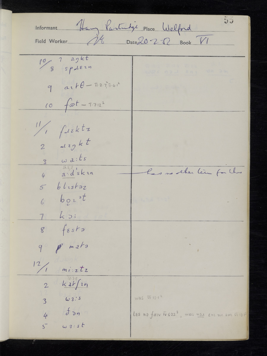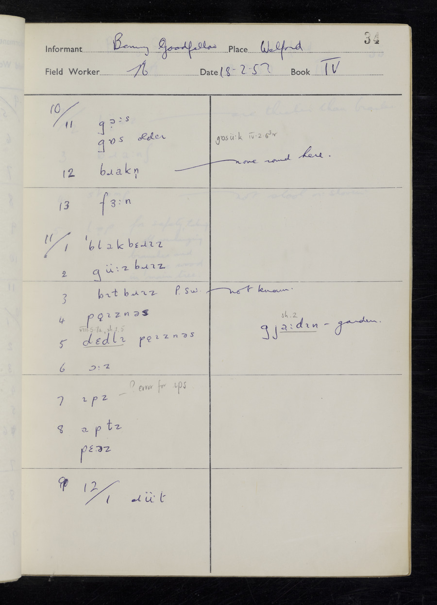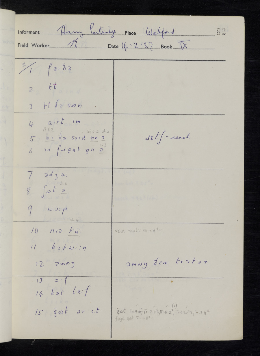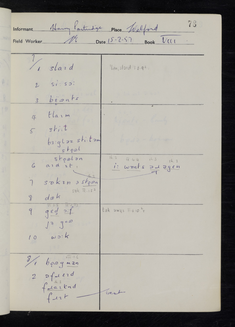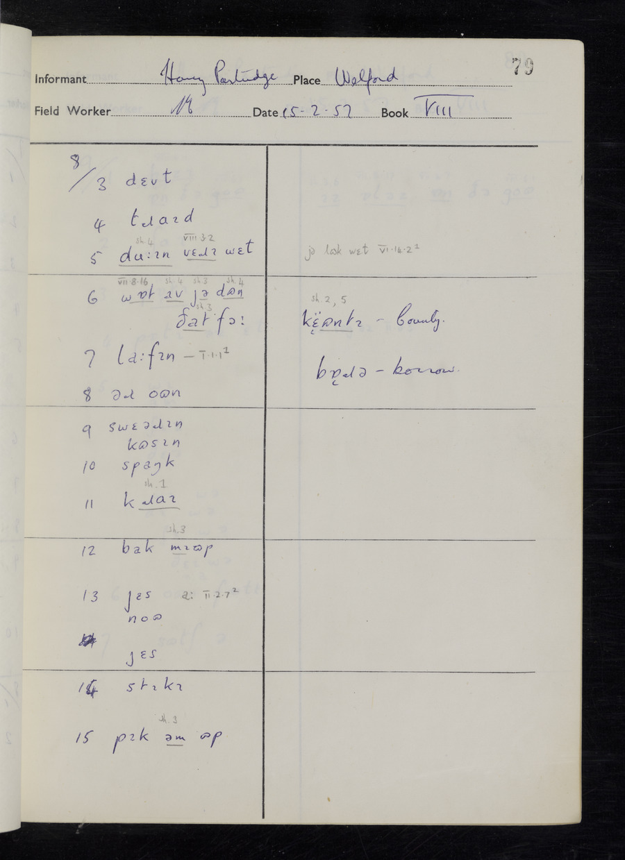 Interviews have been carried out by fieldworker Stanley Ellis. There are three informants for this response book - Harry Partridge, Ted Busurell and Benny Goodfellow. Their responses can be found in the following books: Harry Partridge - I, III, V, VI, VII, VIII, IX Ted Buswell - II Benny Goodfellow - IV