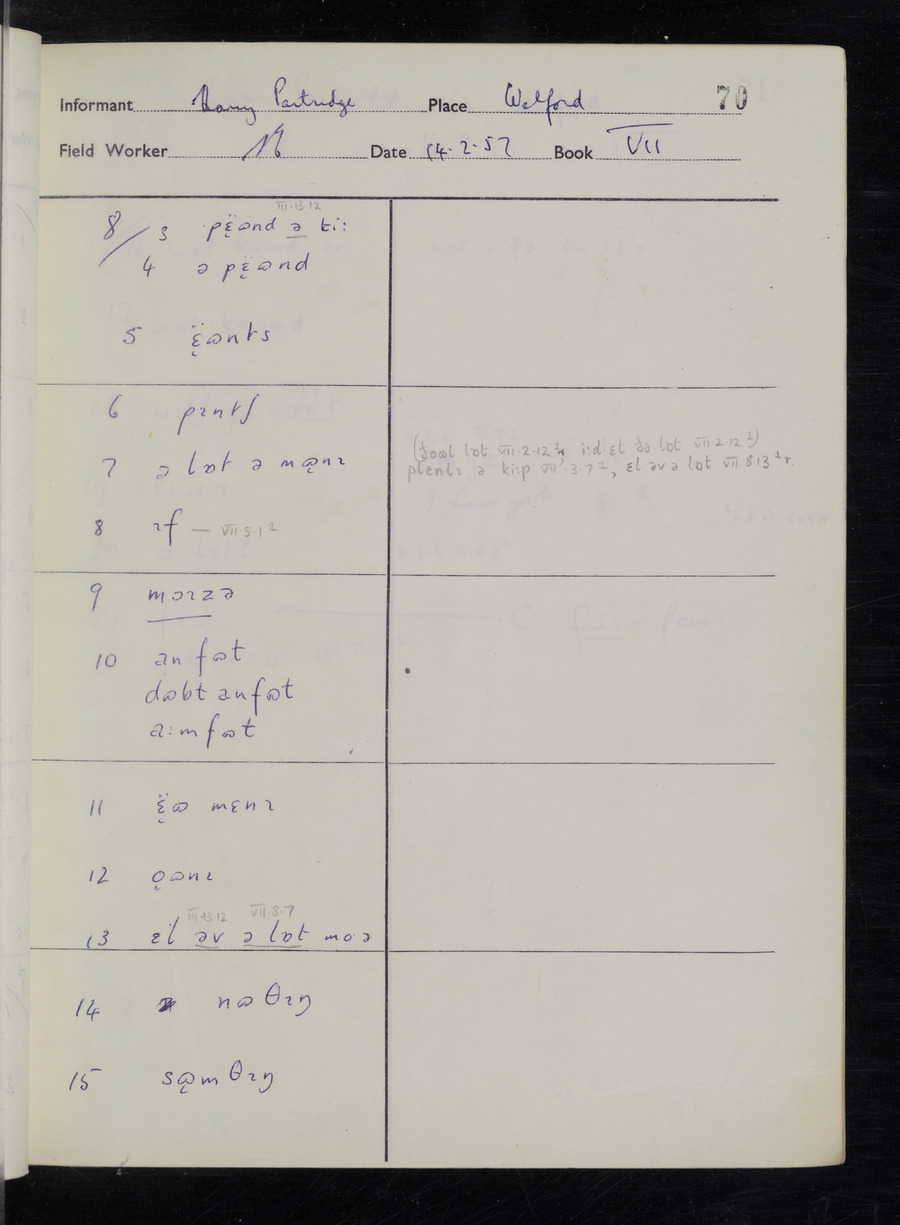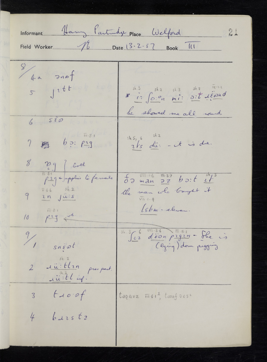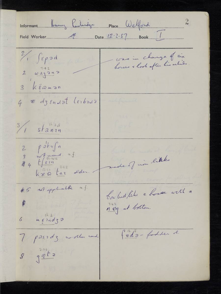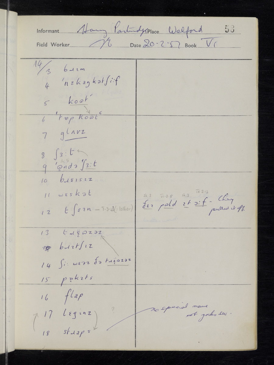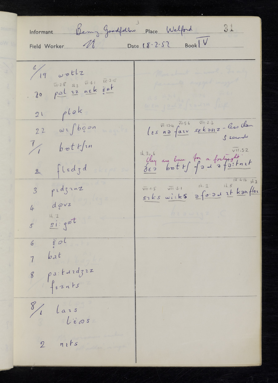 Interviews have been carried out by fieldworker Stanley Ellis. There are three informants for this response book - Harry Partridge, Ted Busurell and Benny Goodfellow. Their responses can be found in the following books: Harry Partridge - I, III, V, VI, VII, VIII, IX Ted Buswell - II Benny Goodfellow - IV