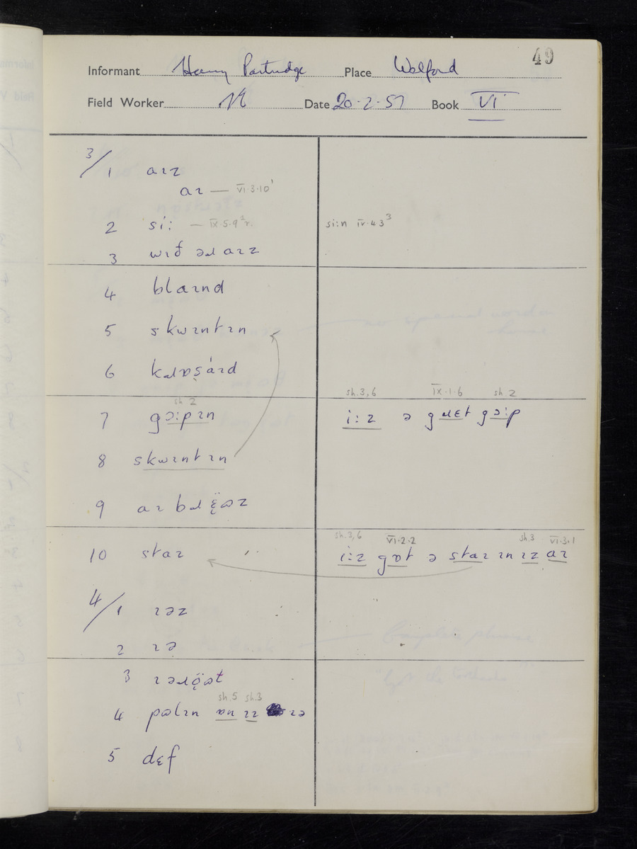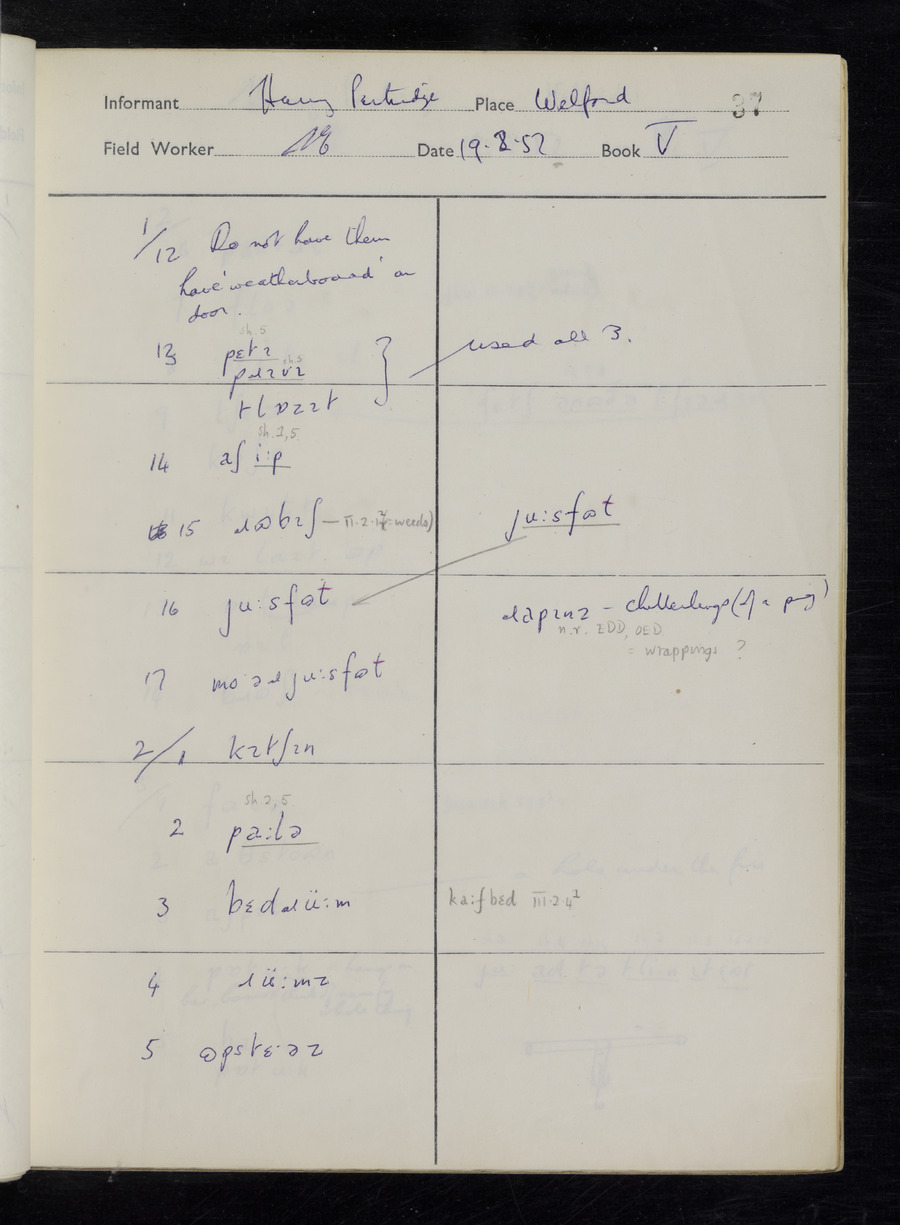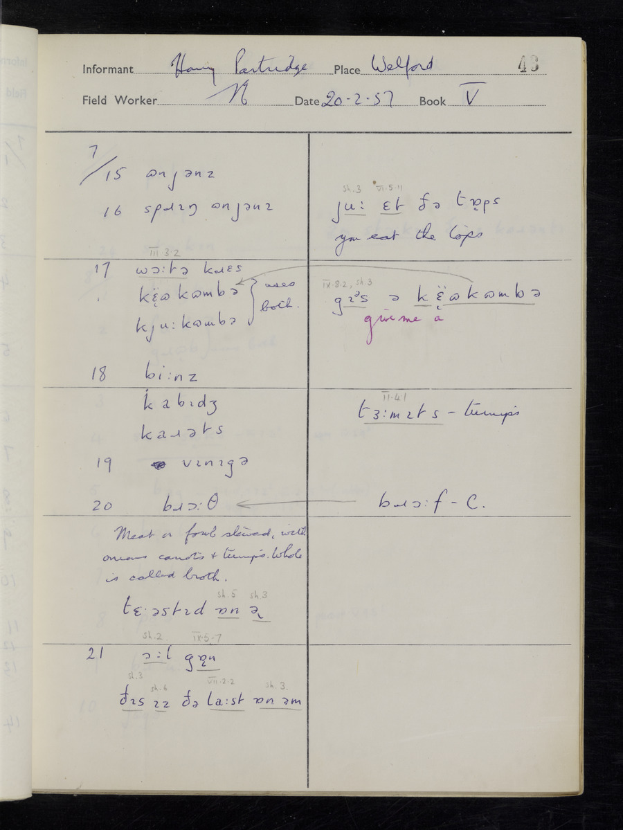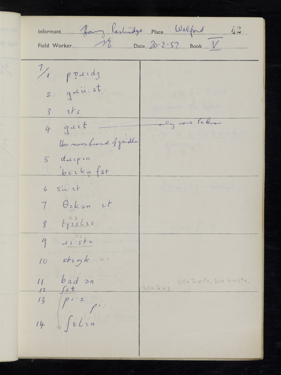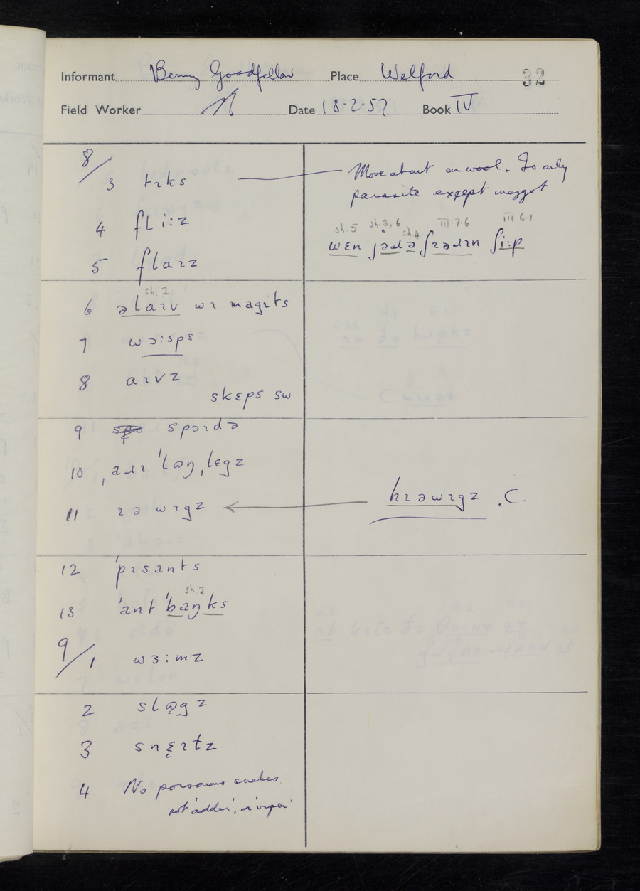 Interviews have been carried out by fieldworker Stanley Ellis. There are three informants for this response book - Harry Partridge, Ted Busurell and Benny Goodfellow. Their responses can be found in the following books: Harry Partridge - I, III, V, VI, VII, VIII, IX Ted Buswell - II Benny Goodfellow - IV