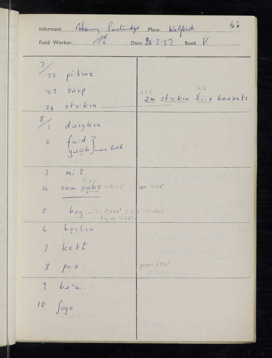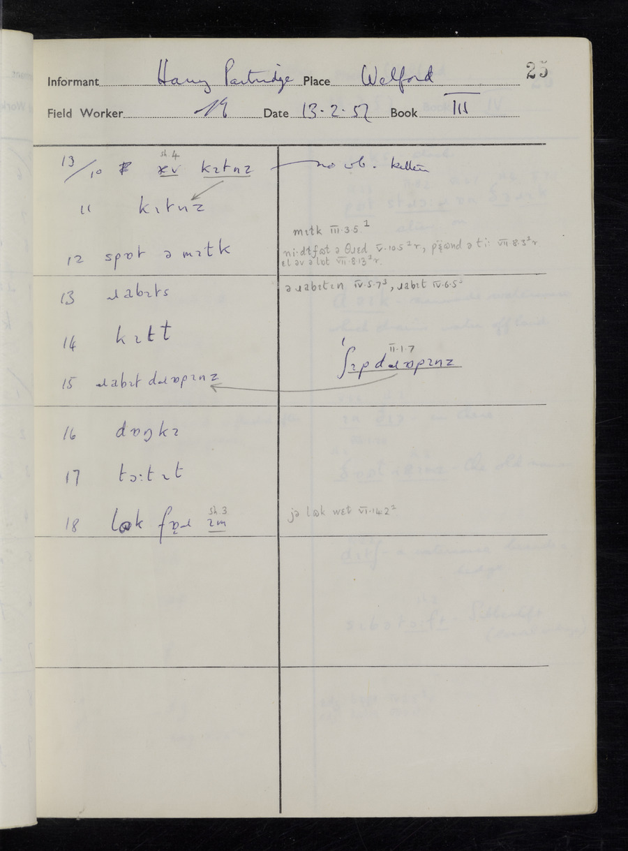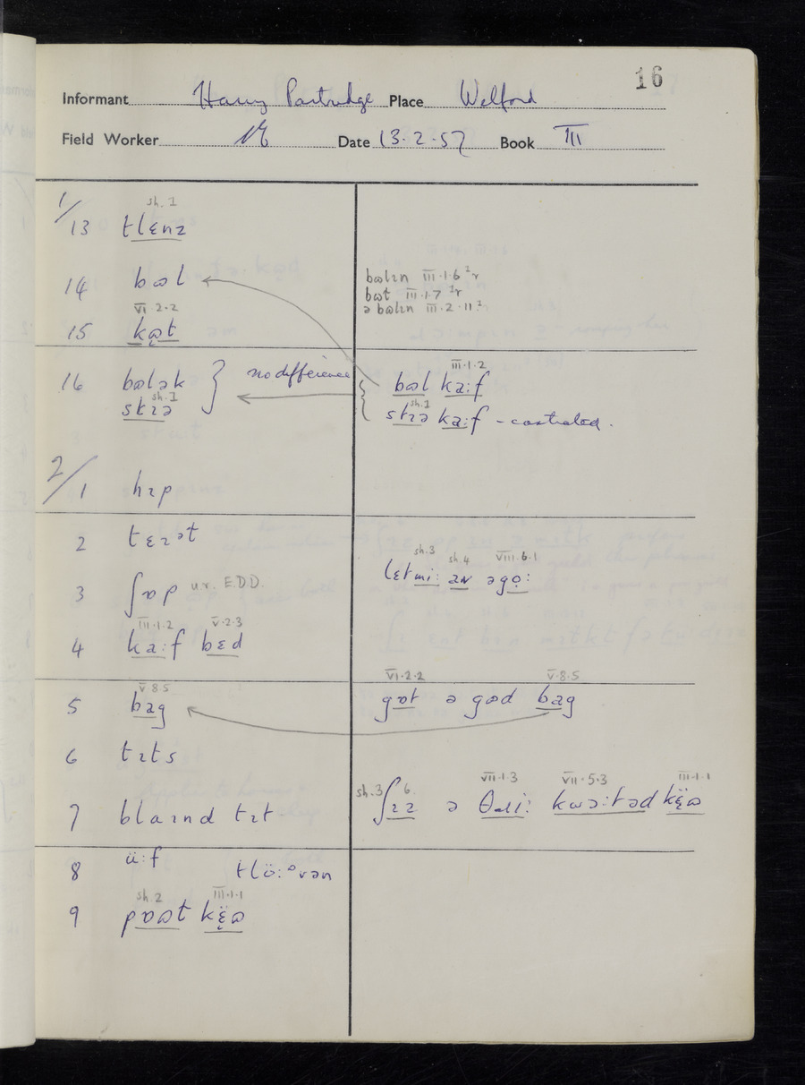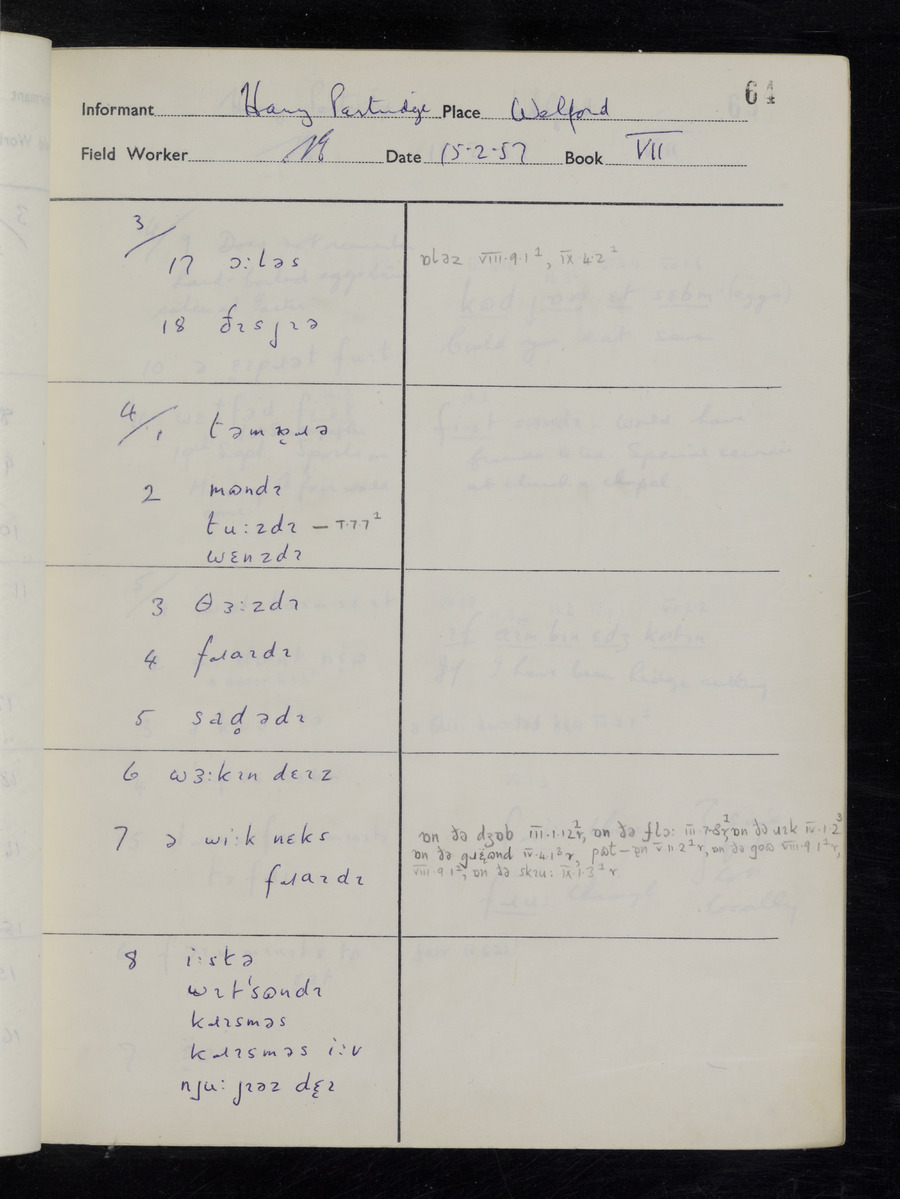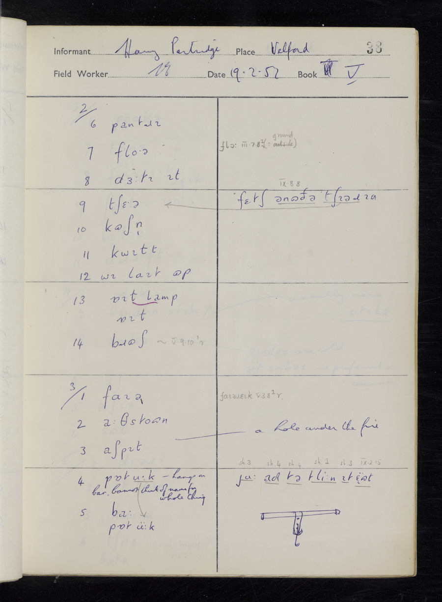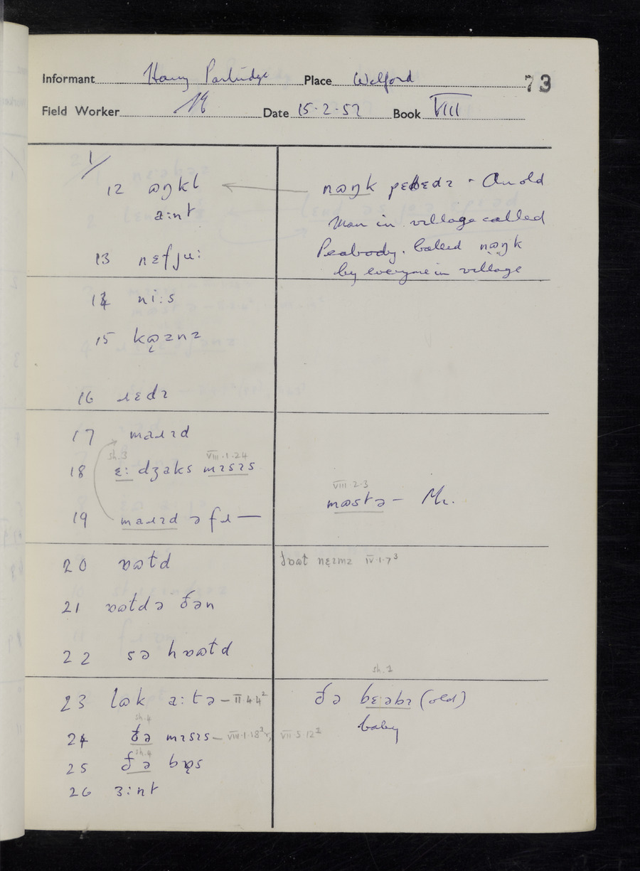 Interviews have been carried out by fieldworker Stanley Ellis. There are three informants for this response book - Harry Partridge, Ted Busurell and Benny Goodfellow. Their responses can be found in the following books: Harry Partridge - I, III, V, VI, VII, VIII, IX Ted Buswell - II Benny Goodfellow - IV