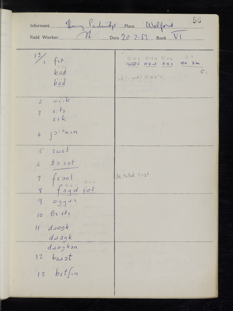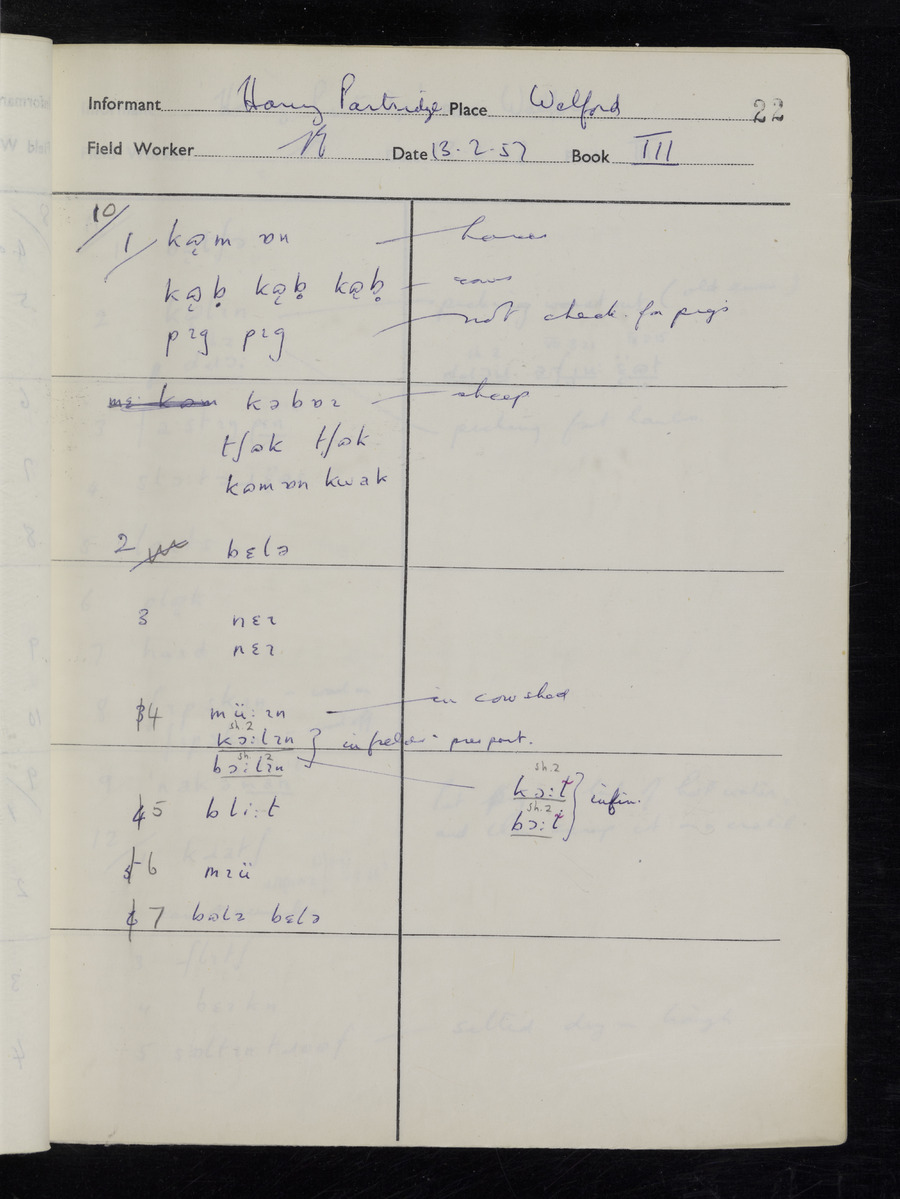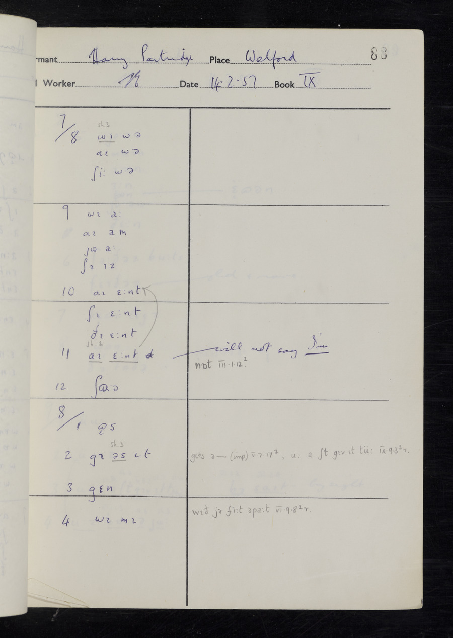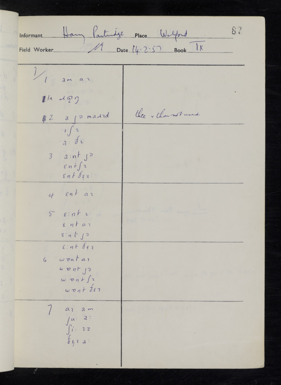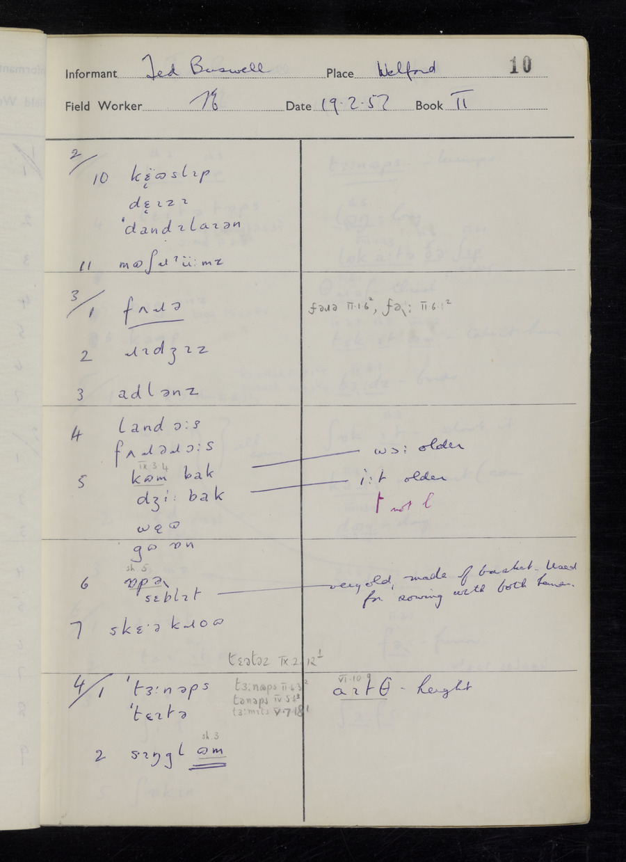 Interviews have been carried out by fieldworker Stanley Ellis. There are three informants for this response book - Harry Partridge, Ted Busurell and Benny Goodfellow. Their responses can be found in the following books: Harry Partridge - I, III, V, VI, VII, VIII, IX Ted Buswell - II Benny Goodfellow - IV
