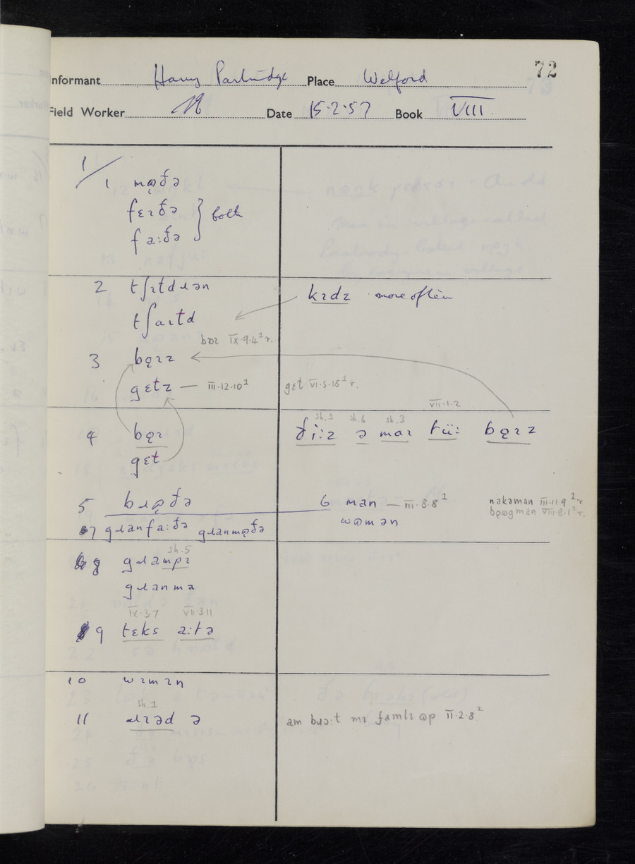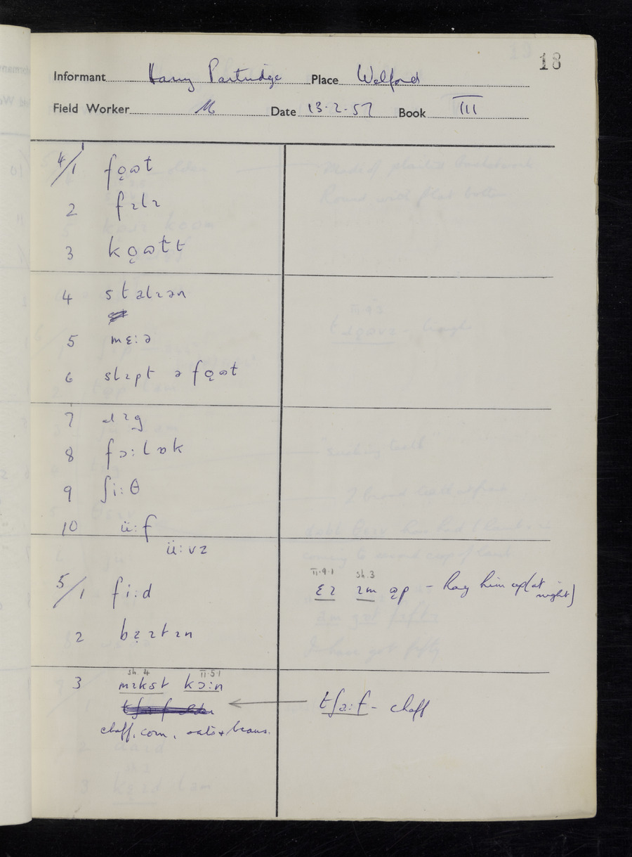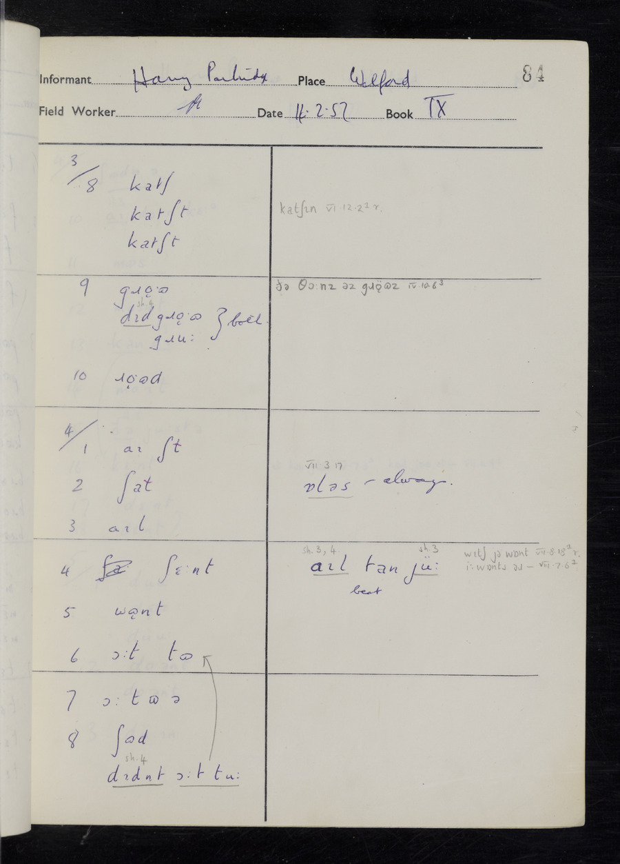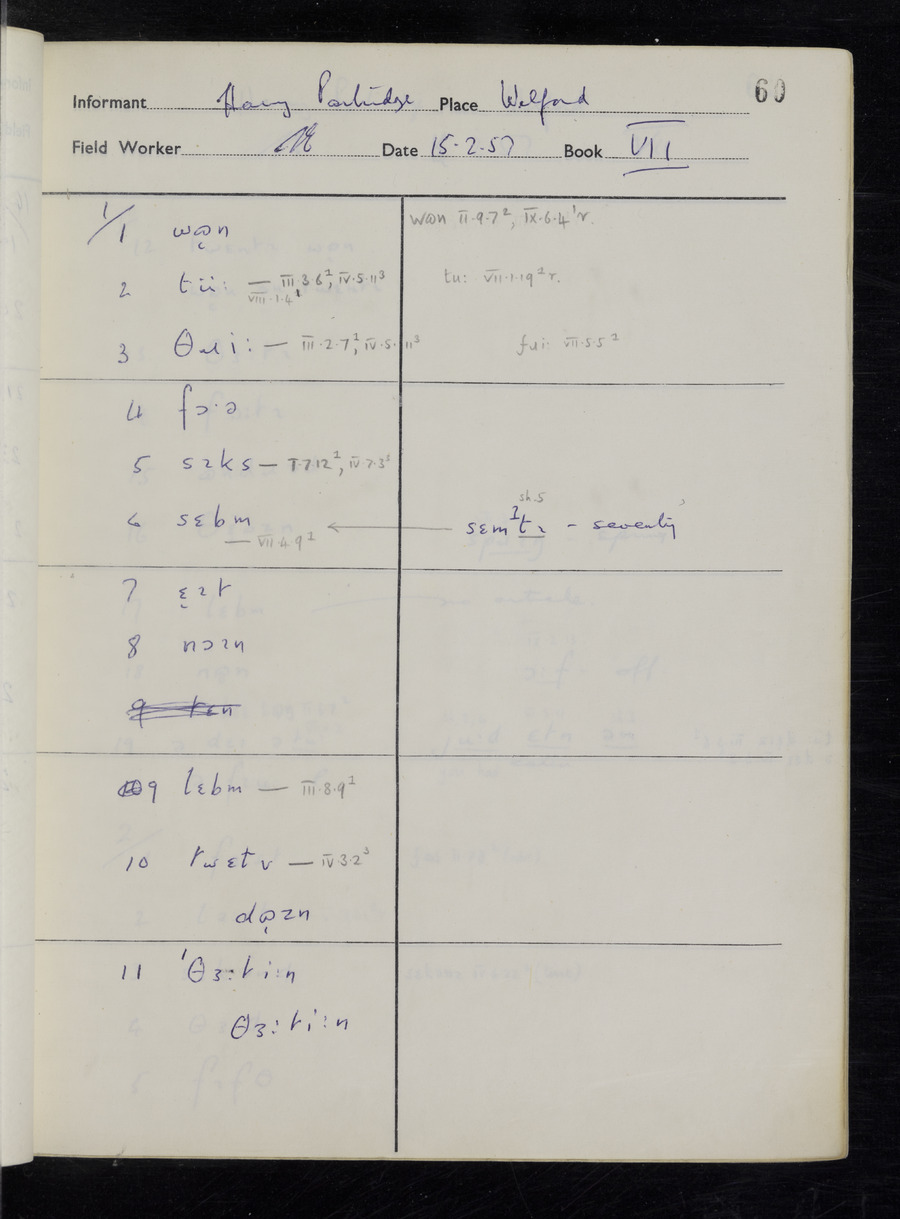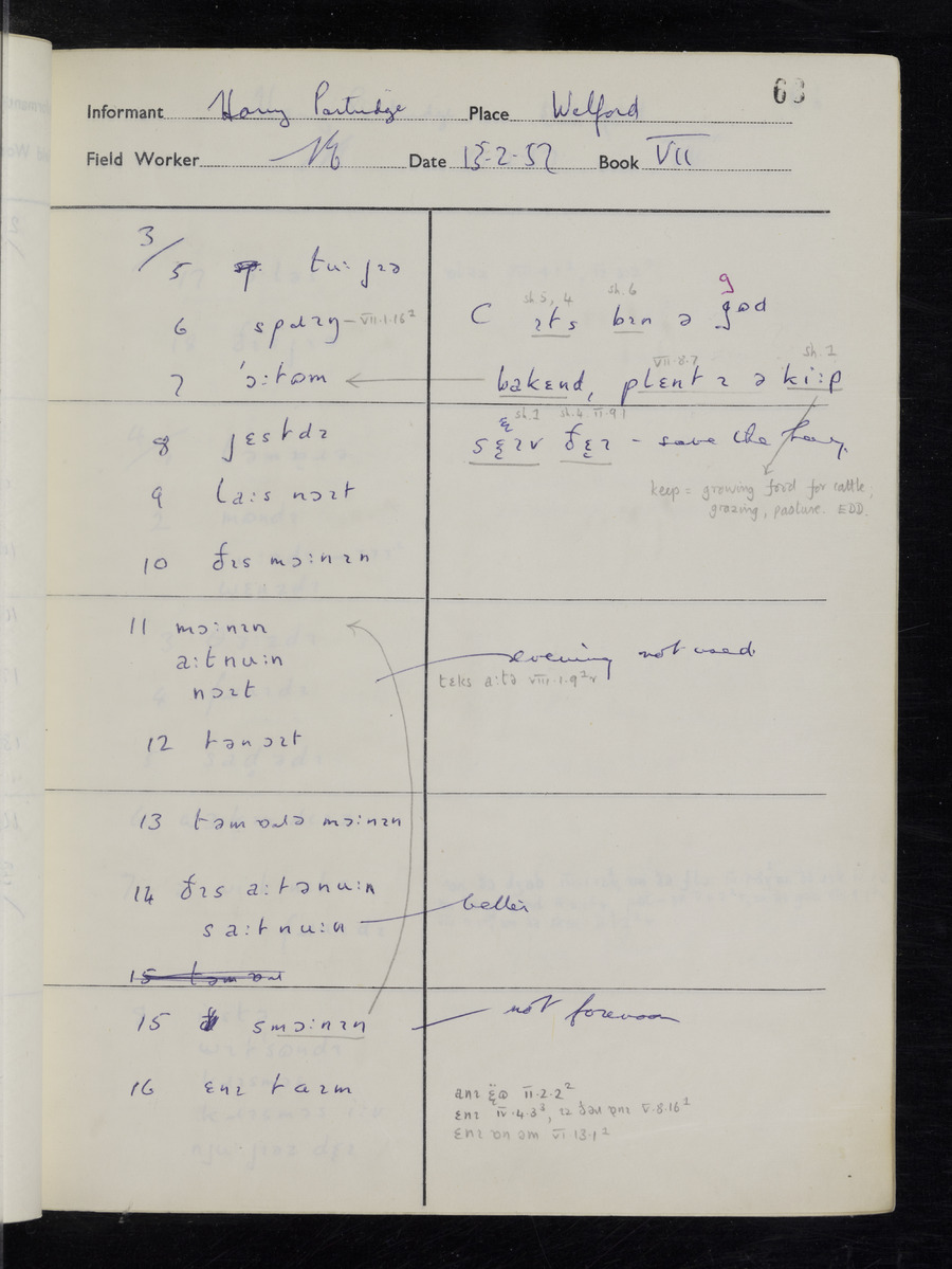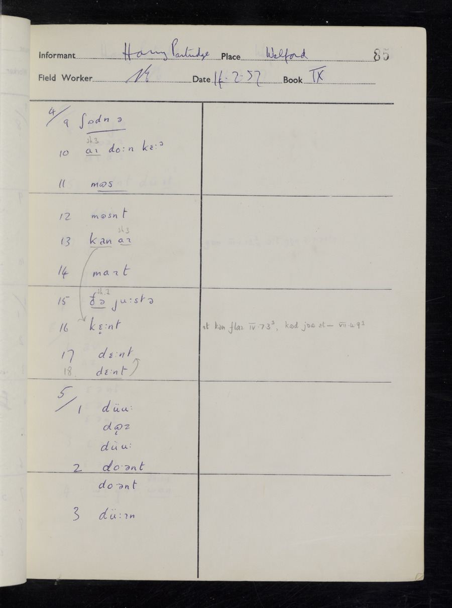 Interviews have been carried out by fieldworker Stanley Ellis. There are three informants for this response book - Harry Partridge, Ted Busurell and Benny Goodfellow. Their responses can be found in the following books: Harry Partridge - I, III, V, VI, VII, VIII, IX Ted Buswell - II Benny Goodfellow - IV