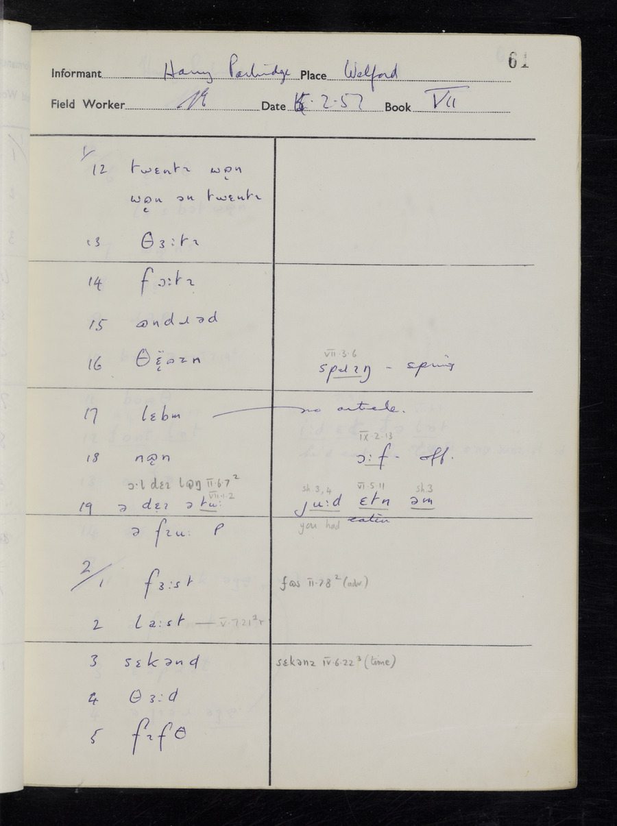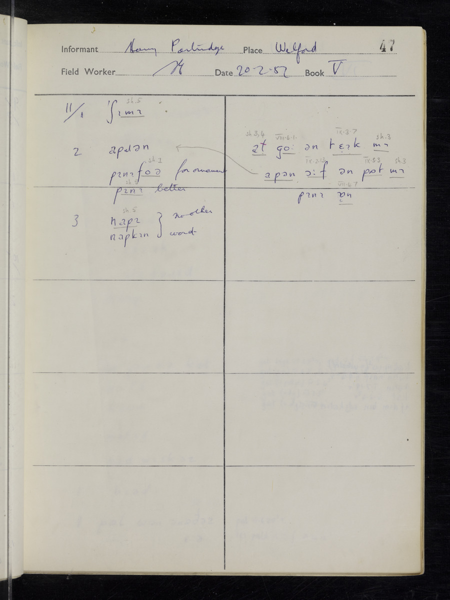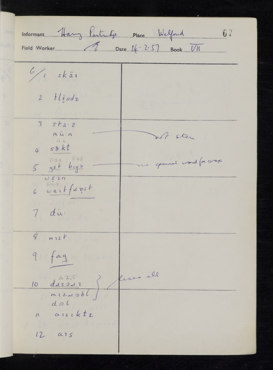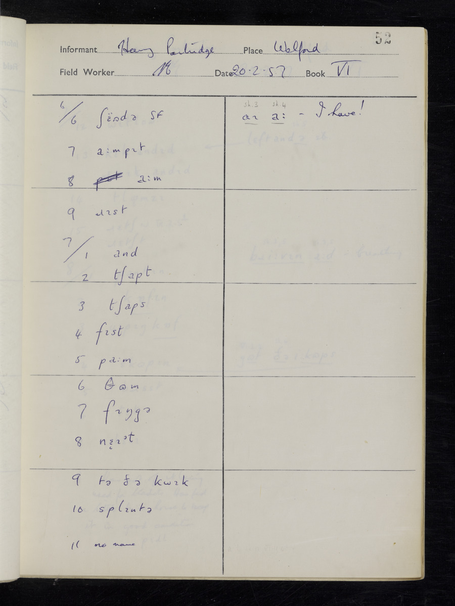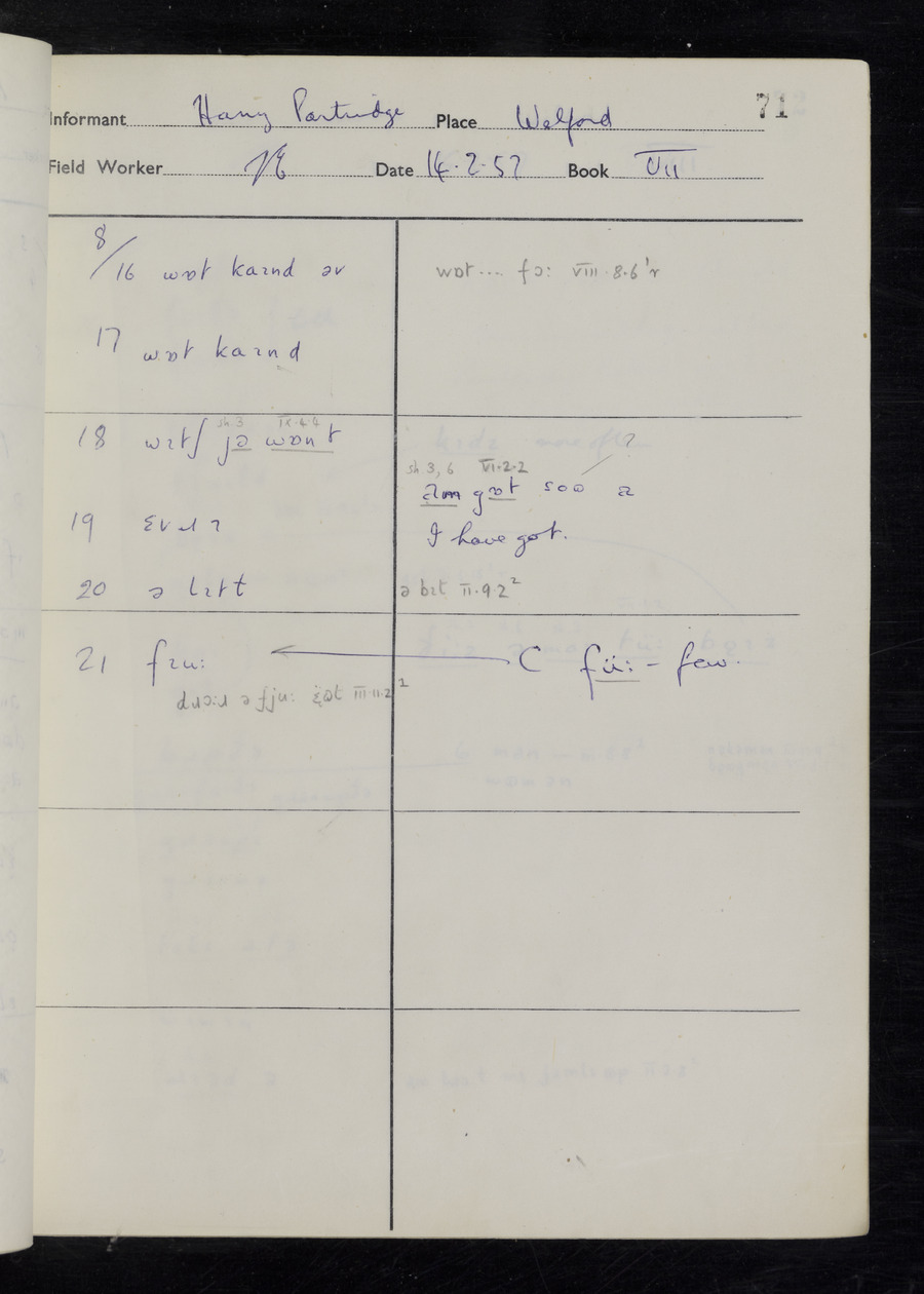 Interviews have been carried out by fieldworker Stanley Ellis. There are three informants for this response book - Harry Partridge, Ted Busurell and Benny Goodfellow. Their responses can be found in the following books: Harry Partridge - I, III, V, VI, VII, VIII, IX Ted Buswell - II Benny Goodfellow - IV