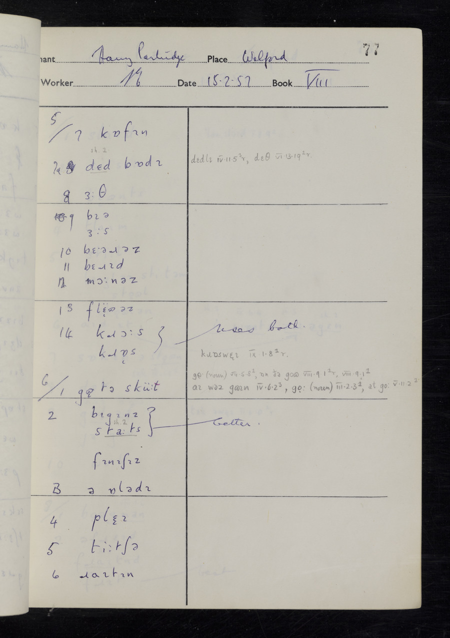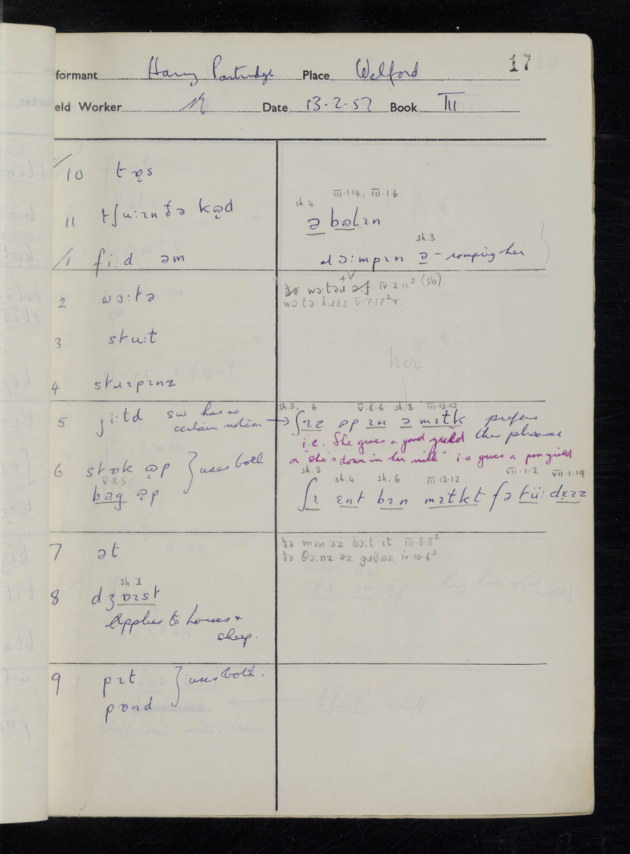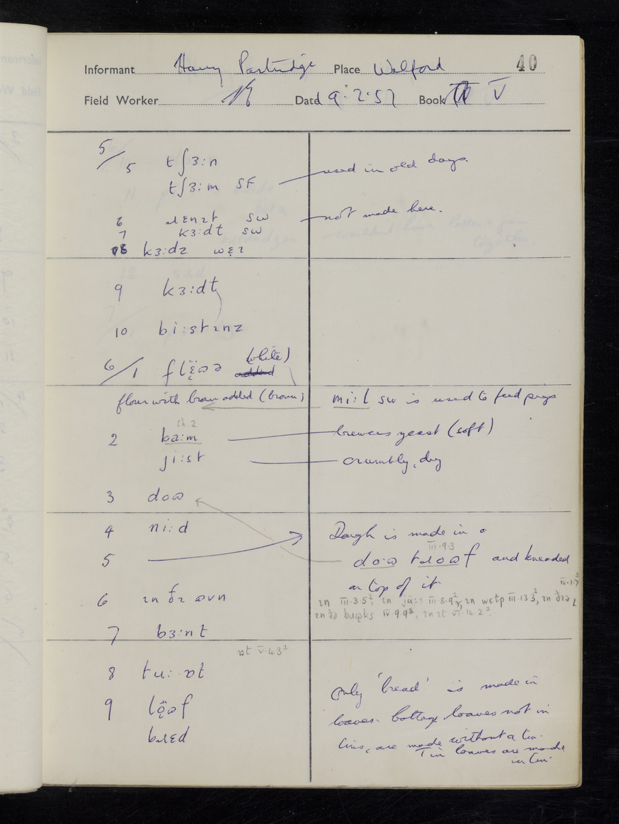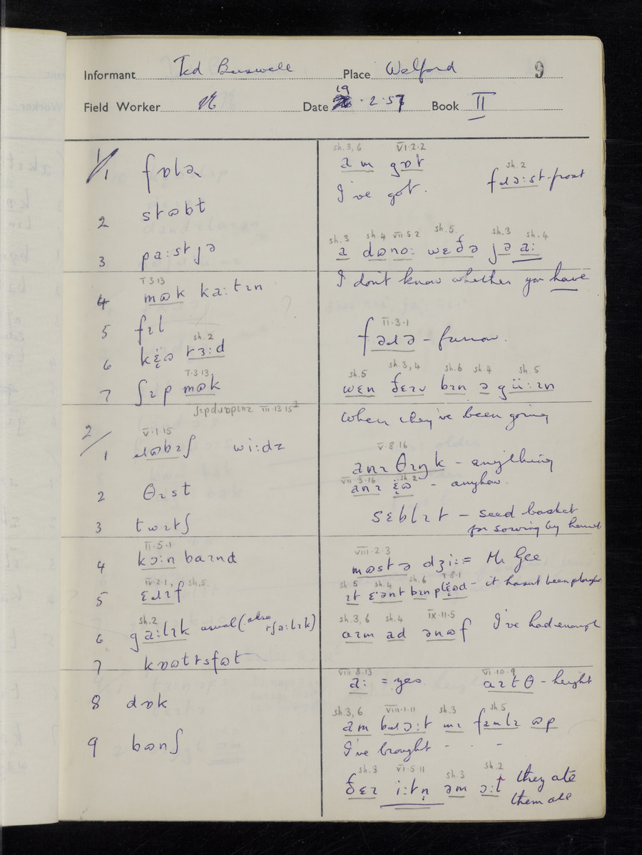 Response book recording the answers given by informants during the Survey of English Dialect. It includes 9 sections that cover a range of topics relating to work, domestic and social life. Answers are recorded in the International Phonetic Alphabet.