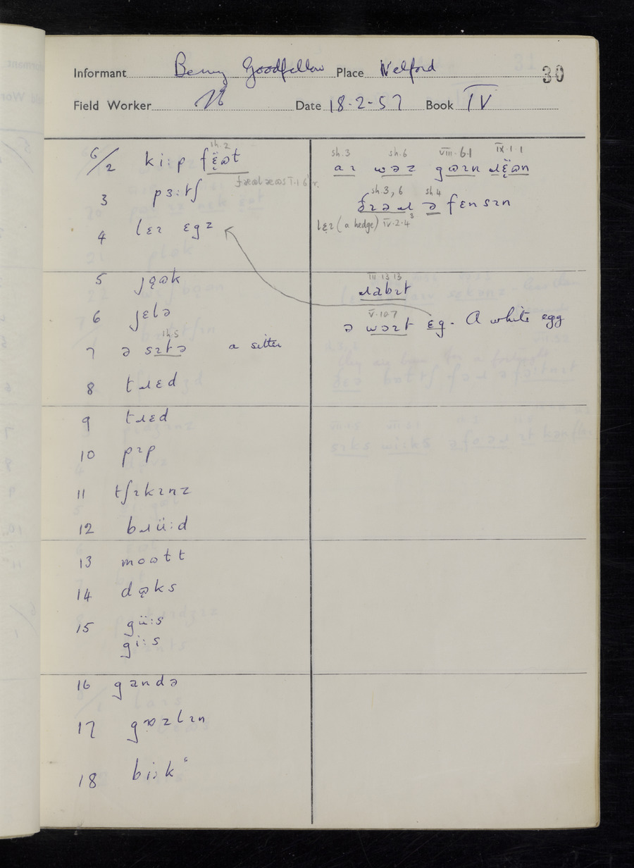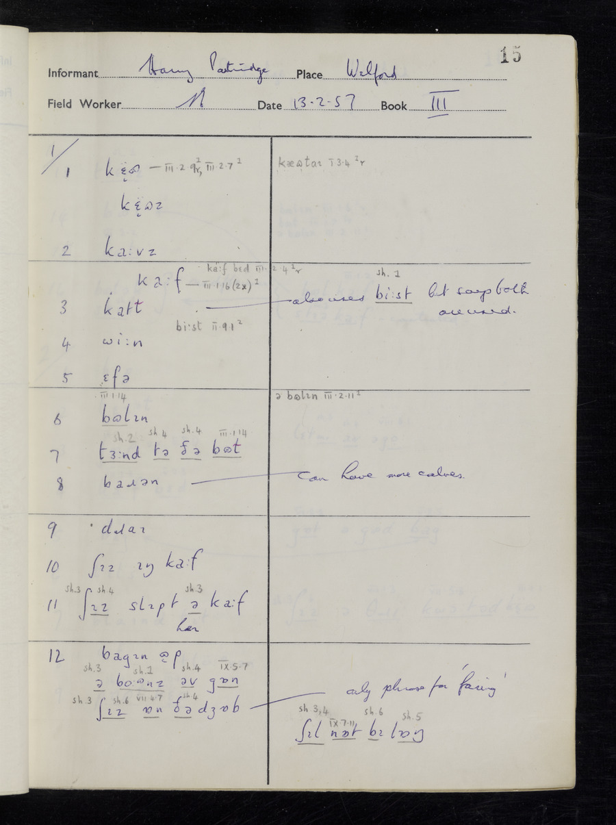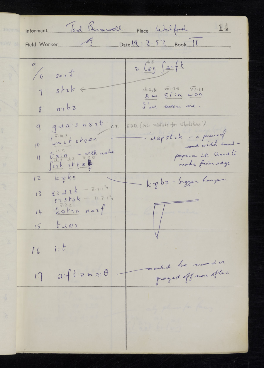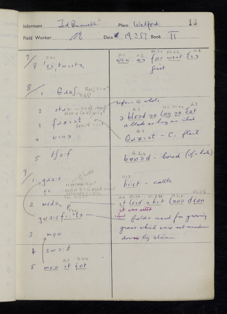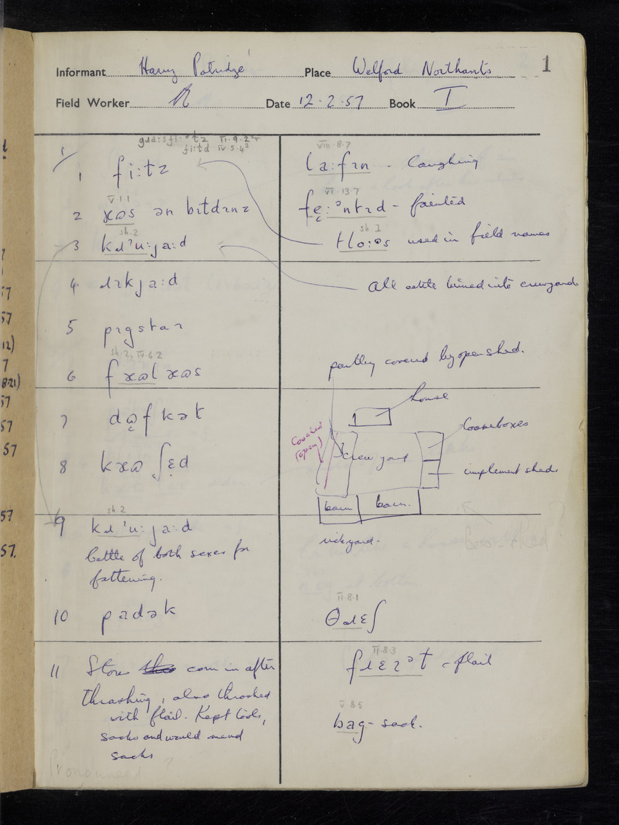 Response book recording the answers given by informants during the Survey of English Dialect. It includes 9 sections that cover a range of topics relating to work, domestic and social life. Answers are recorded in the International Phonetic Alphabet.