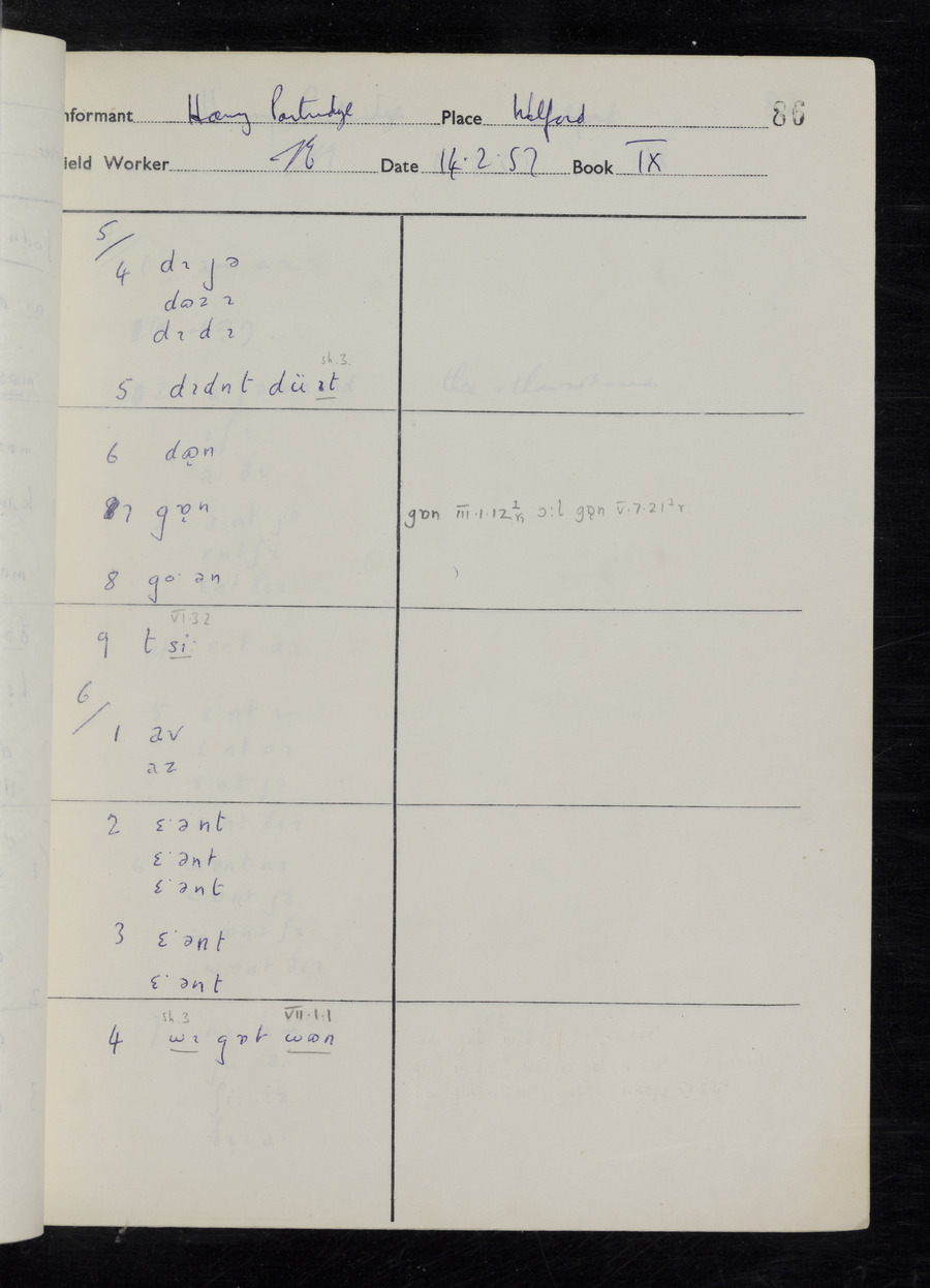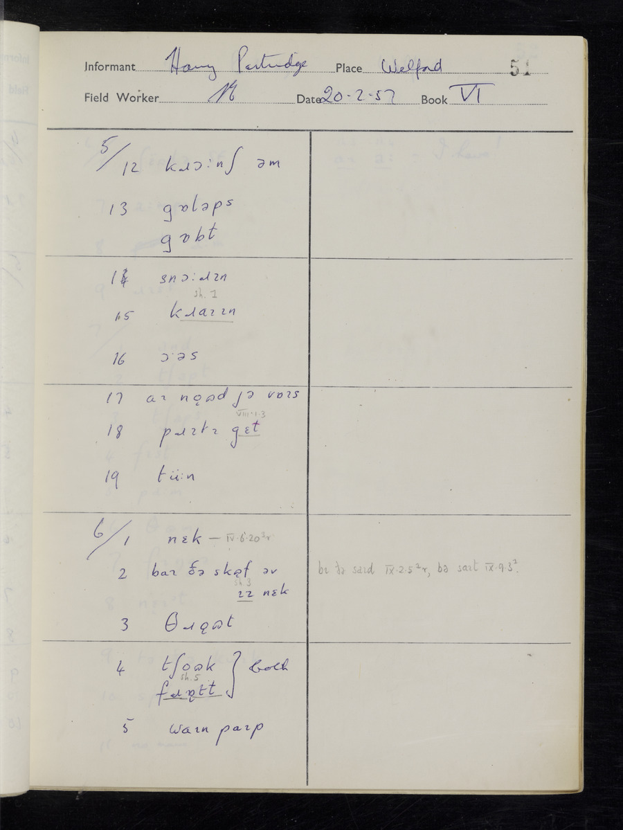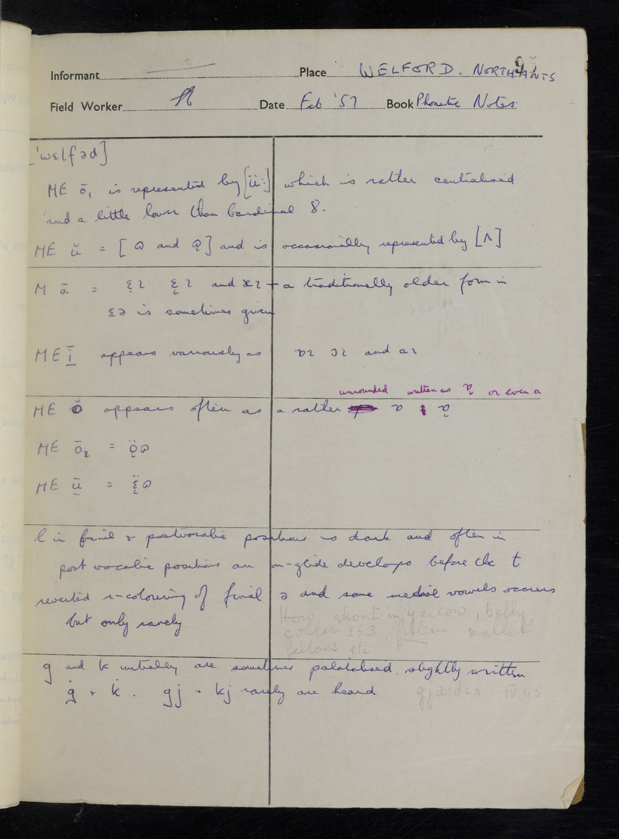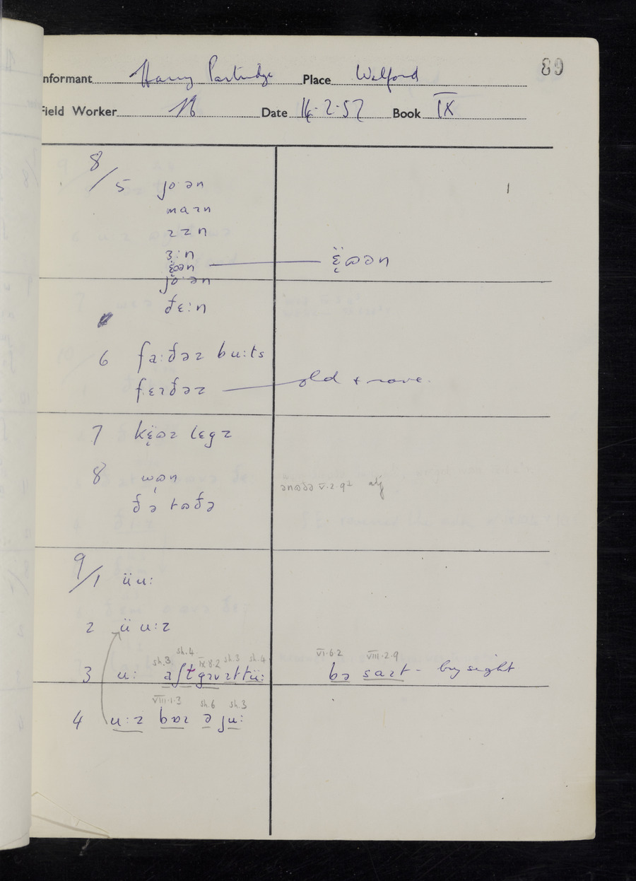 Response book recording the answers given by informants during the Survey of English Dialect. It includes 9 sections that cover a range of topics relating to work, domestic and social life. Answers are recorded in the International Phonetic Alphabet.