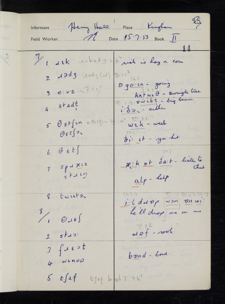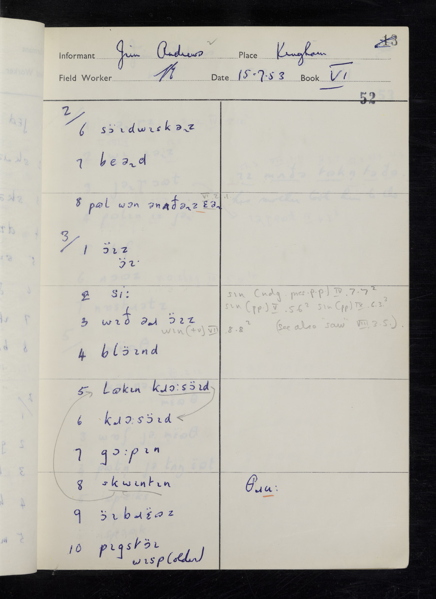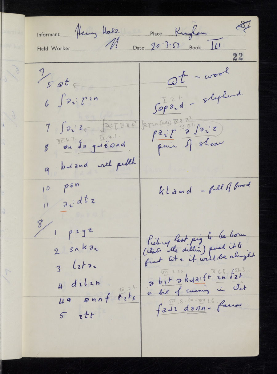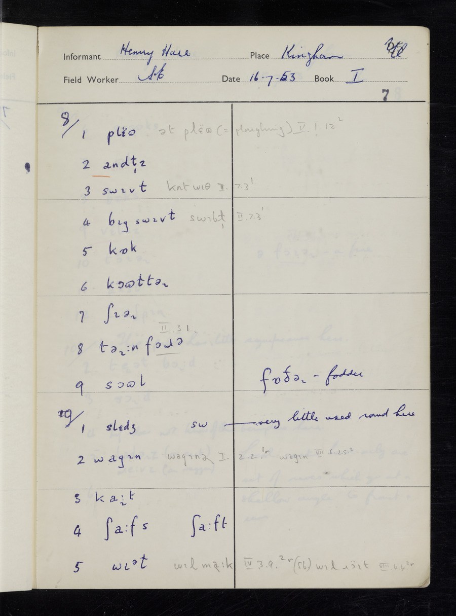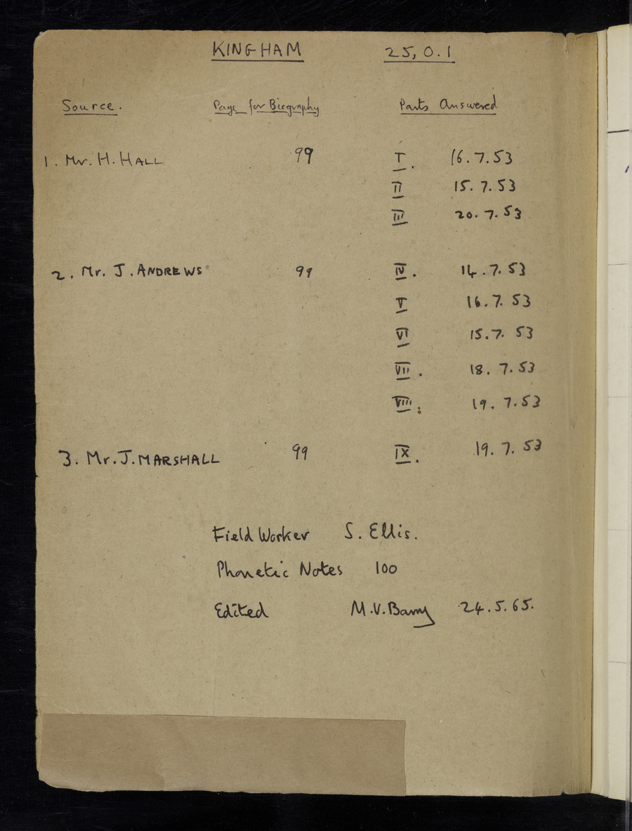 Interviews have been carried out by fieldworker Stanley Ellis. There are three informants for this response book - Henry Hall, Jim Andrews and Jack Marshall. Their responses can be found in the following books: Henry Hall - I, II, III Jim Andrews - IV, V, VI, VII, VIII Jack Marshall - IX