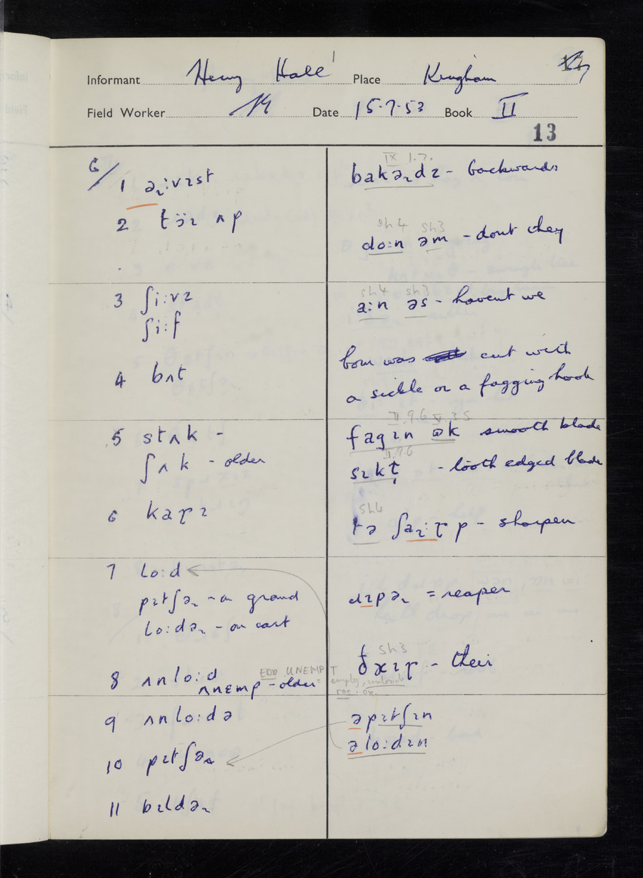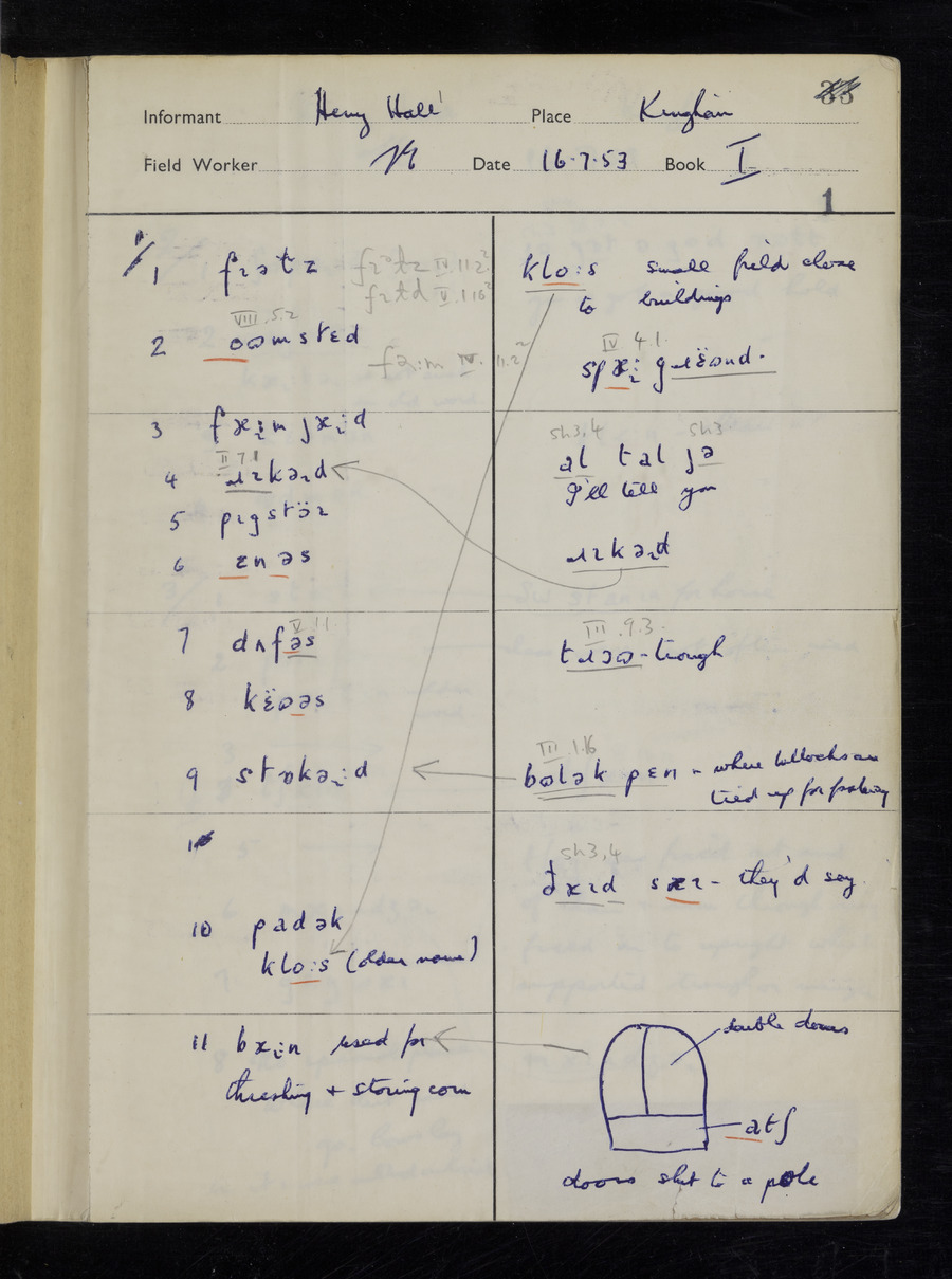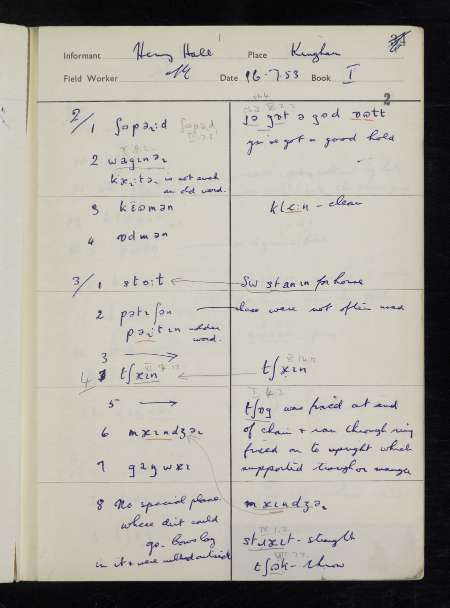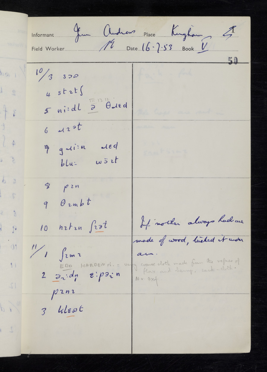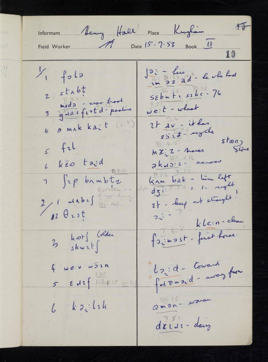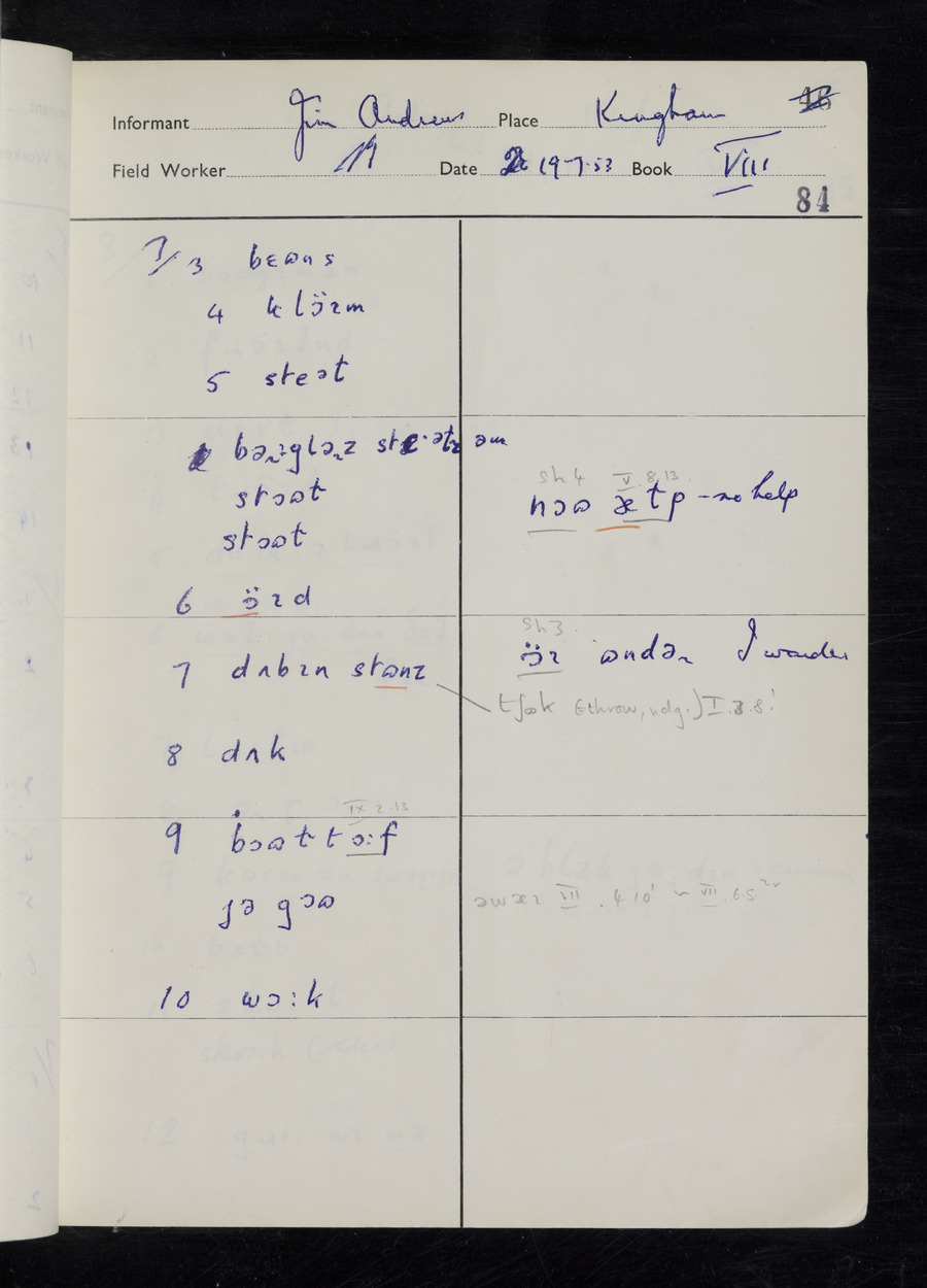 Interviews have been carried out by fieldworker Stanley Ellis. There are three informants for this response book - Henry Hall, Jim Andrews and Jack Marshall. Their responses can be found in the following books: Henry Hall - I, II, III Jim Andrews - IV, V, VI, VII, VIII Jack Marshall - IX