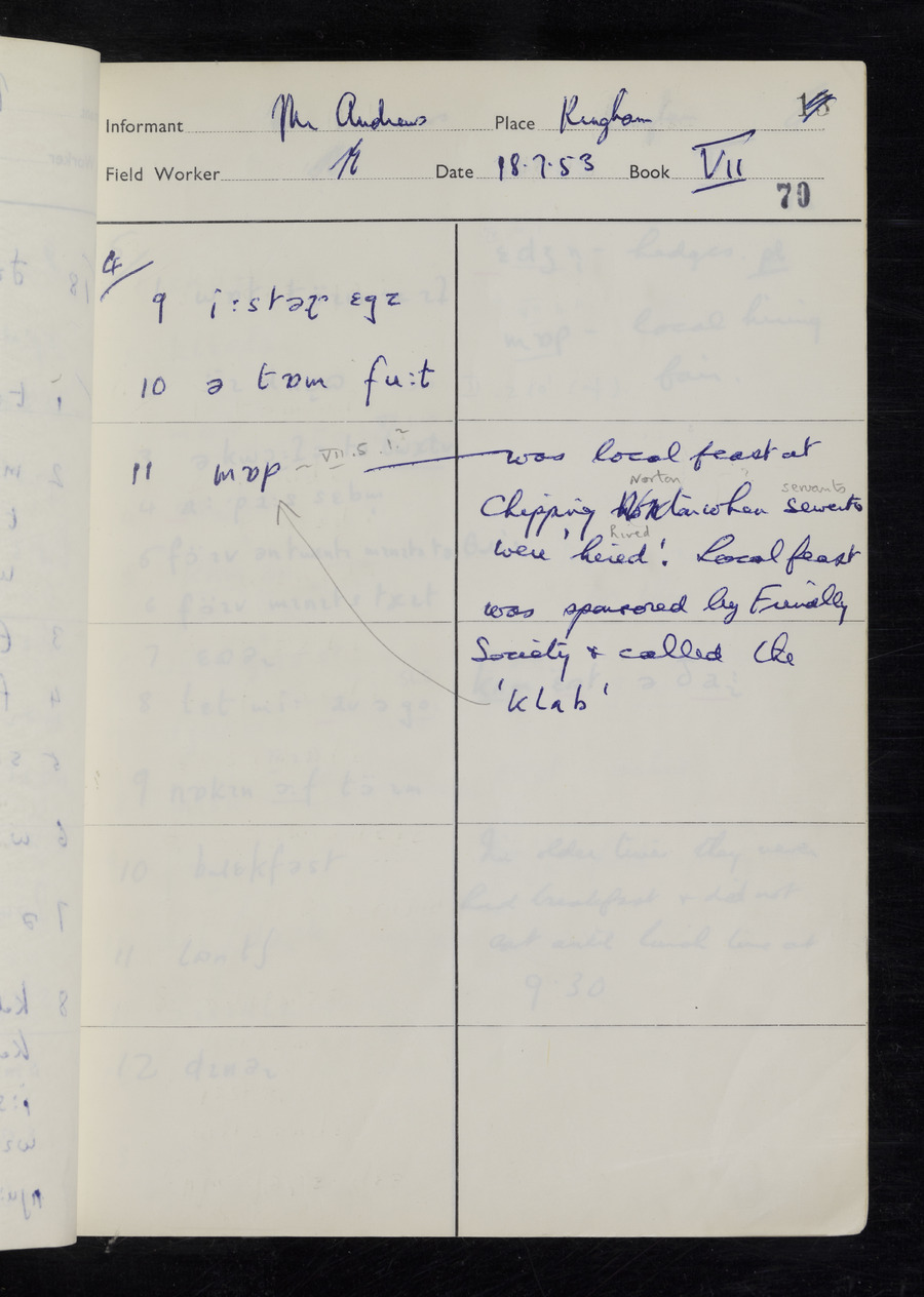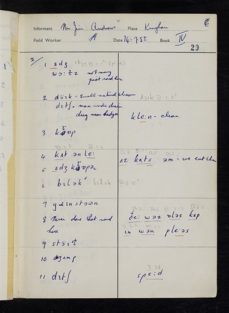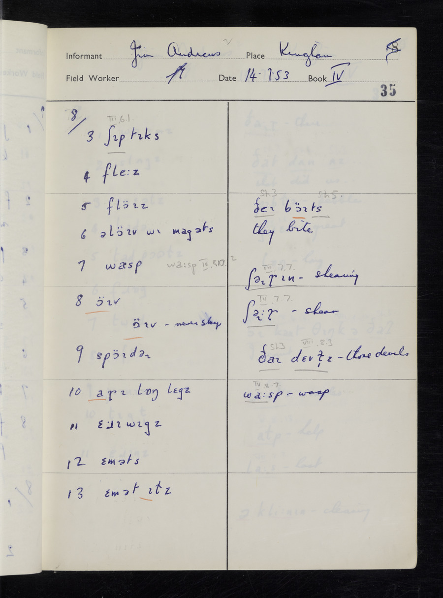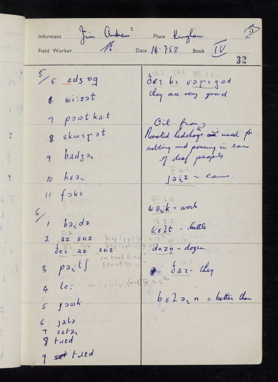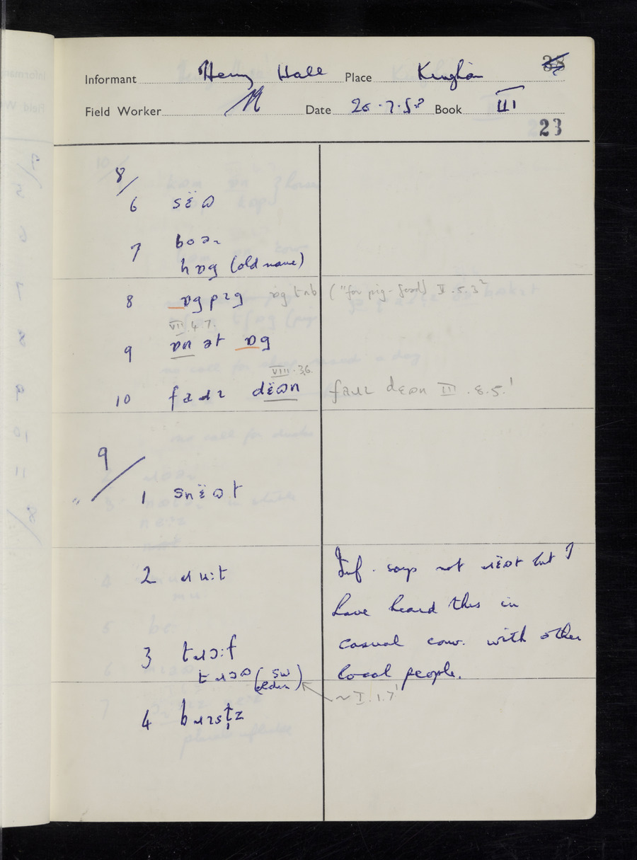 Interviews have been carried out by fieldworker Stanley Ellis. There are three informants for this response book - Henry Hall, Jim Andrews and Jack Marshall. Their responses can be found in the following books: Henry Hall - I, II, III Jim Andrews - IV, V, VI, VII, VIII Jack Marshall - IX