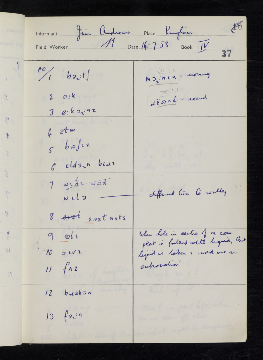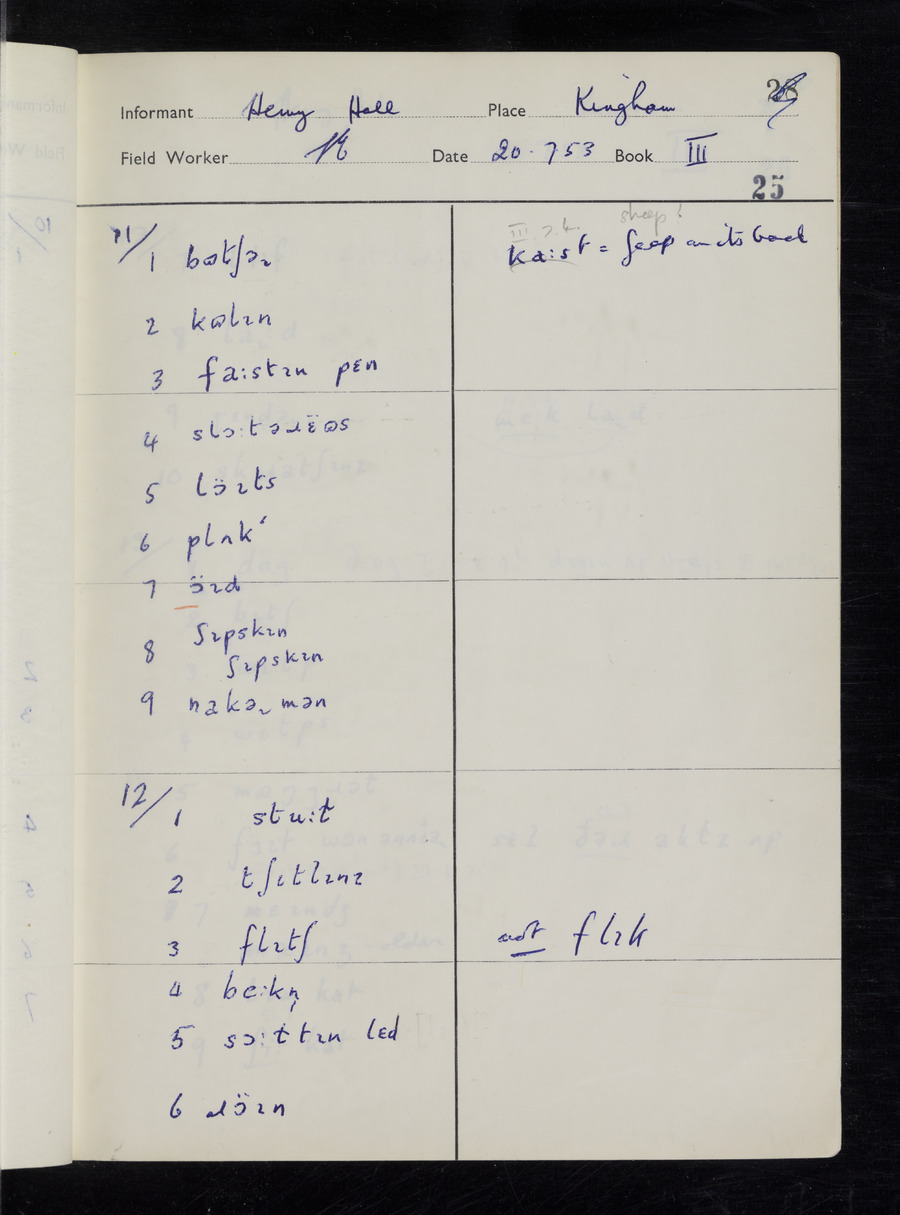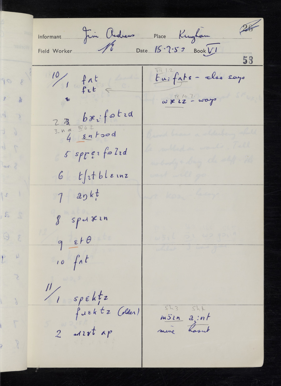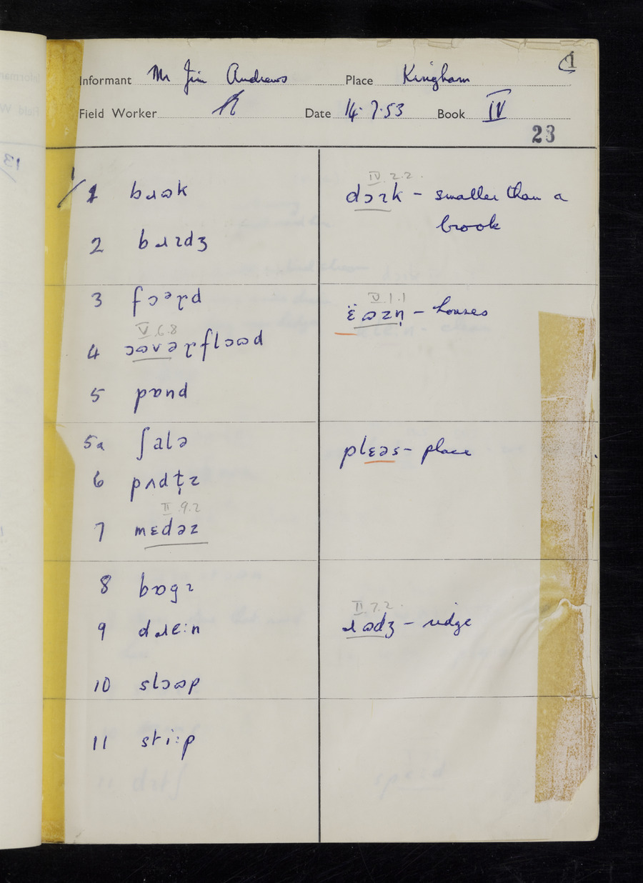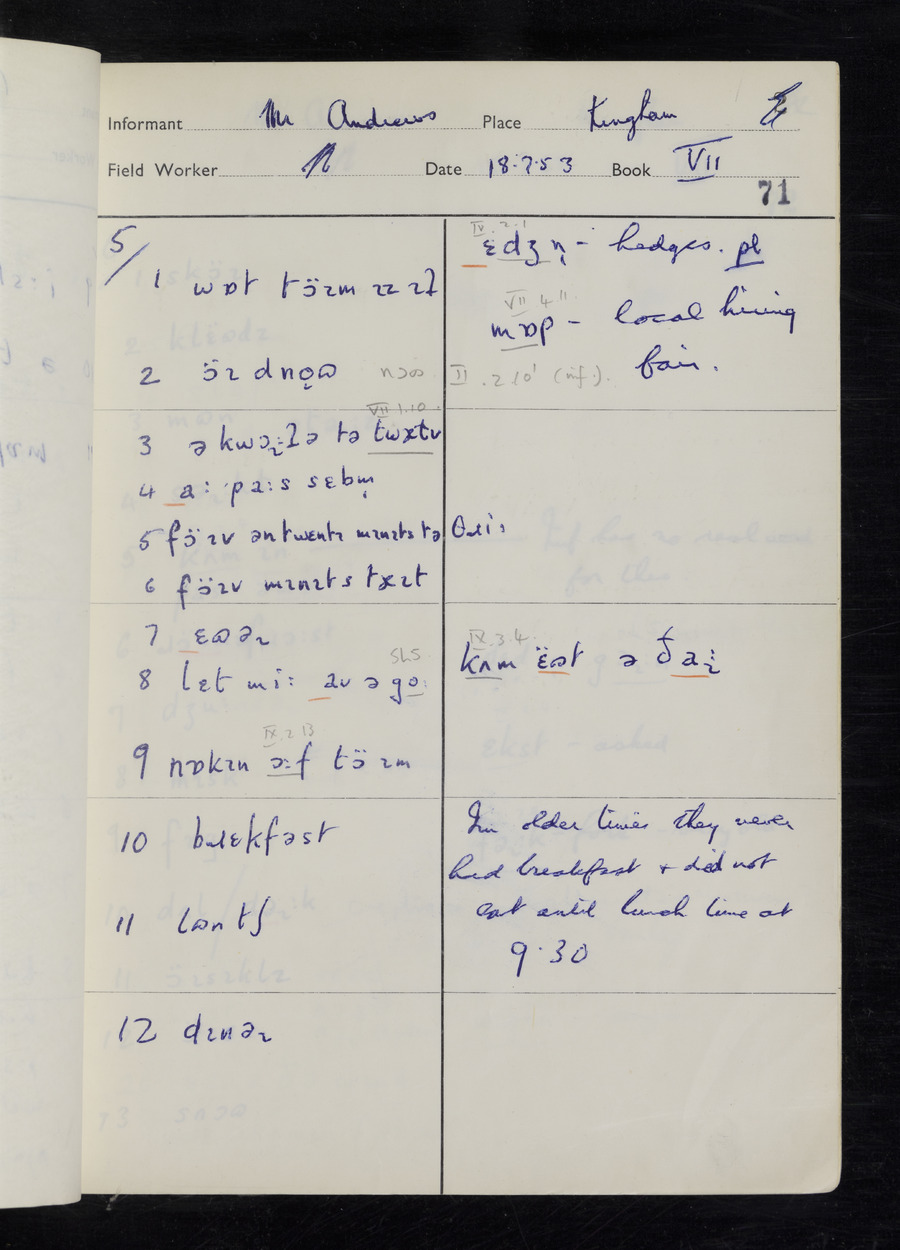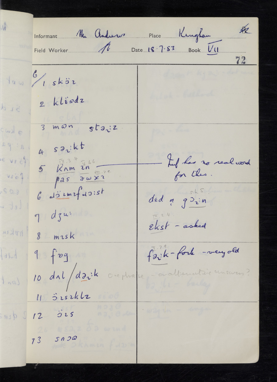 Interviews have been carried out by fieldworker Stanley Ellis. There are three informants for this response book - Henry Hall, Jim Andrews and Jack Marshall. Their responses can be found in the following books: Henry Hall - I, II, III Jim Andrews - IV, V, VI, VII, VIII Jack Marshall - IX
