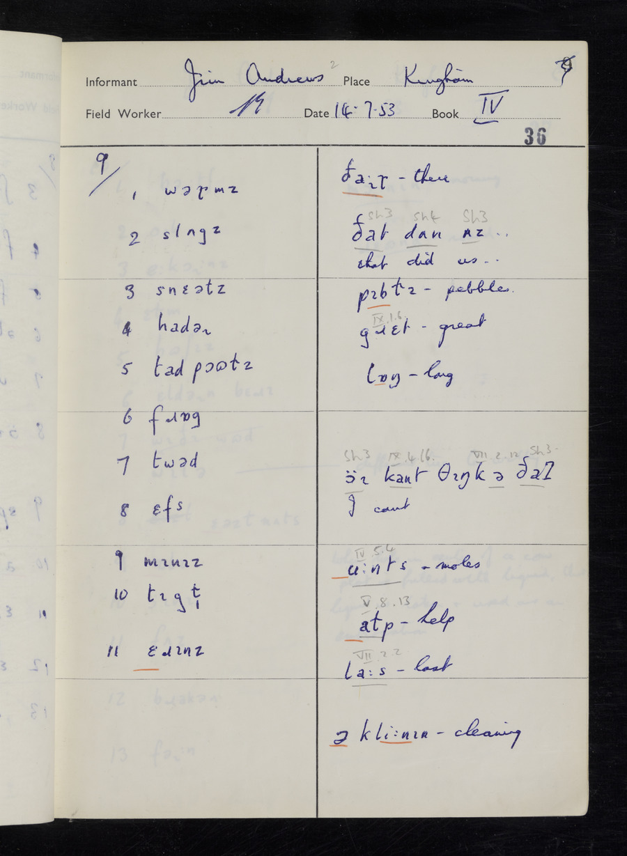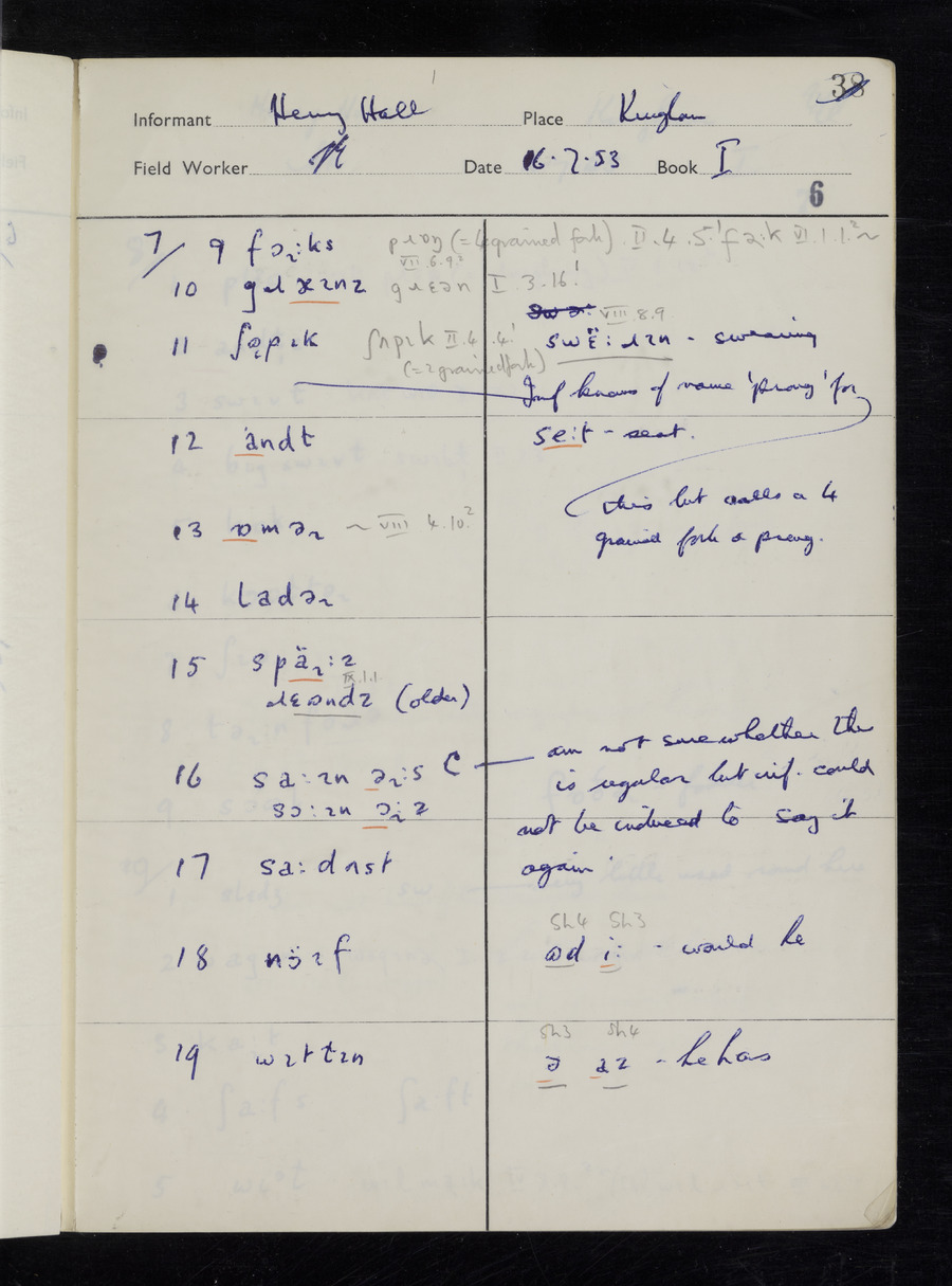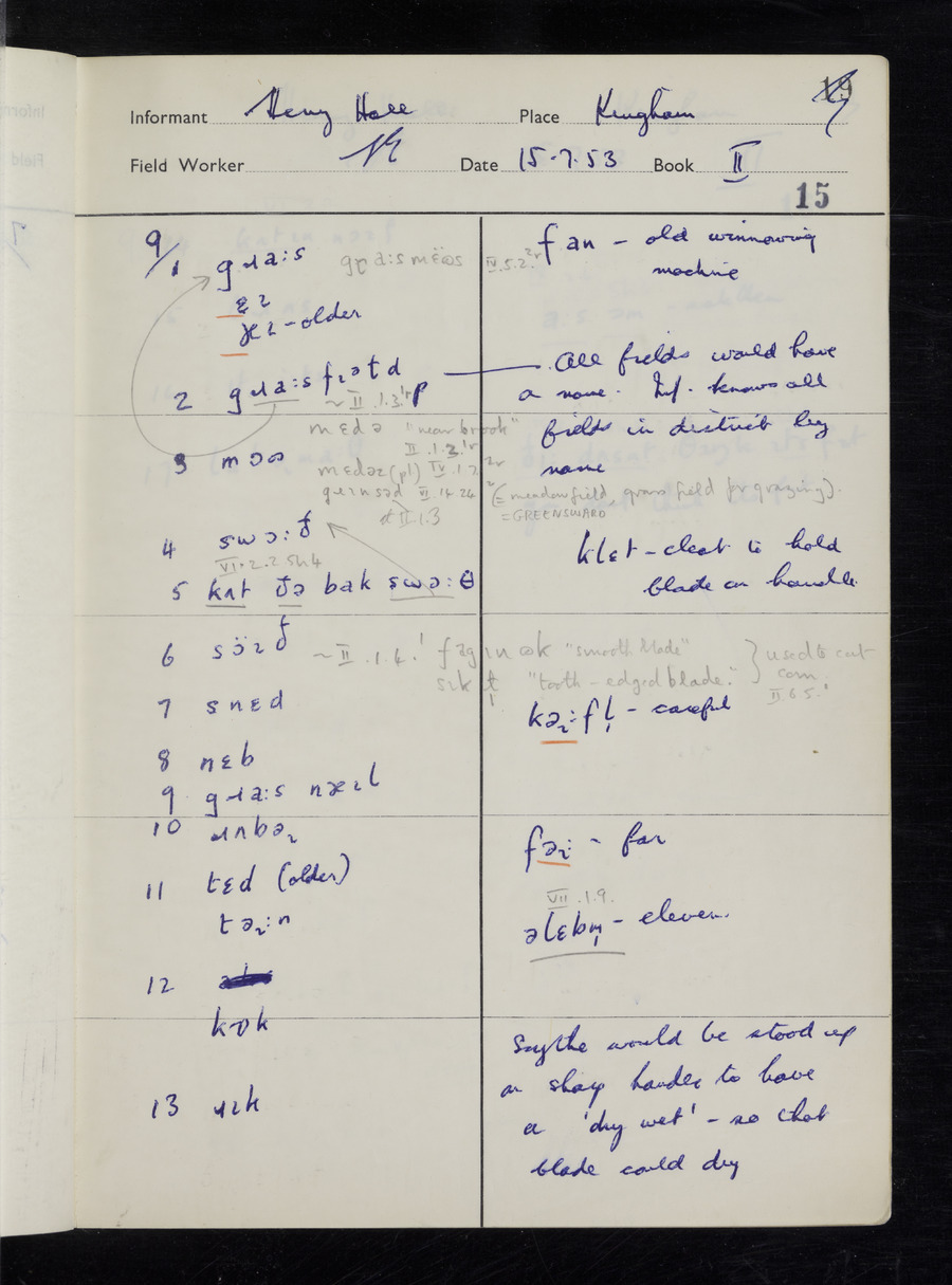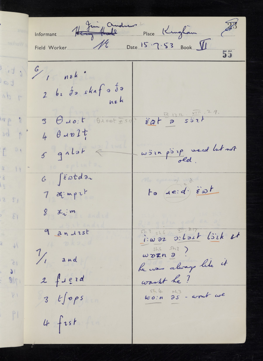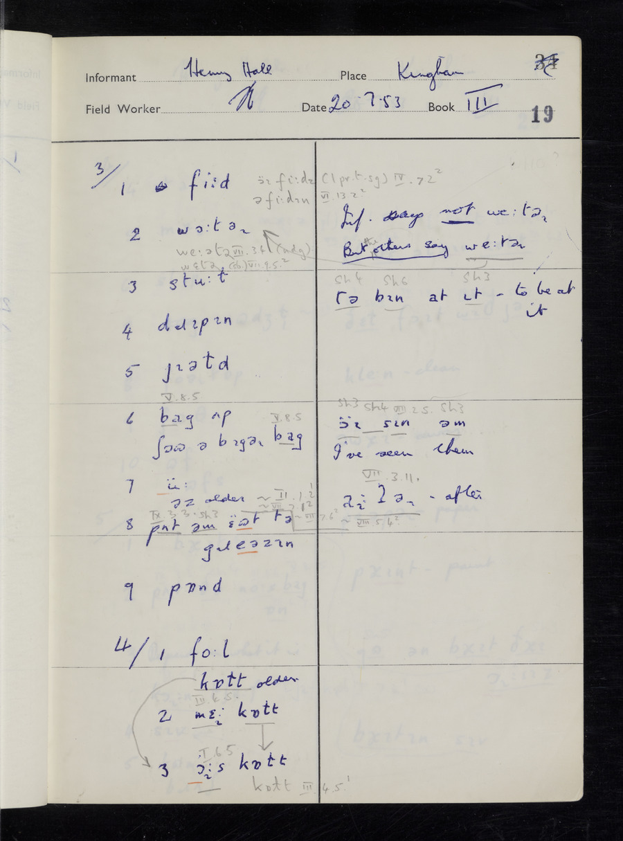 Interviews have been carried out by fieldworker Stanley Ellis. There are three informants for this response book - Henry Hall, Jim Andrews and Jack Marshall. Their responses can be found in the following books: Henry Hall - I, II, III Jim Andrews - IV, V, VI, VII, VIII Jack Marshall - IX
