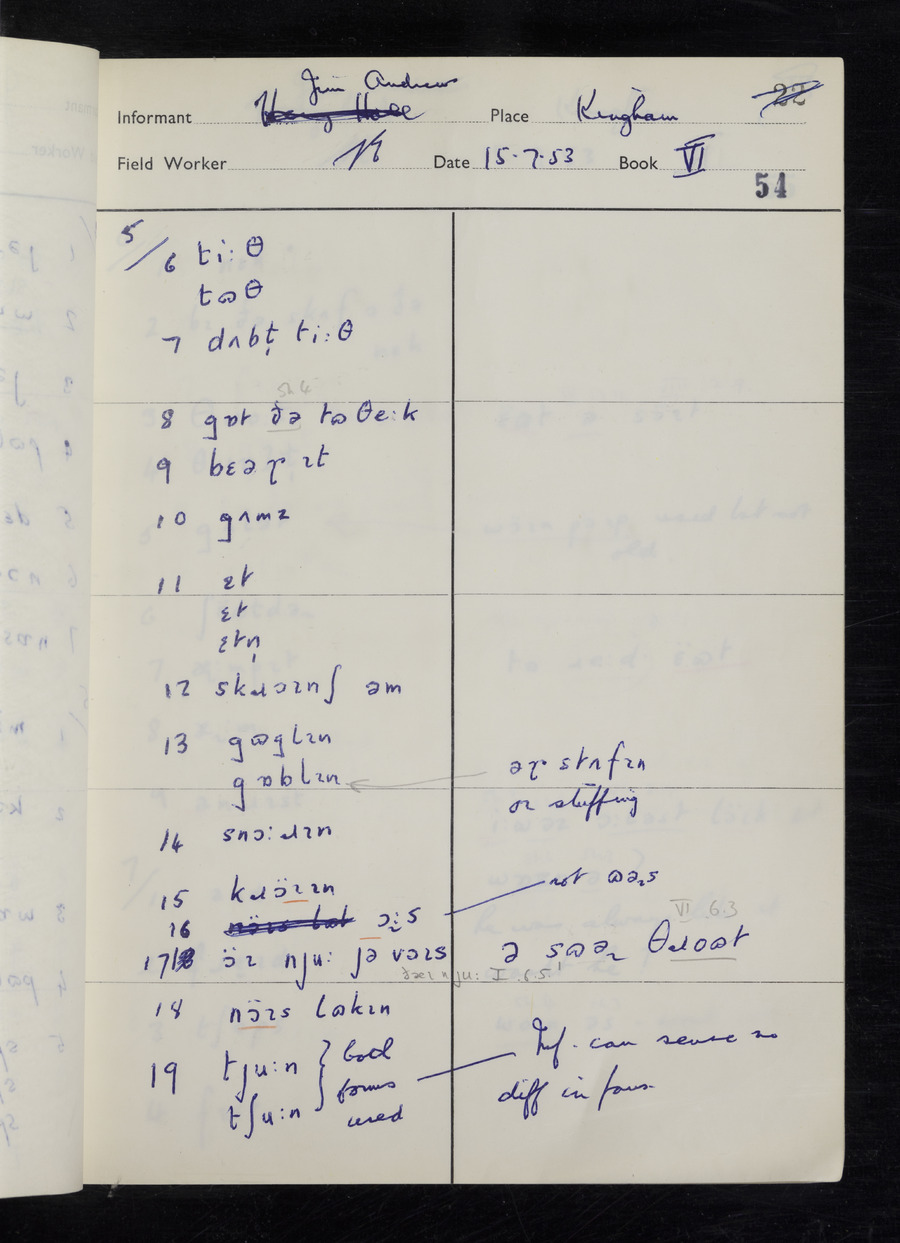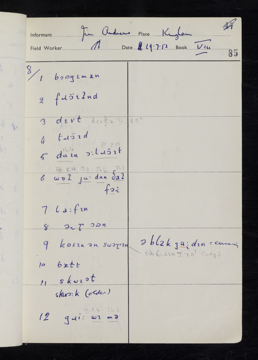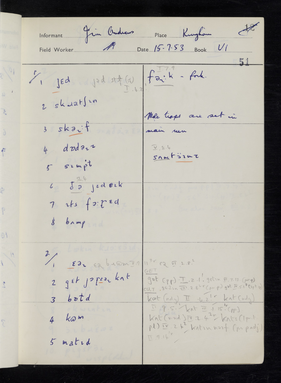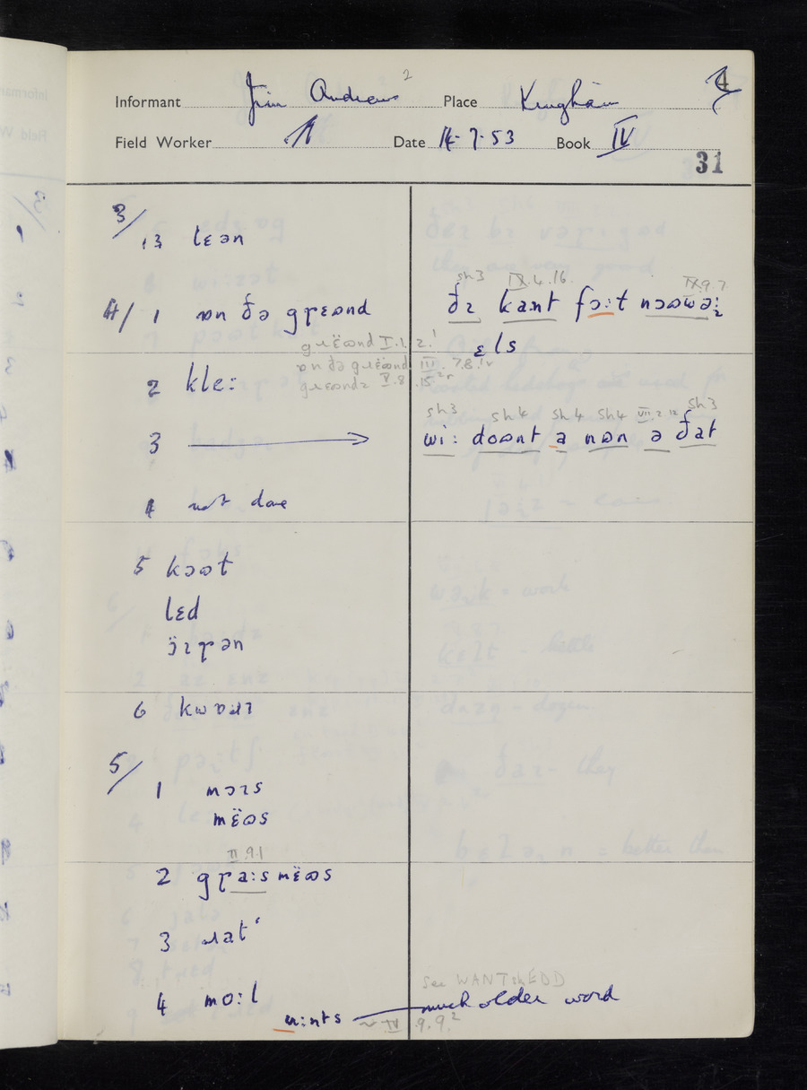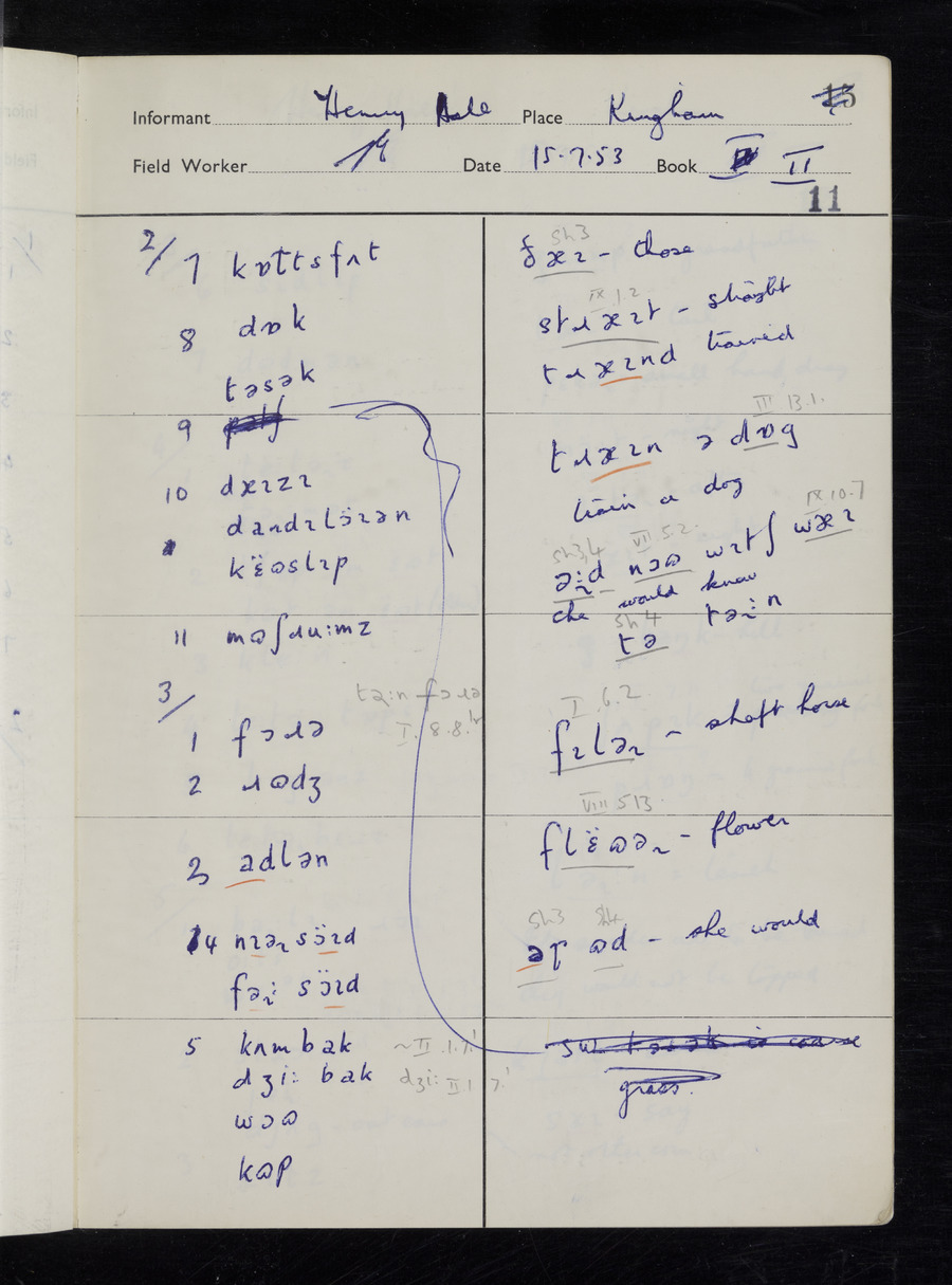 Interviews have been carried out by fieldworker Stanley Ellis. There are three informants for this response book - Henry Hall, Jim Andrews and Jack Marshall. Their responses can be found in the following books: Henry Hall - I, II, III Jim Andrews - IV, V, VI, VII, VIII Jack Marshall - IX
