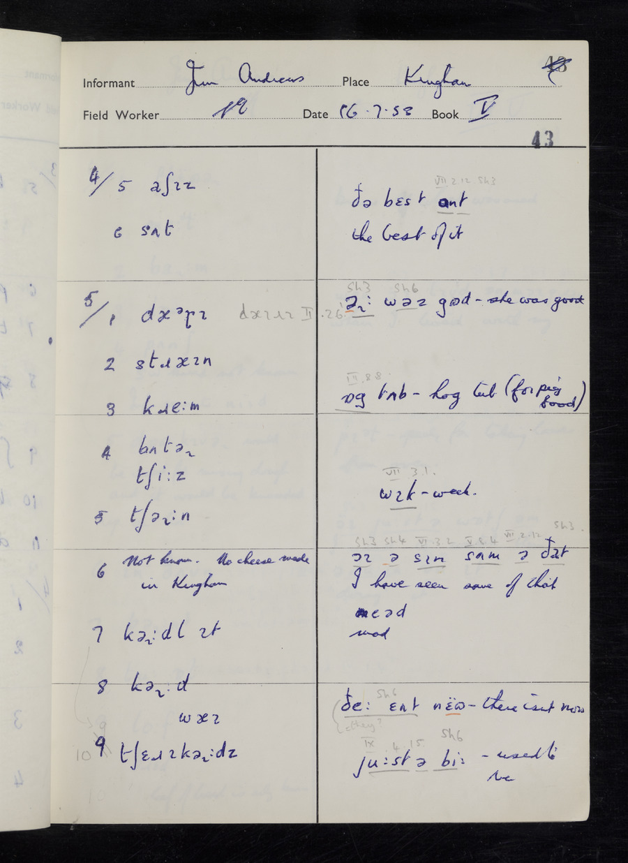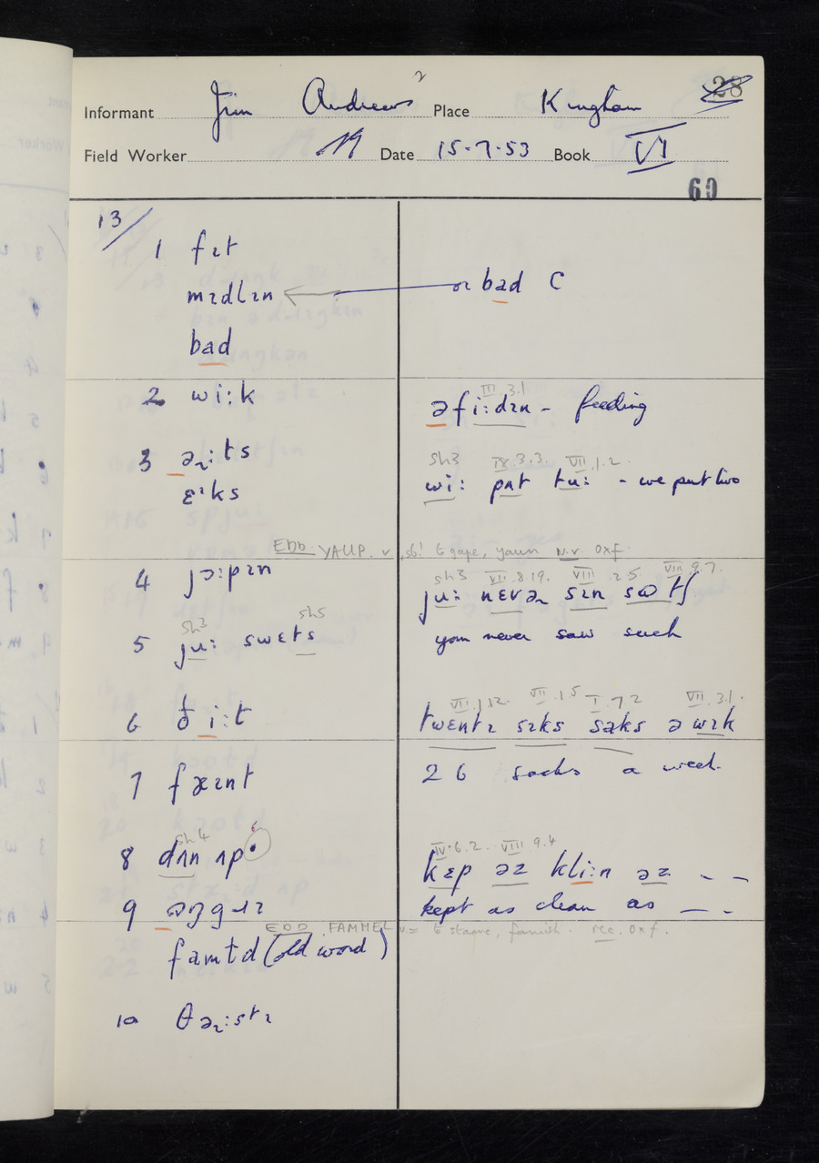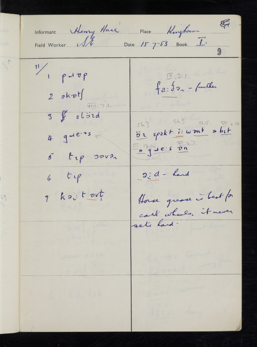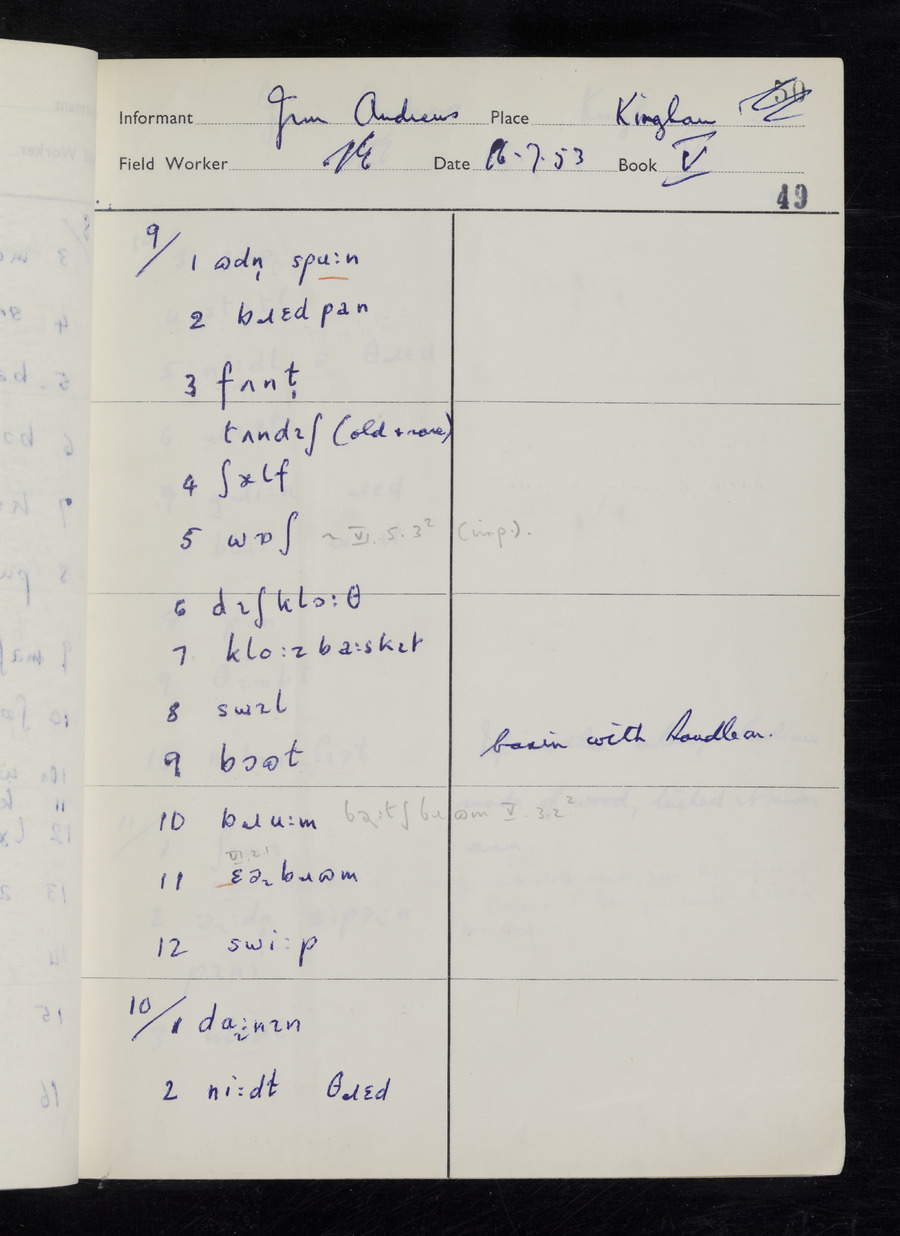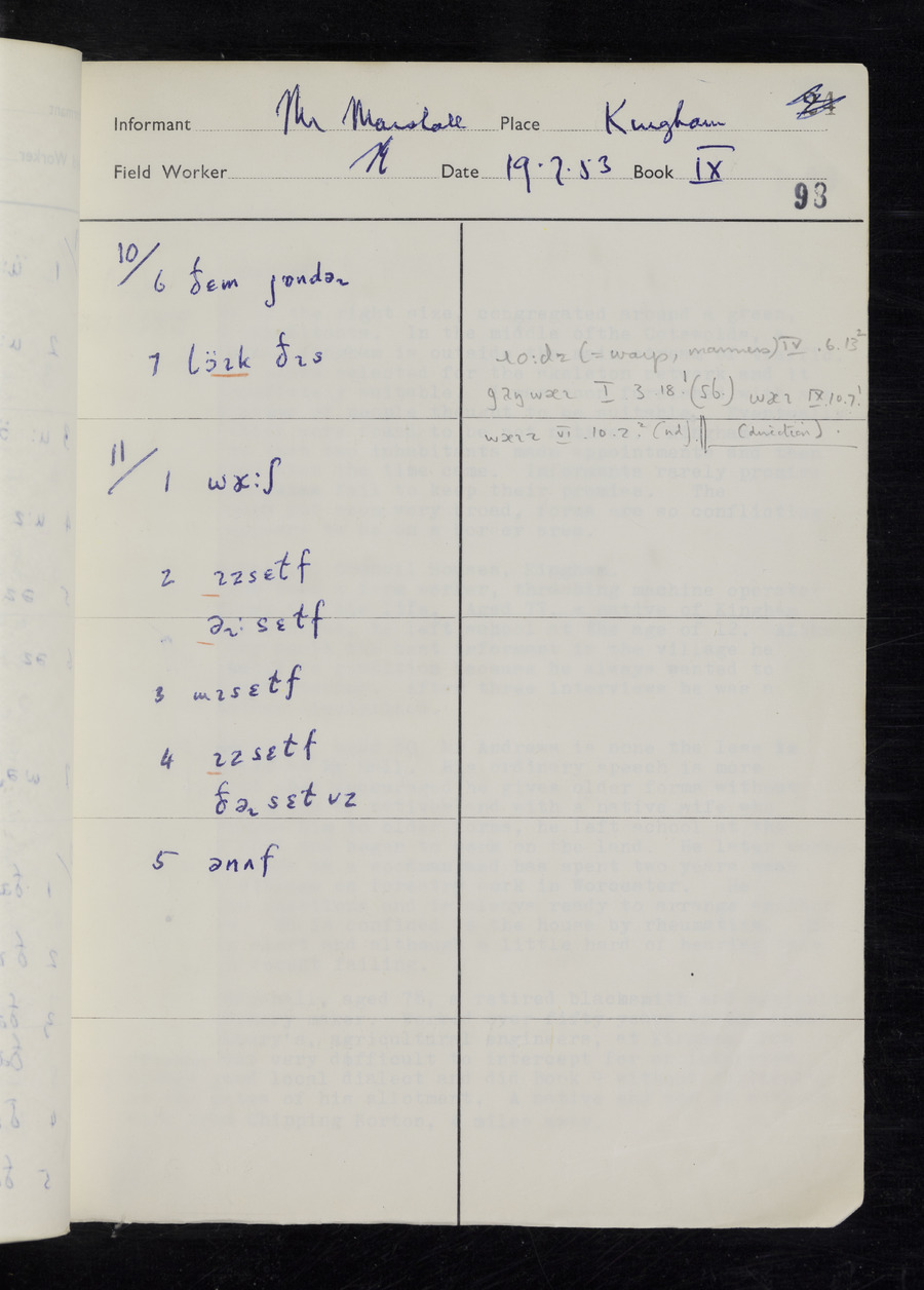 Response book recording the answers given by informants during the Survey of English Dialect. It includes 9 sections that cover a range of topics relating to work, domestic and social life. Answers are recorded in the International Phonetic Alphabet.
