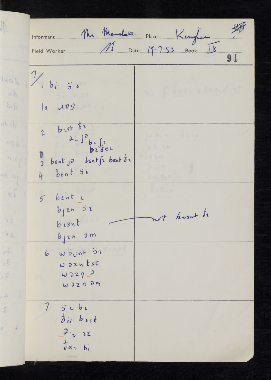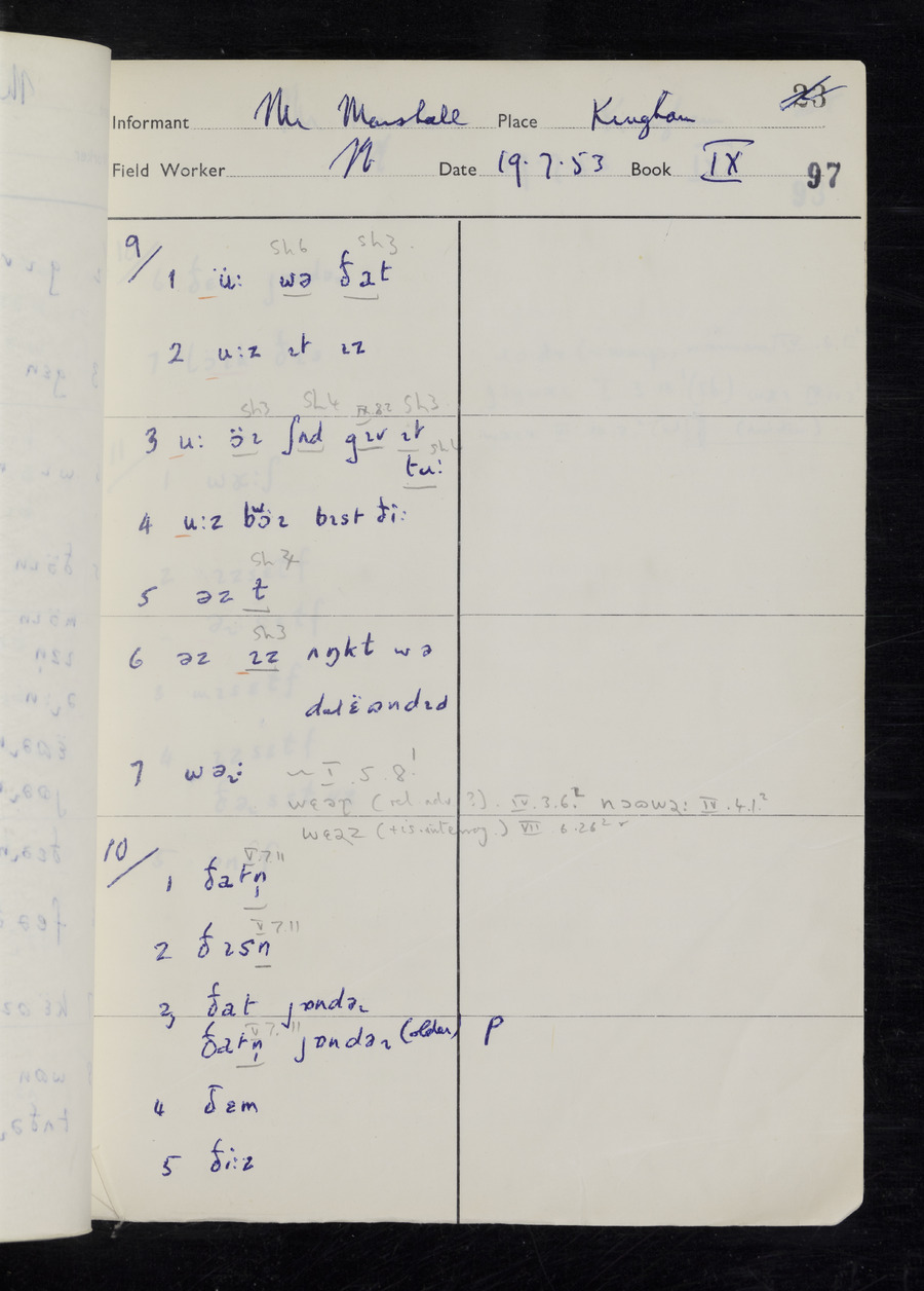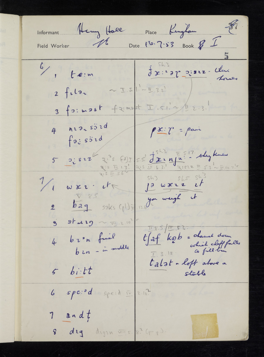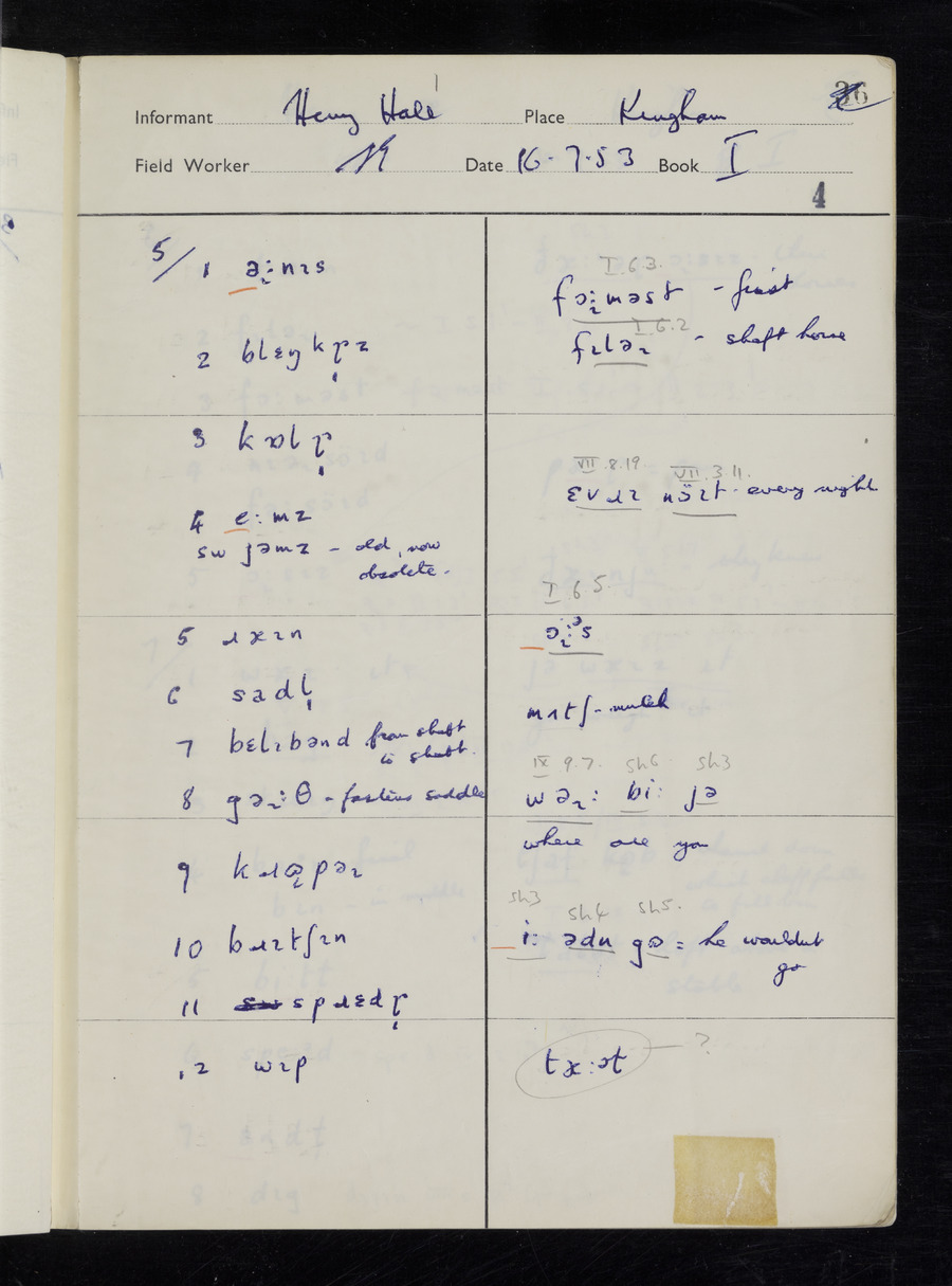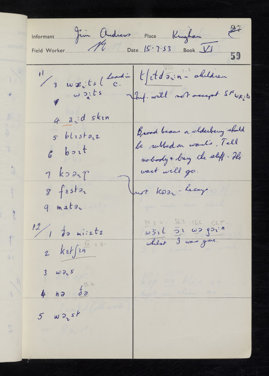 Response book recording the answers given by informants during the Survey of English Dialect. It includes 9 sections that cover a range of topics relating to work, domestic and social life. Answers are recorded in the International Phonetic Alphabet.