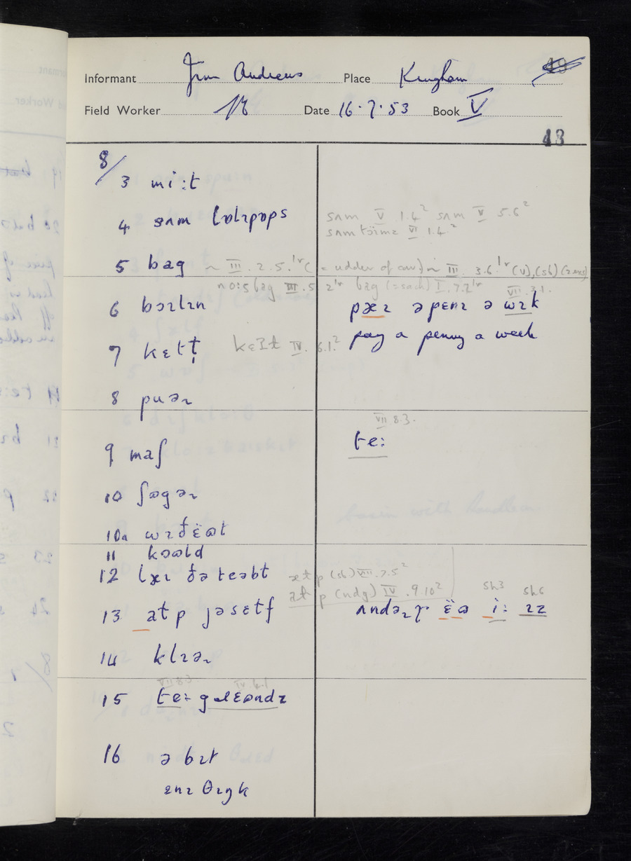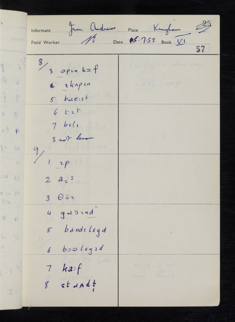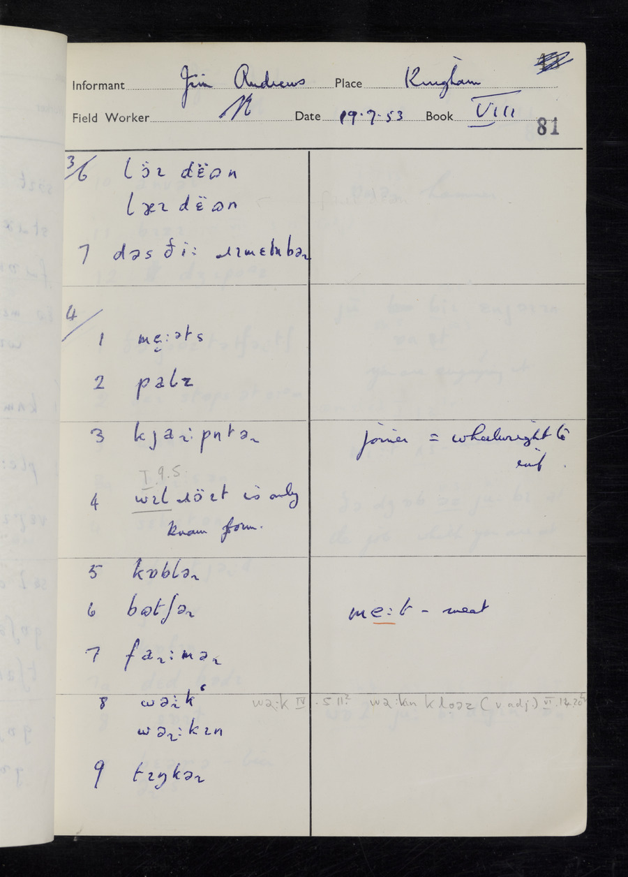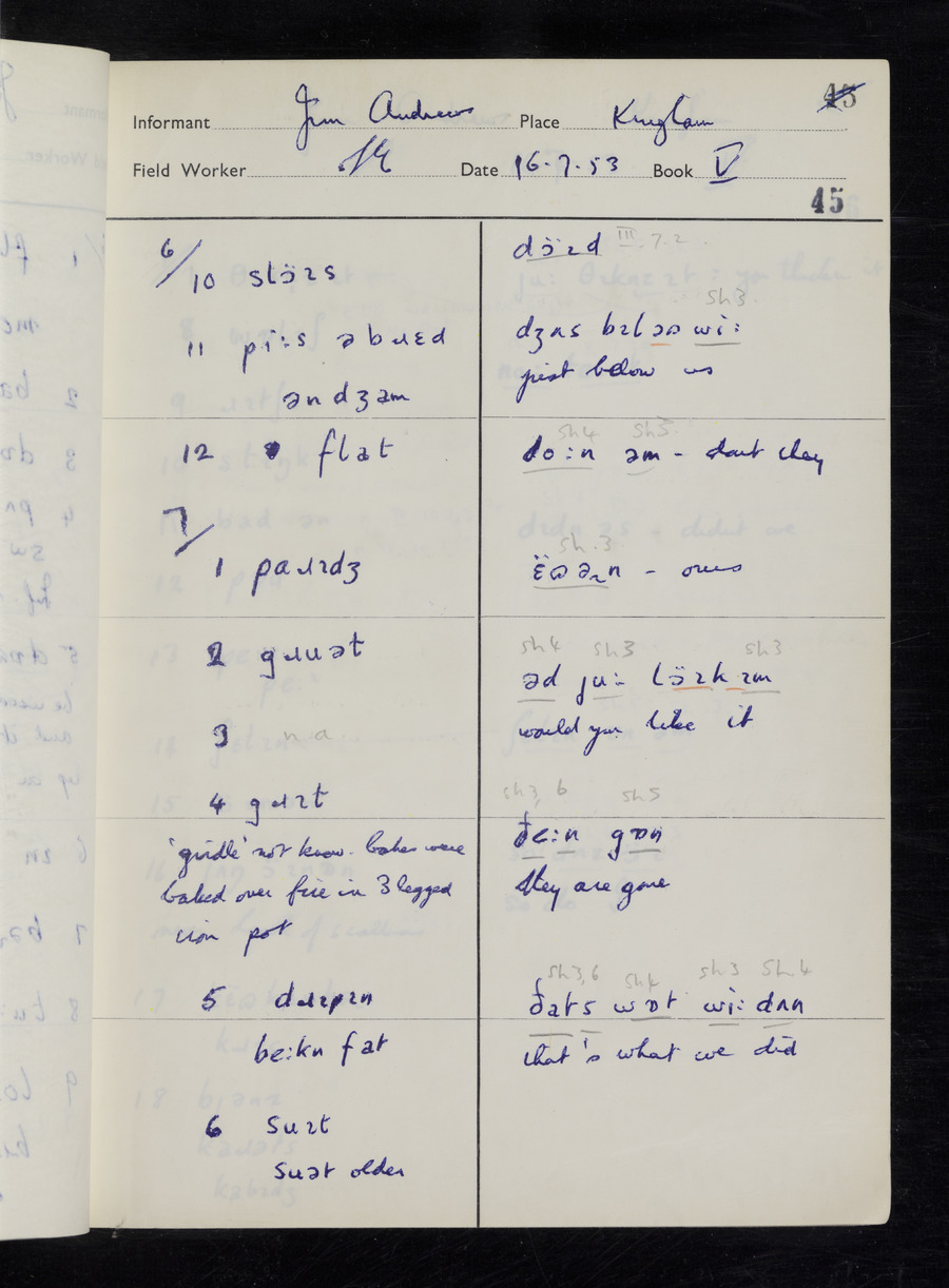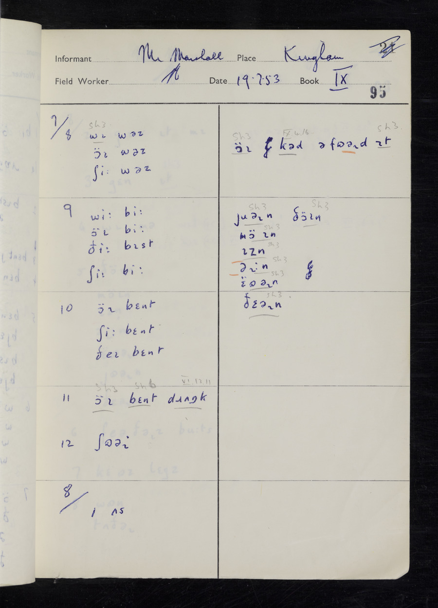 Response book recording the answers given by informants during the Survey of English Dialect. It includes 9 sections that cover a range of topics relating to work, domestic and social life. Answers are recorded in the International Phonetic Alphabet.