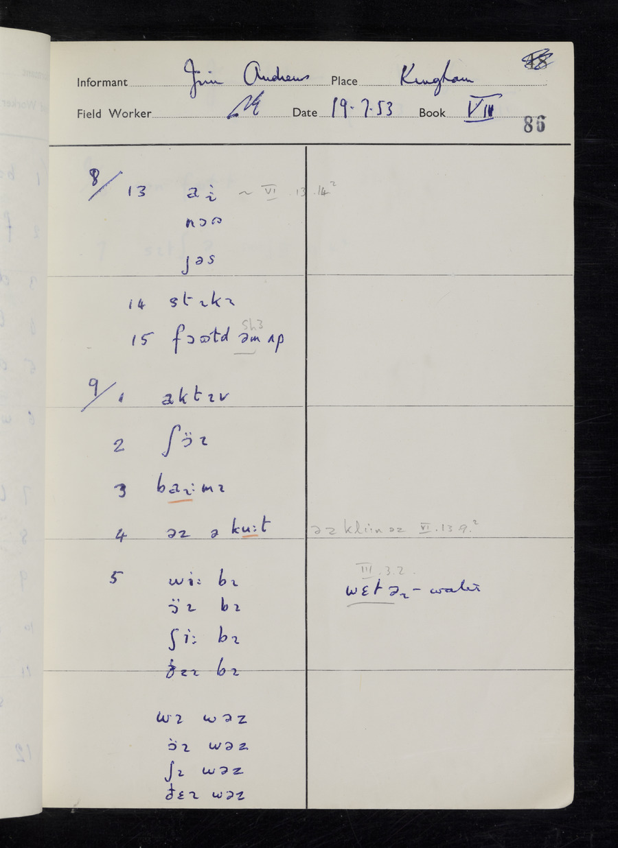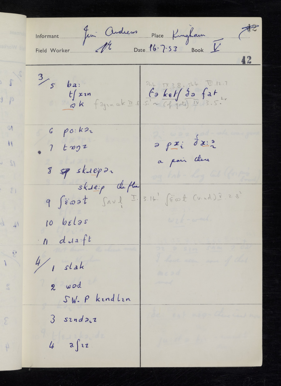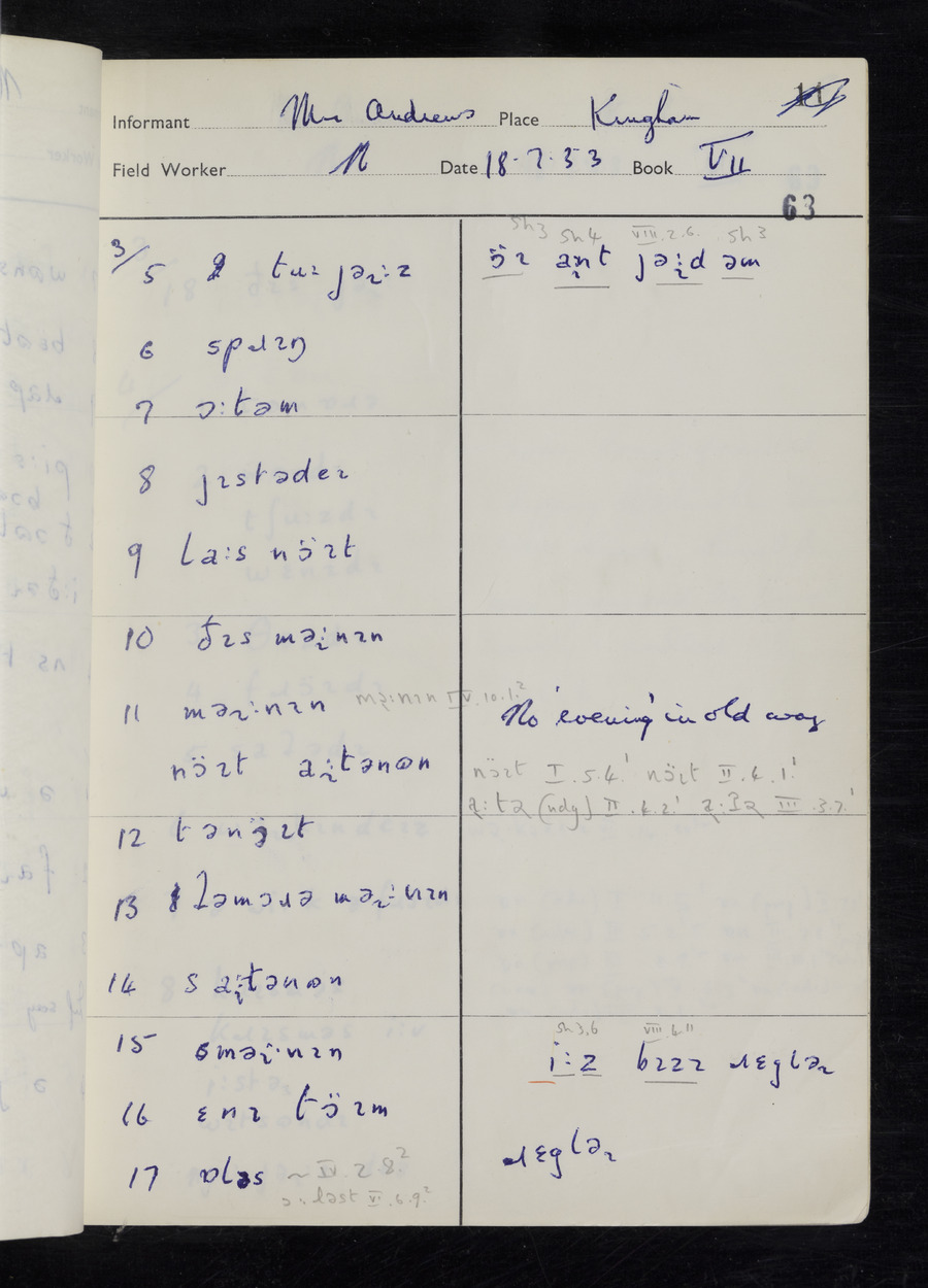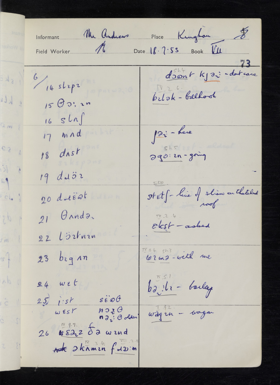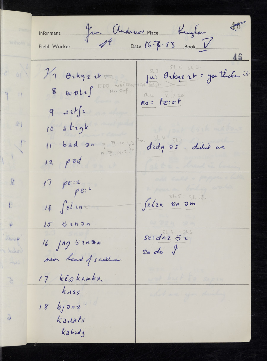 Response book recording the answers given by informants during the Survey of English Dialect. It includes 9 sections that cover a range of topics relating to work, domestic and social life. Answers are recorded in the International Phonetic Alphabet.