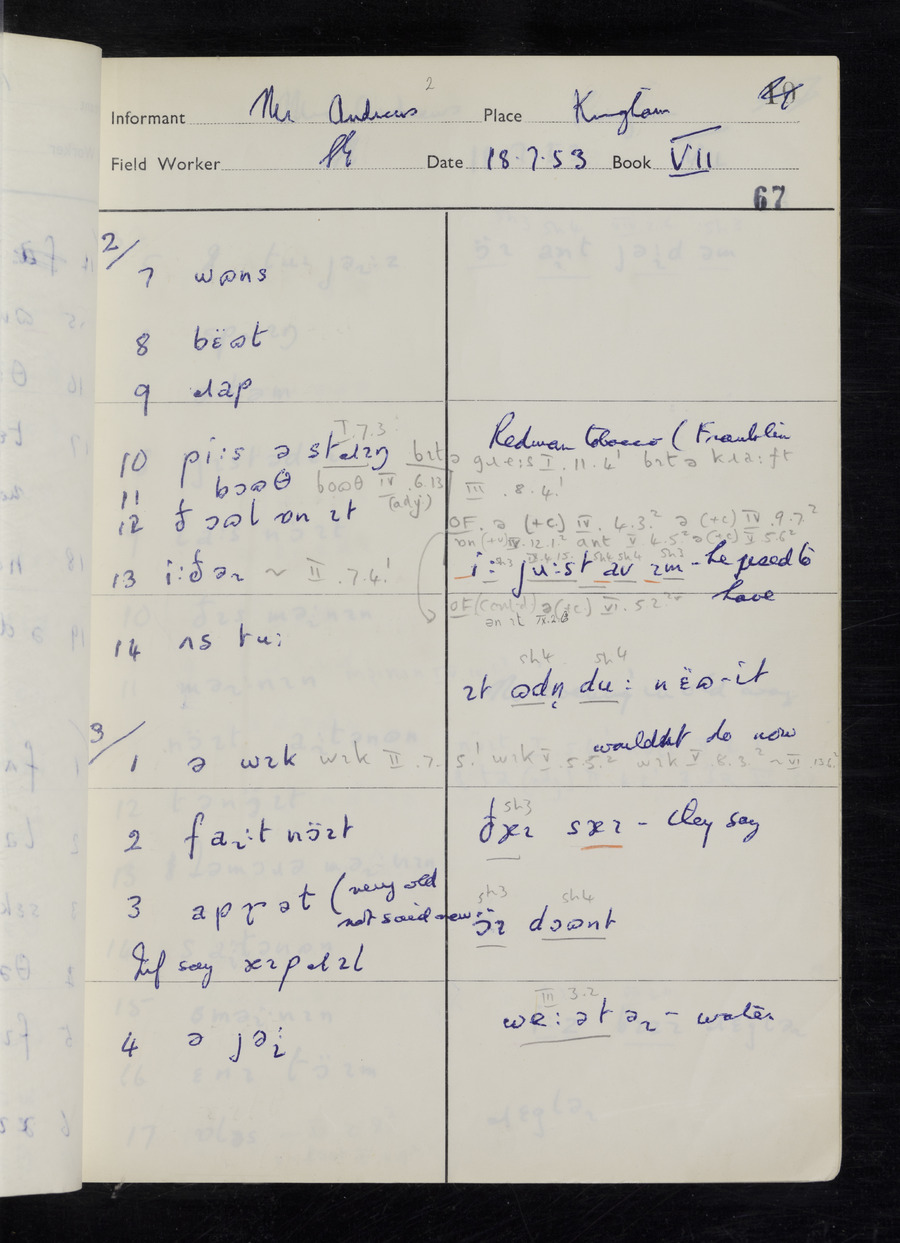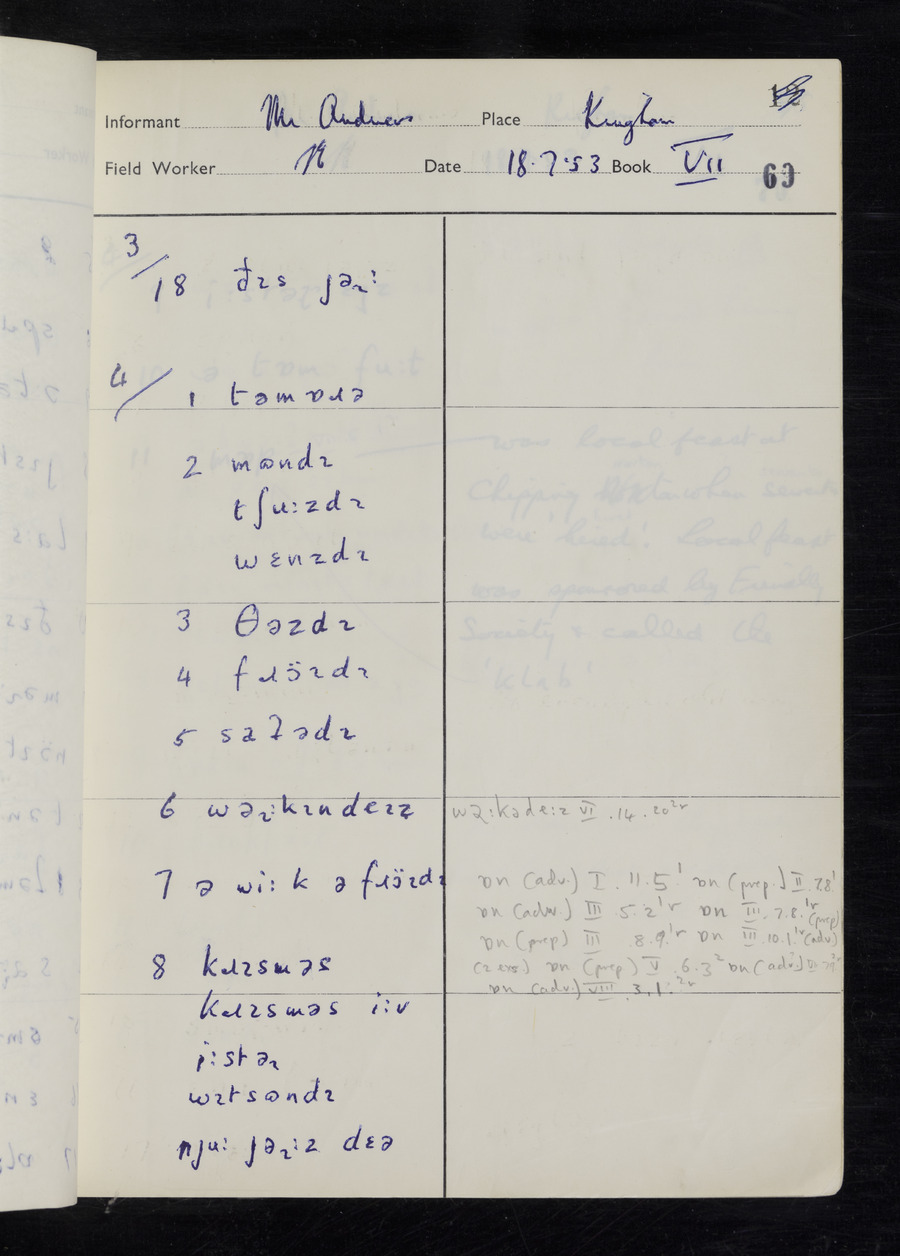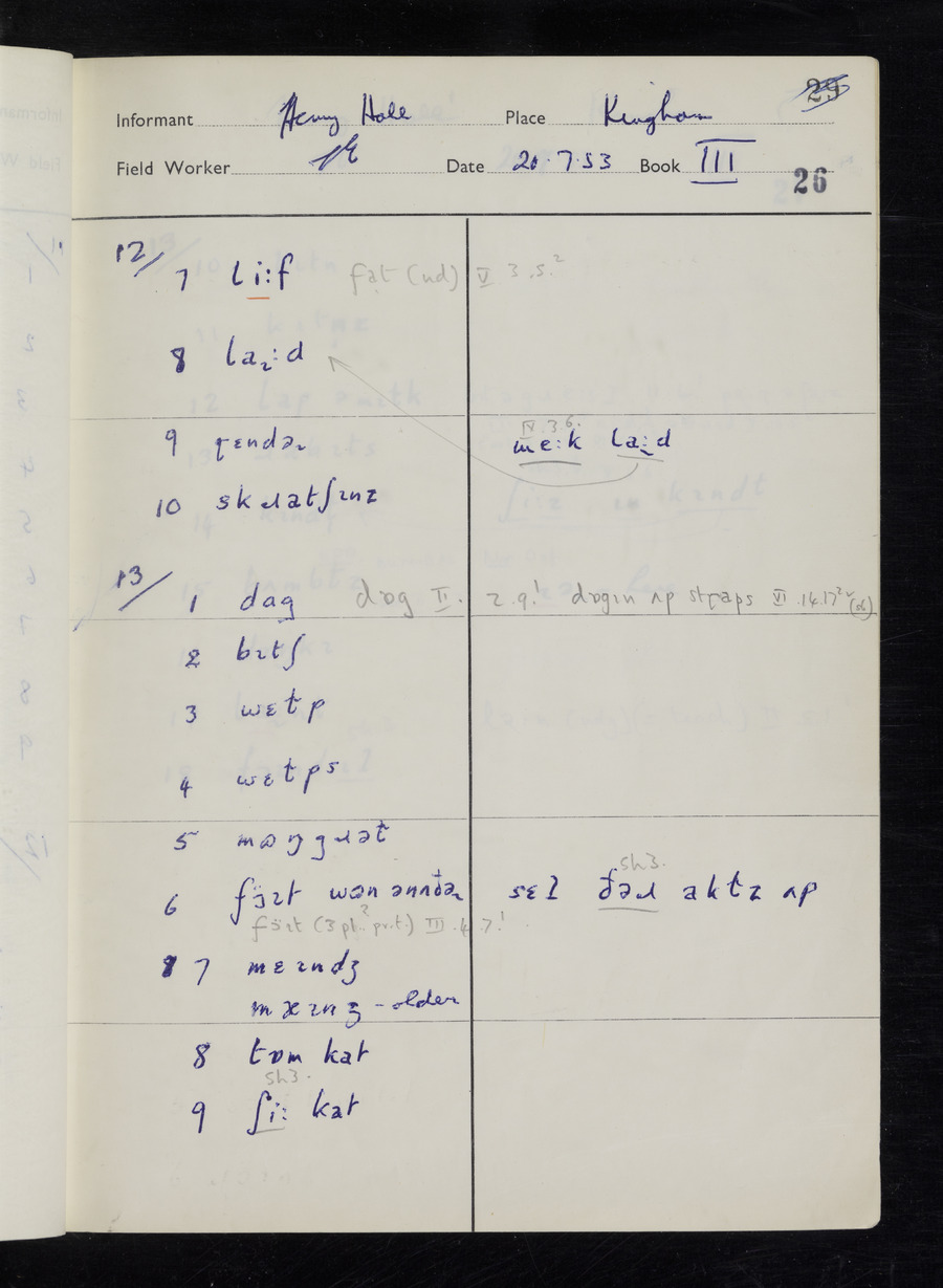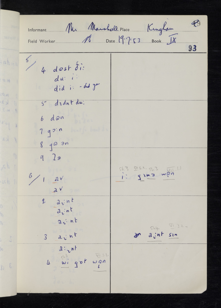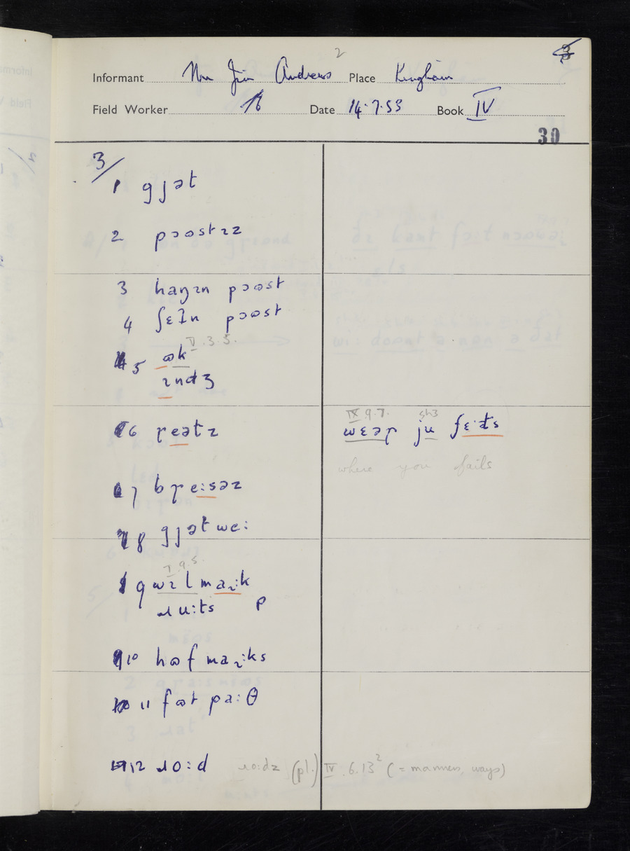 Response book recording the answers given by informants during the Survey of English Dialect. It includes 9 sections that cover a range of topics relating to work, domestic and social life. Answers are recorded in the International Phonetic Alphabet.