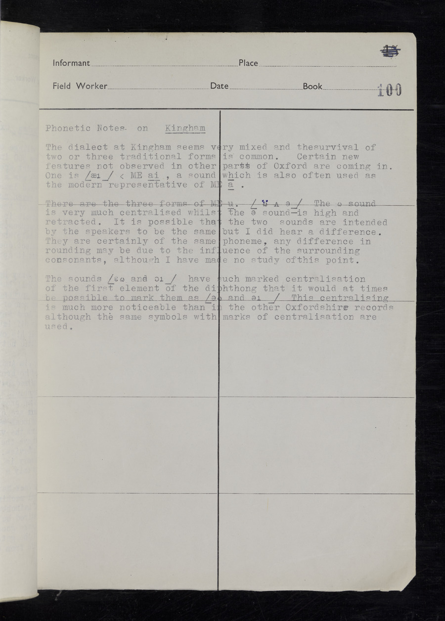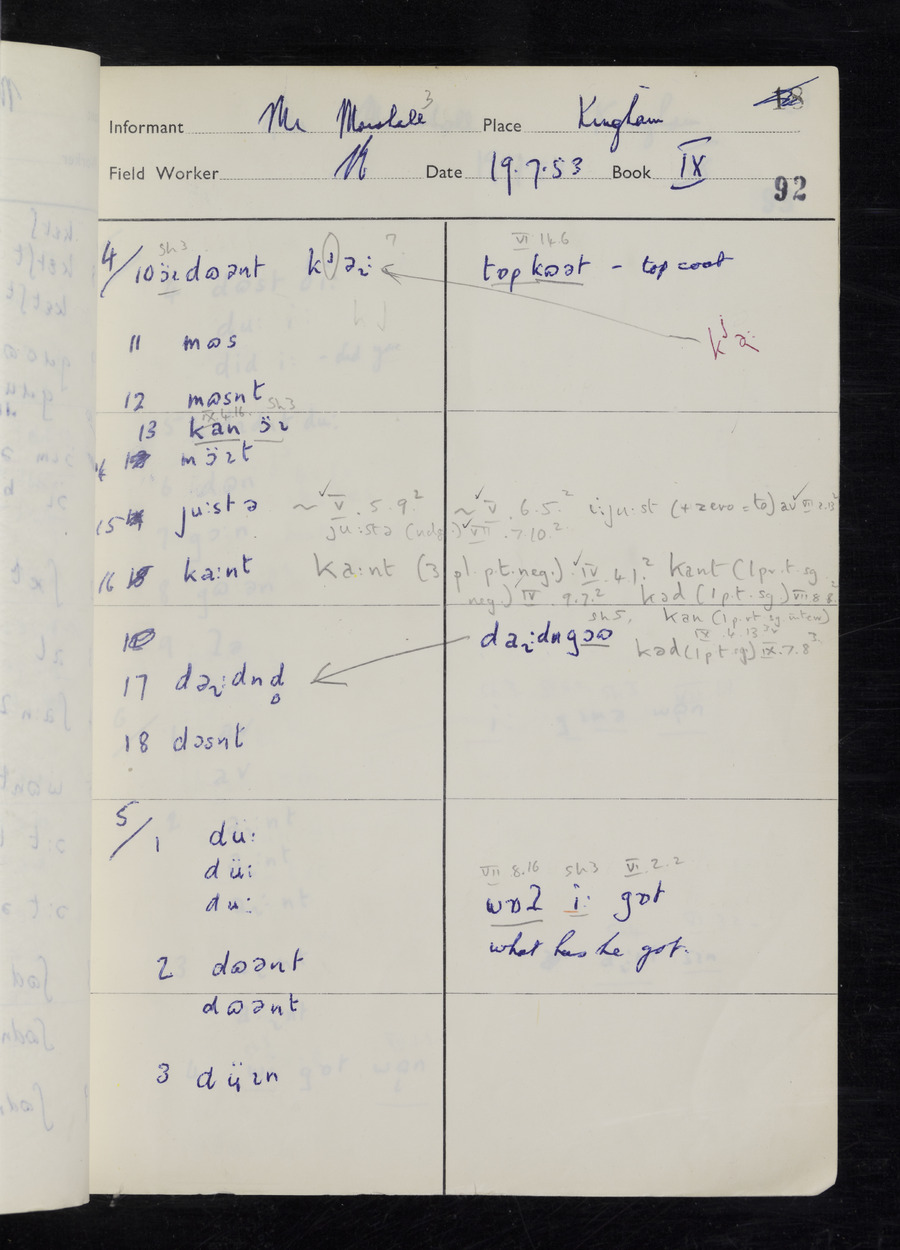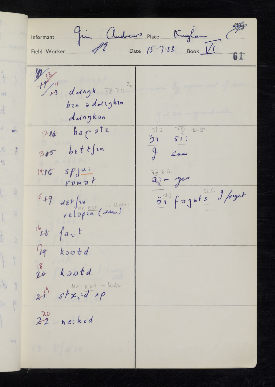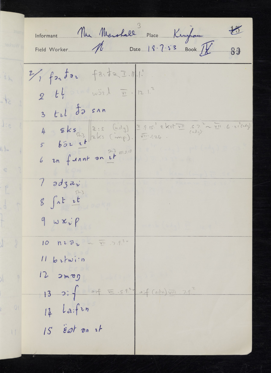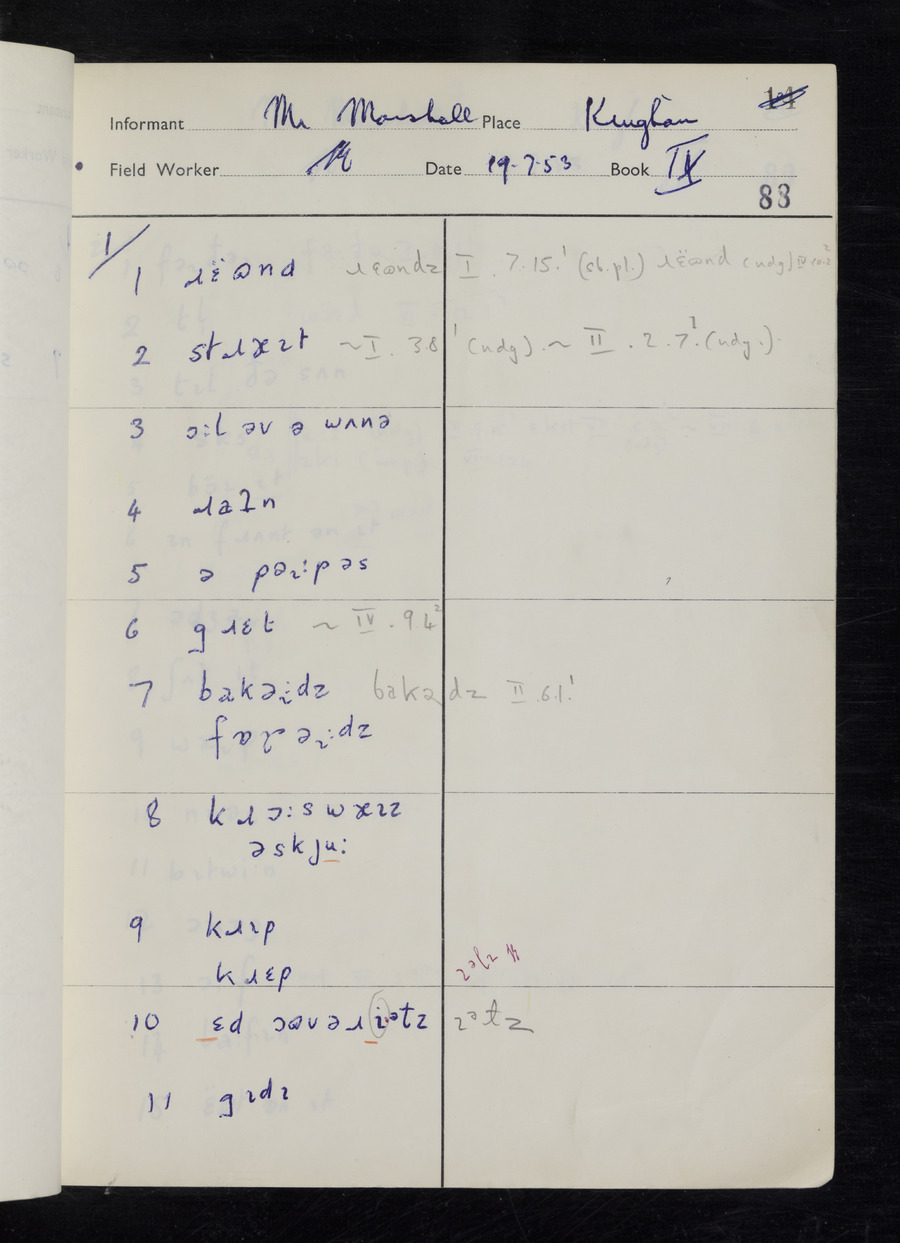 Response book recording the answers given by informants during the Survey of English Dialect. It includes 9 sections that cover a range of topics relating to work, domestic and social life. Answers are recorded in the International Phonetic Alphabet.