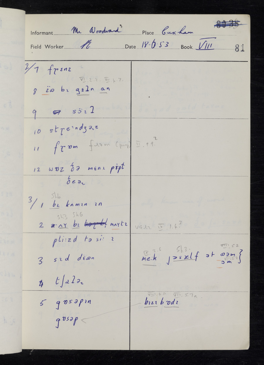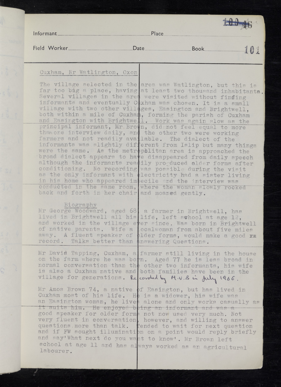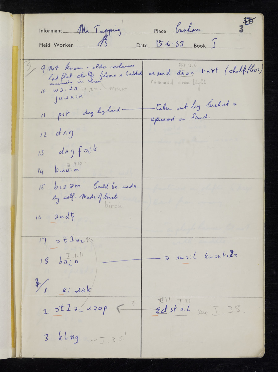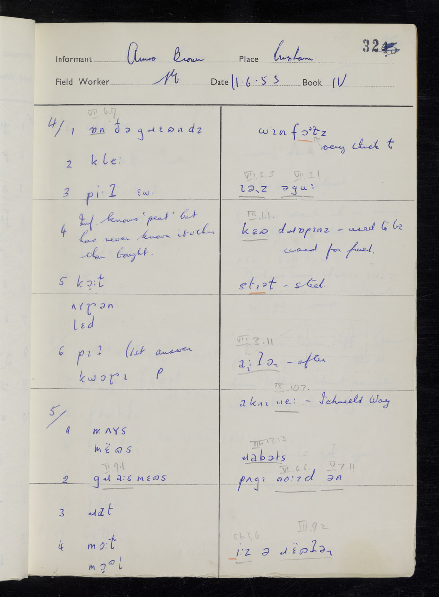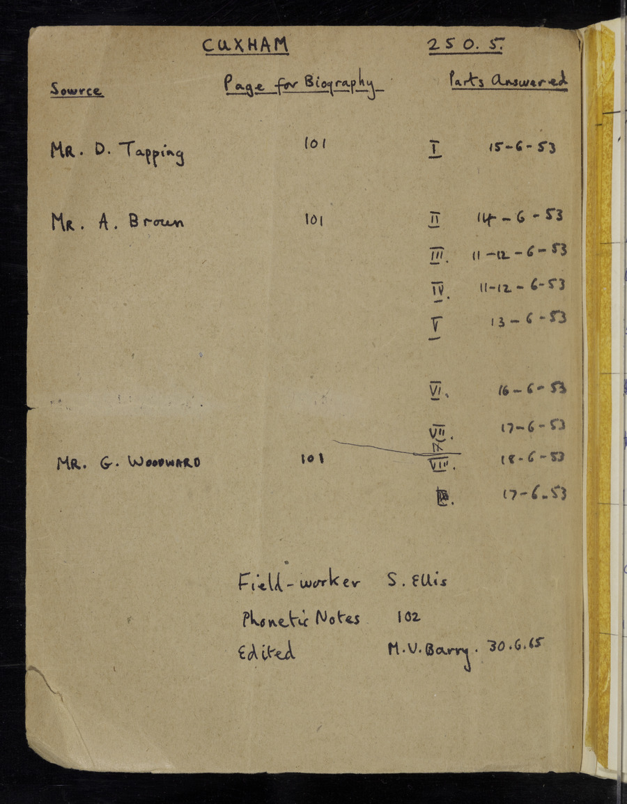 Interviews have been carried out by fieldworker Stanley Ellis. There are three informants for this response book - David Tapping, Amos Brown and George Woodward. Their responses can be found in the following books: David Tapping - I Amos Brown - II, III, IV, V, VI, VII, IX George Woodward - VIII