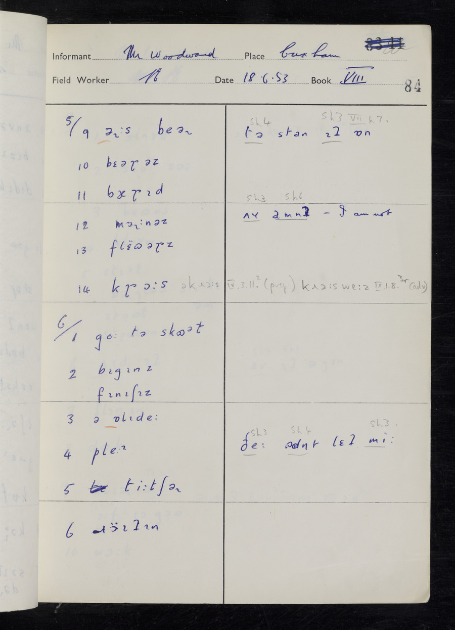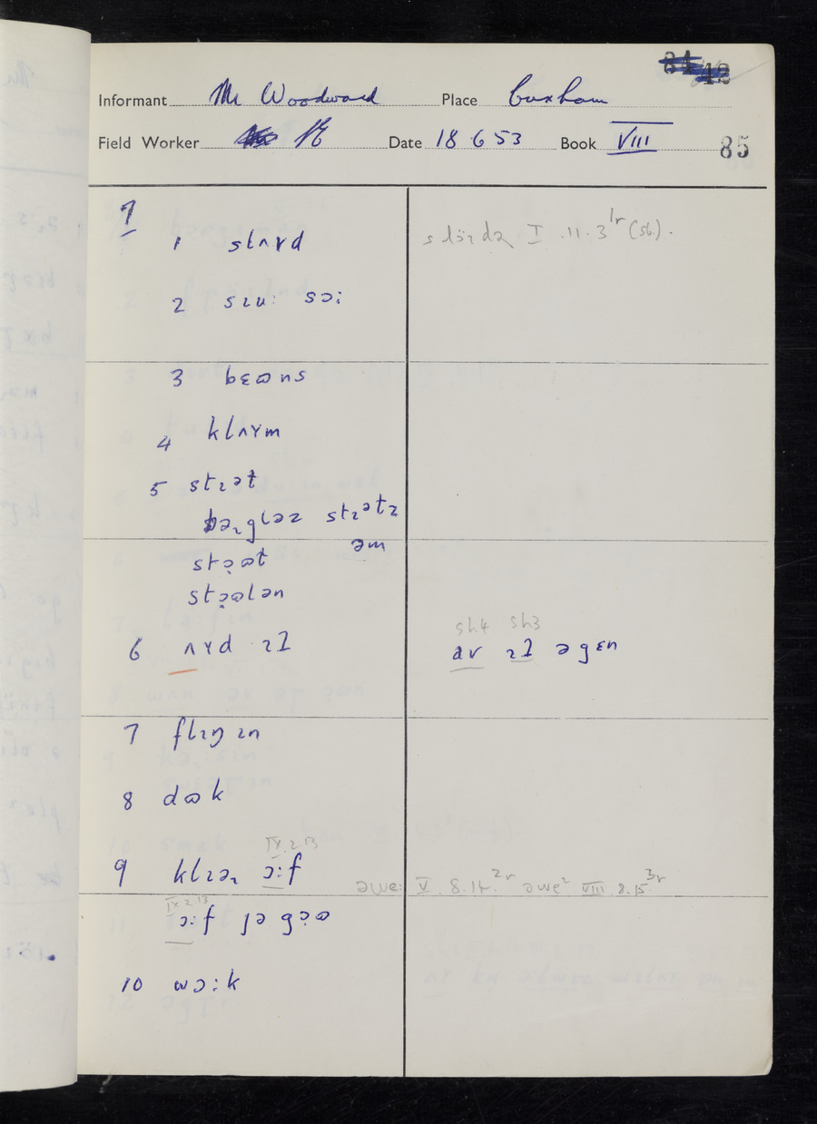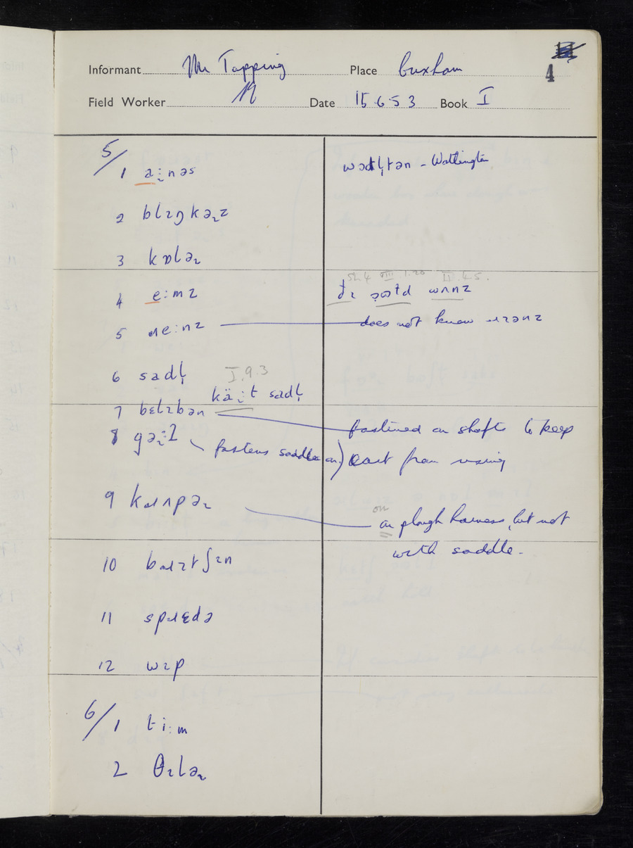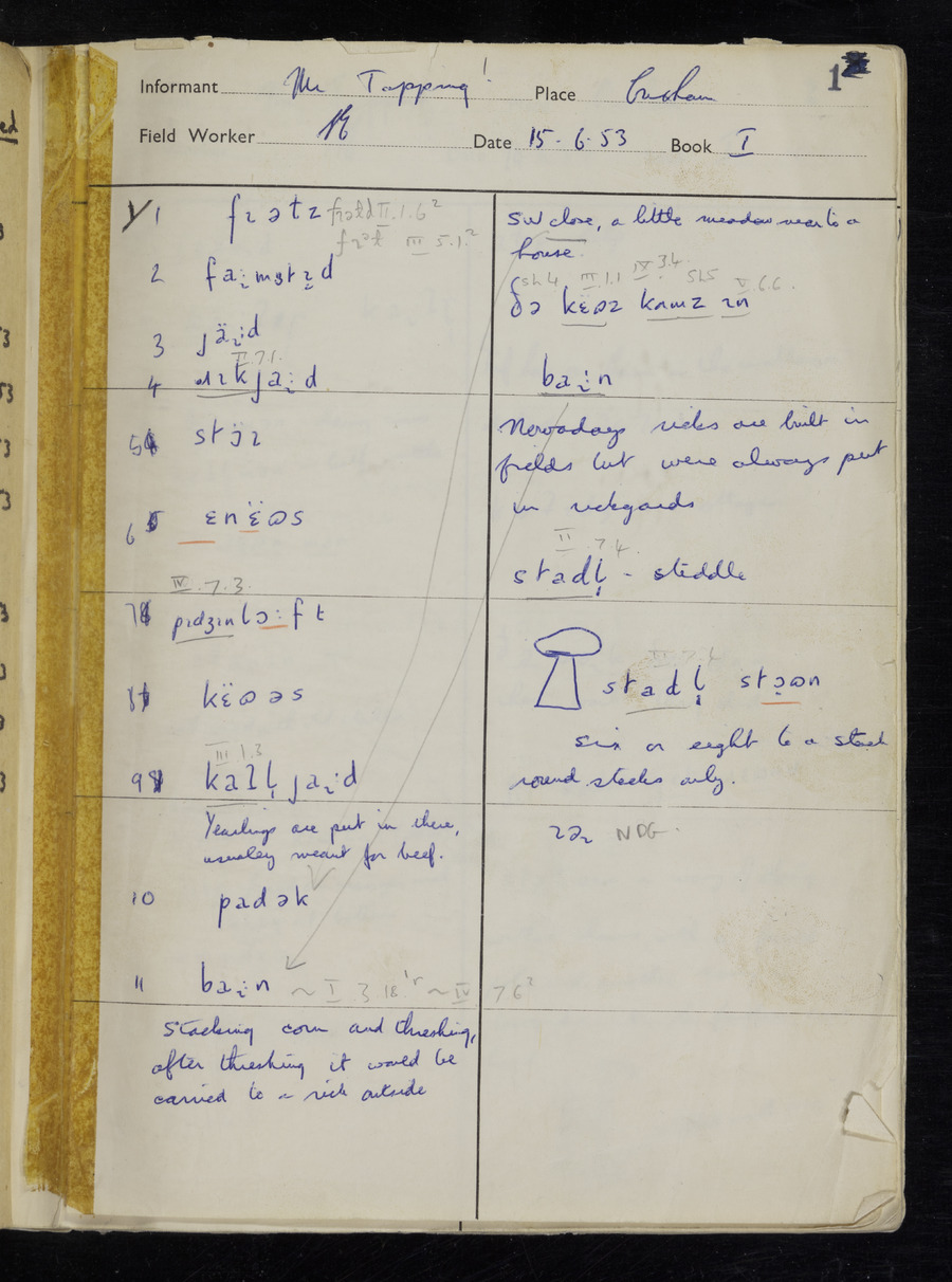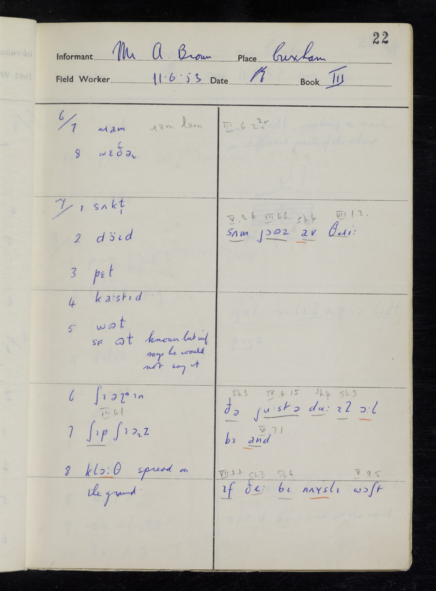 Interviews have been carried out by fieldworker Stanley Ellis. There are three informants for this response book - David Tapping, Amos Brown and George Woodward. Their responses can be found in the following books: David Tapping - I Amos Brown - II, III, IV, V, VI, VII, IX George Woodward - VIII