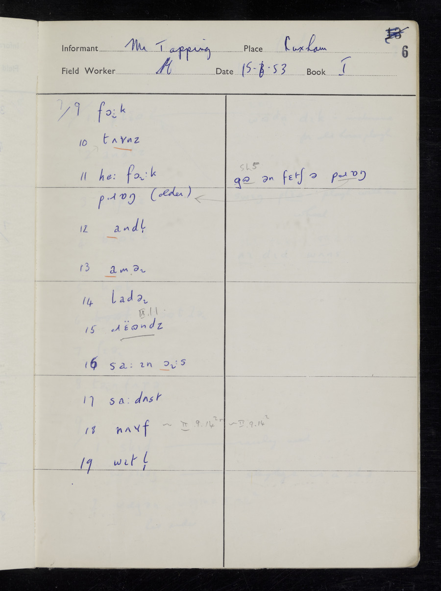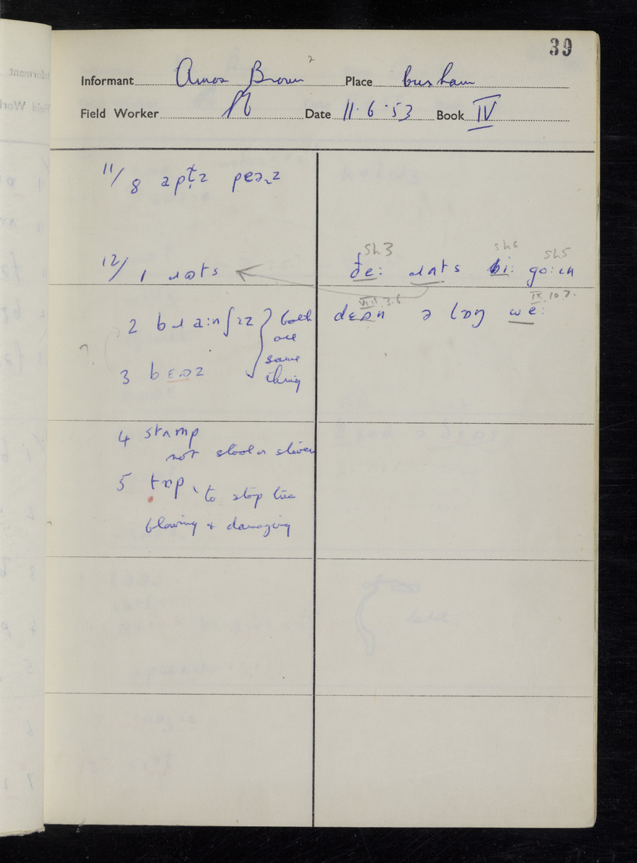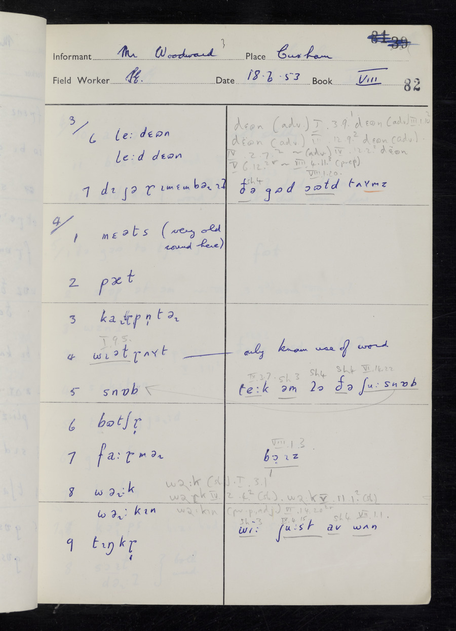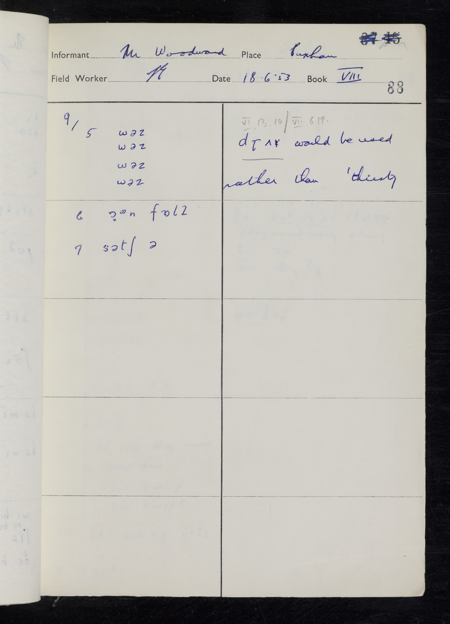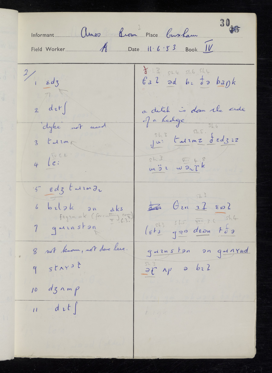Interviews have been carried out by fieldworker Stanley Ellis. There are three informants for this response book - David Tapping, Amos Brown and George Woodward. Their responses can be found in the following books: David Tapping - I Amos Brown - II, III, IV, V, VI, VII, IX George Woodward - VIII