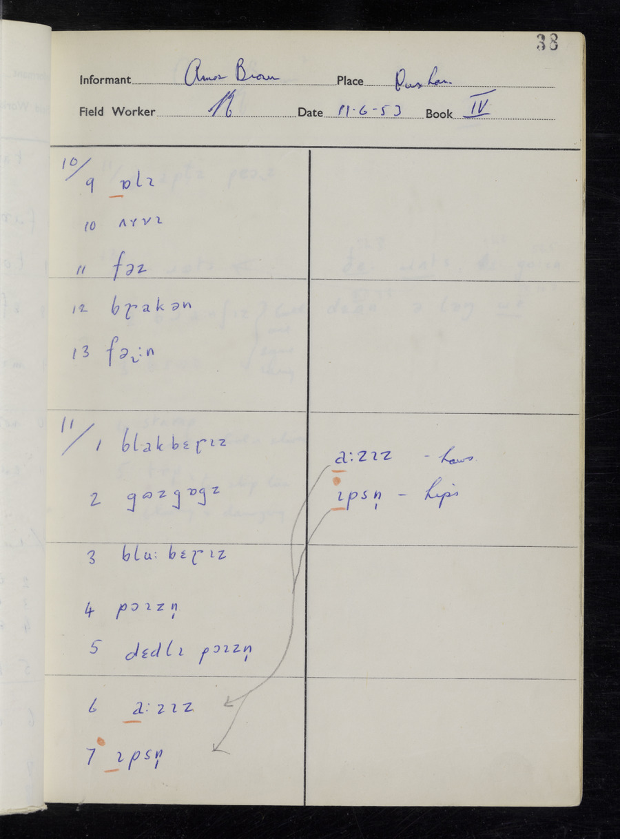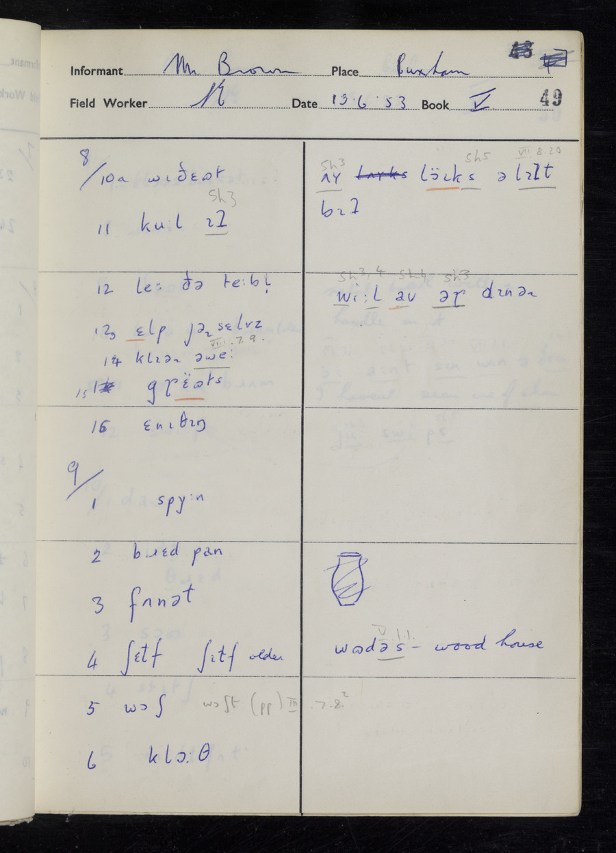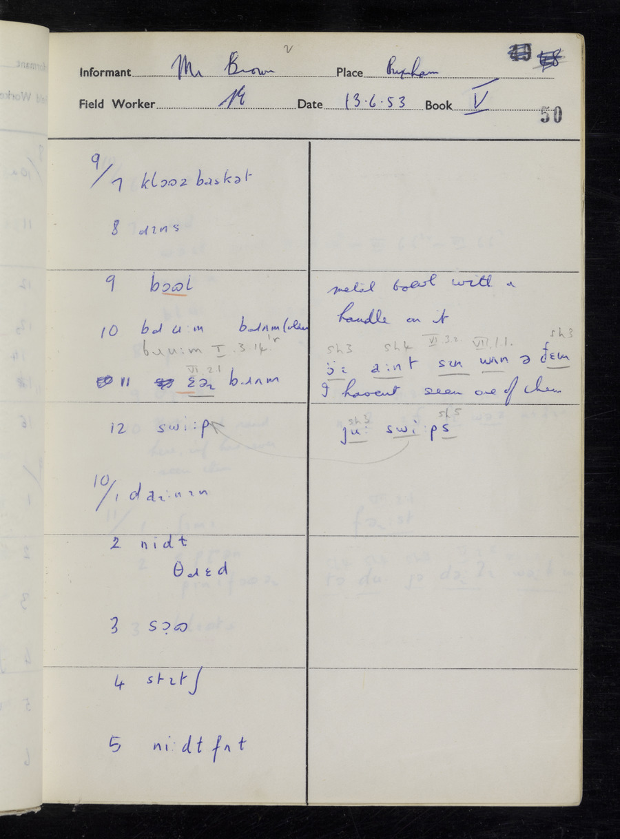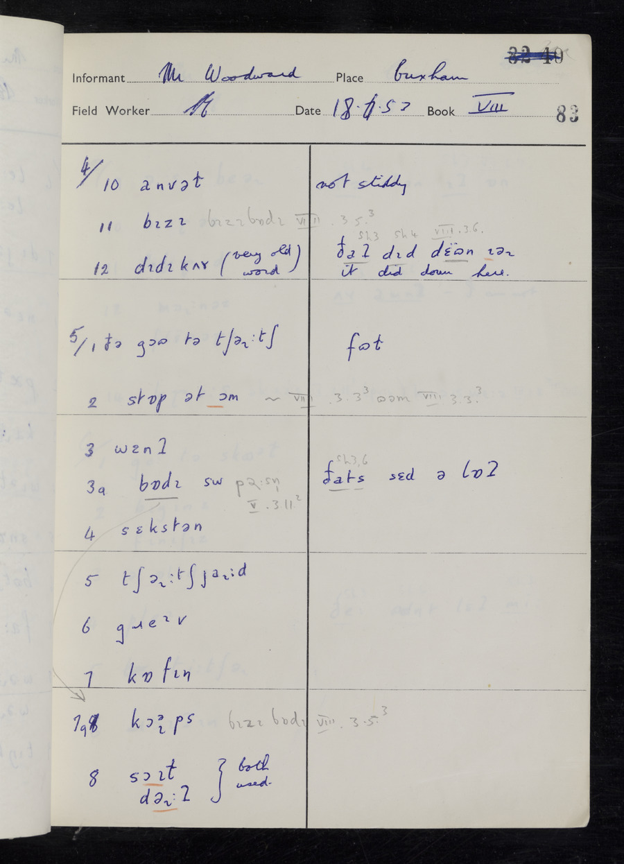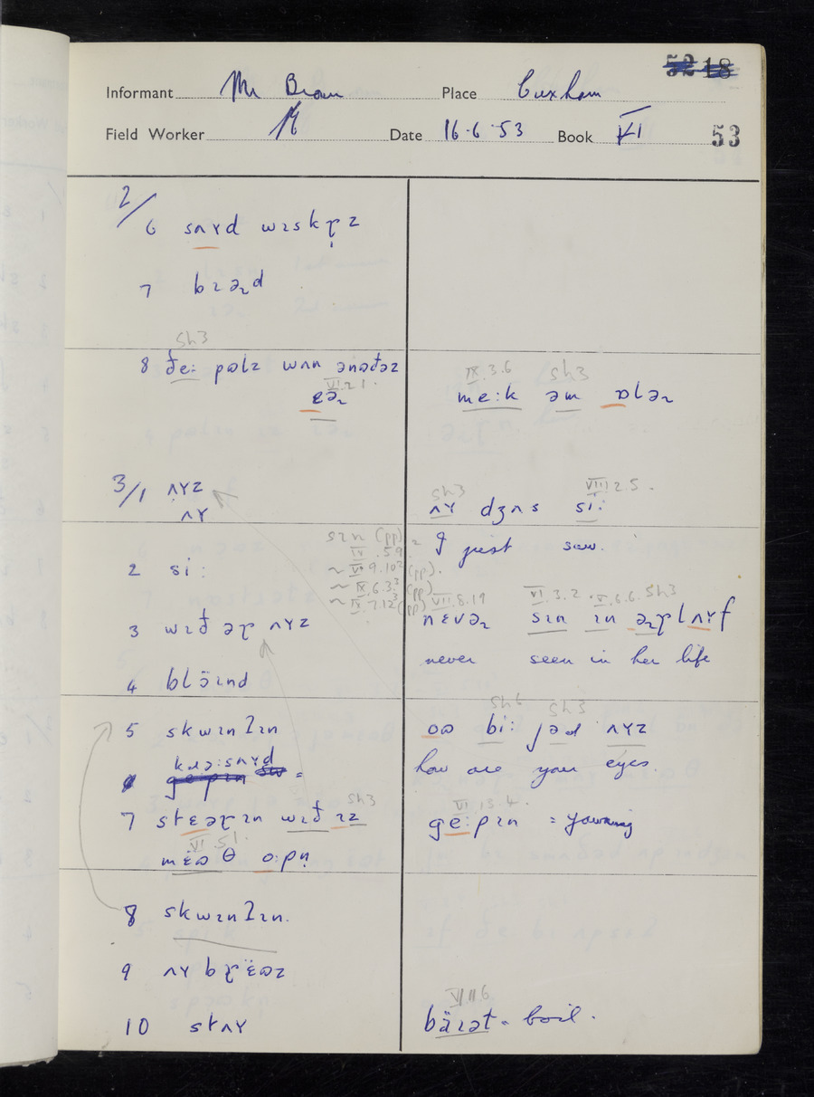 Interviews have been carried out by fieldworker Stanley Ellis. There are three informants for this response book - David Tapping, Amos Brown and George Woodward. Their responses can be found in the following books: David Tapping - I Amos Brown - II, III, IV, V, VI, VII, IX George Woodward - VIII