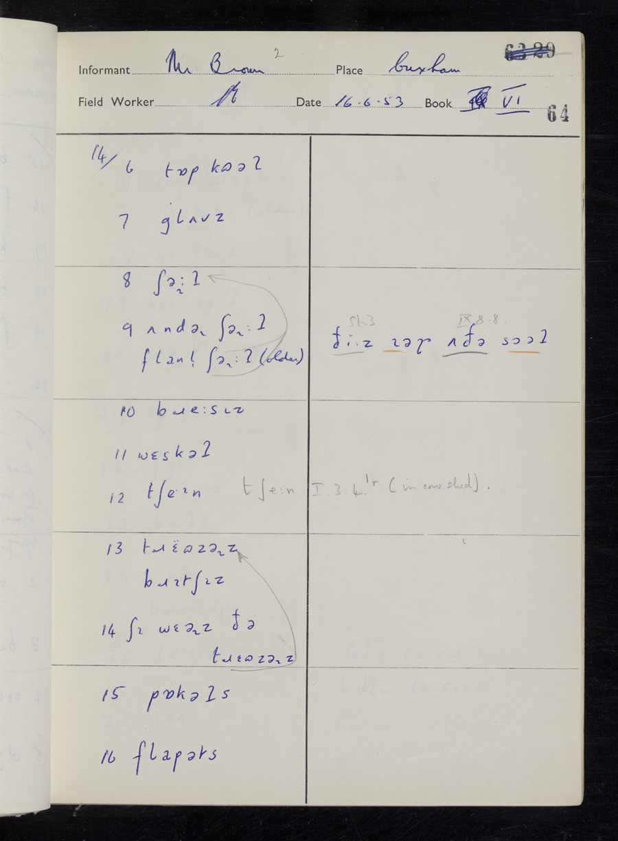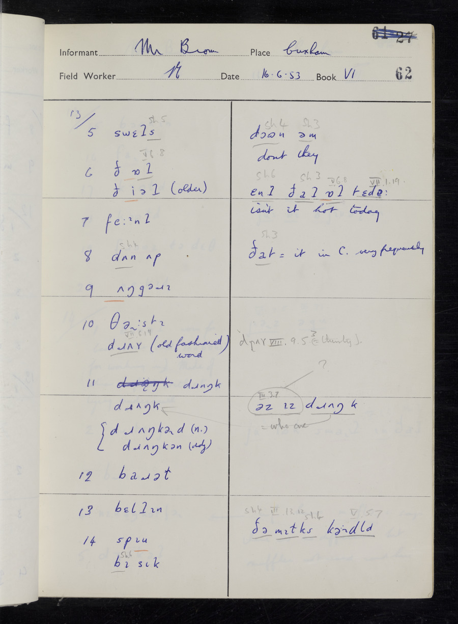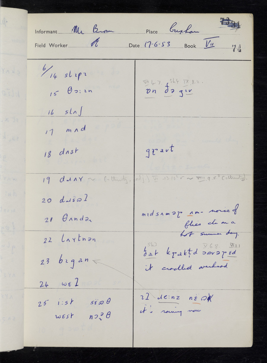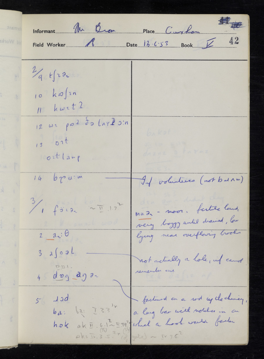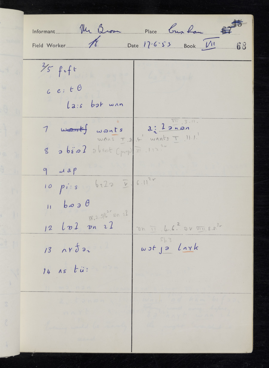 Interviews have been carried out by fieldworker Stanley Ellis. There are three informants for this response book - David Tapping, Amos Brown and George Woodward. Their responses can be found in the following books: David Tapping - I Amos Brown - II, III, IV, V, VI, VII, IX George Woodward - VIII