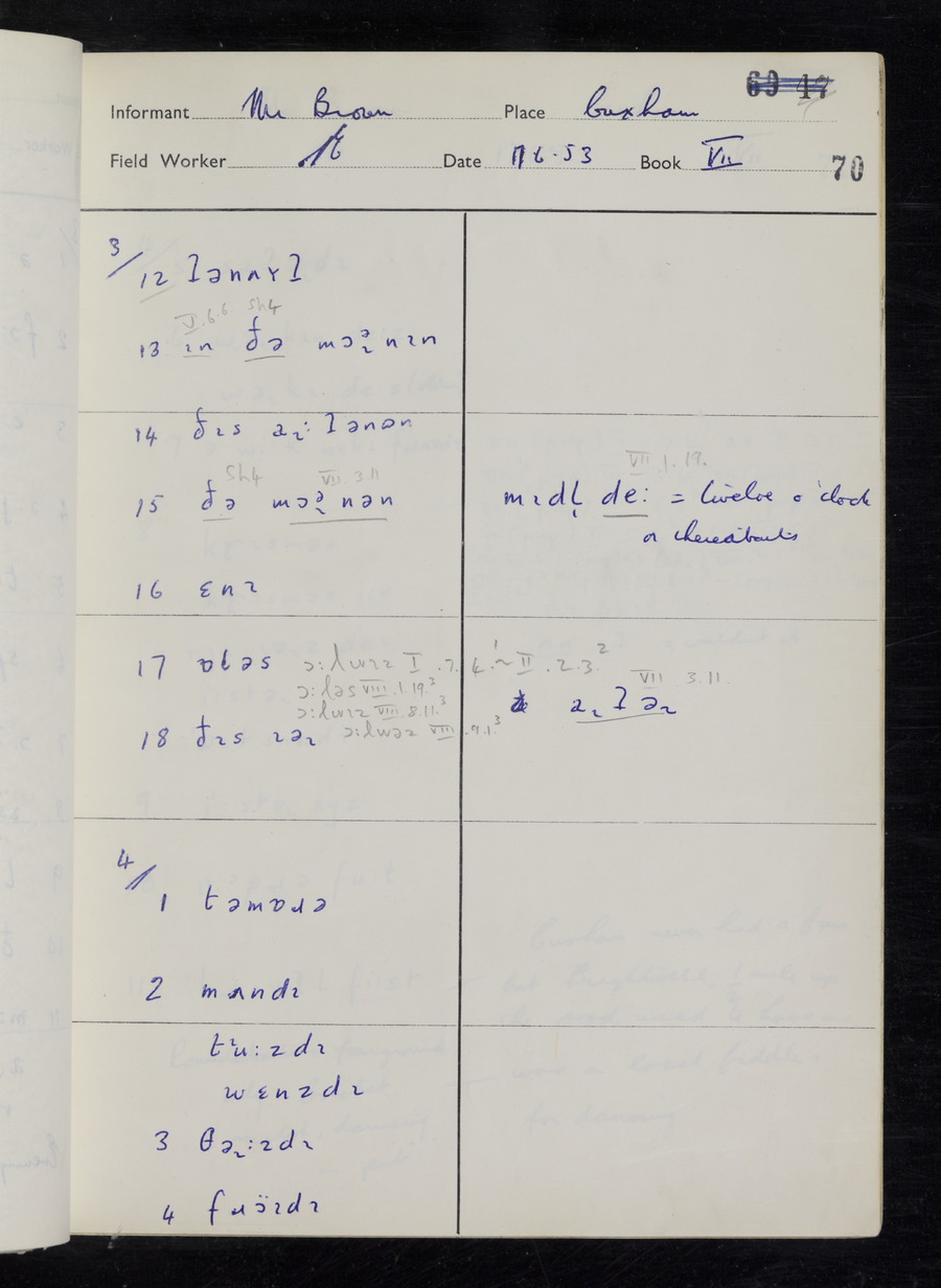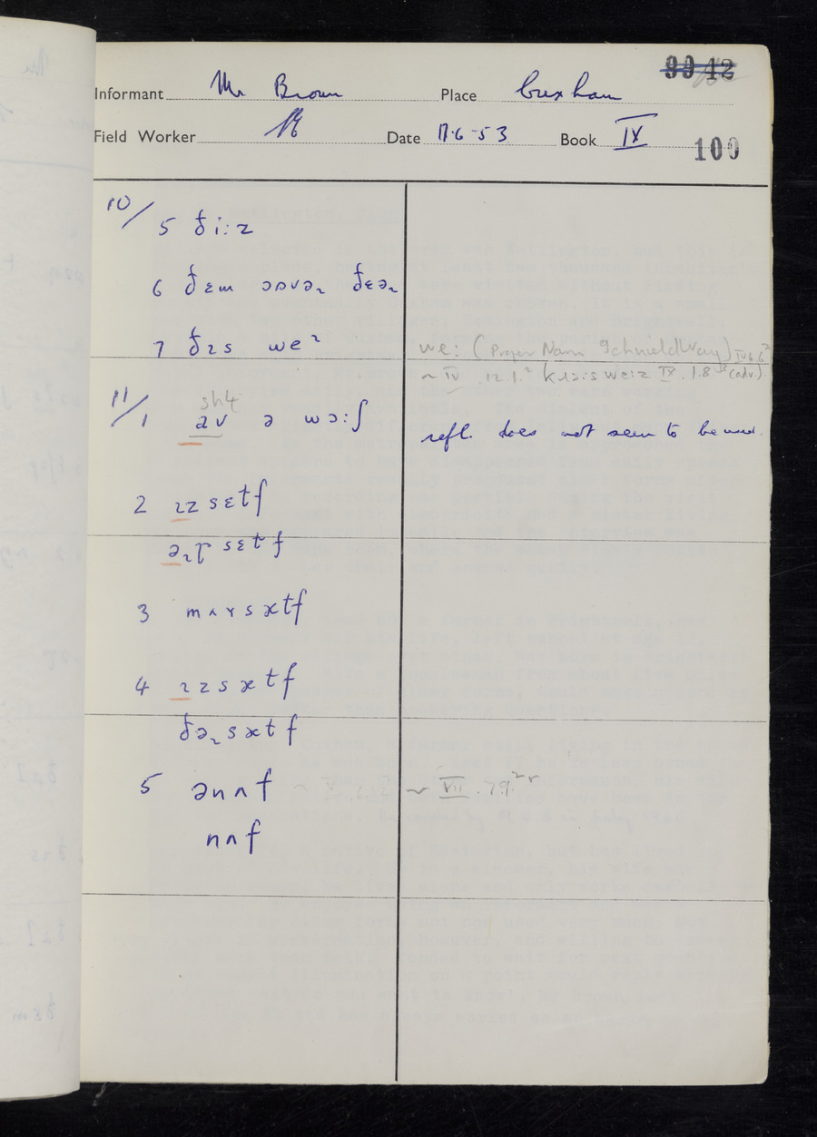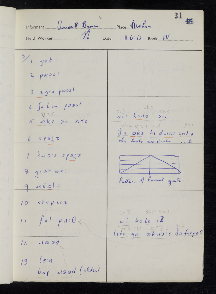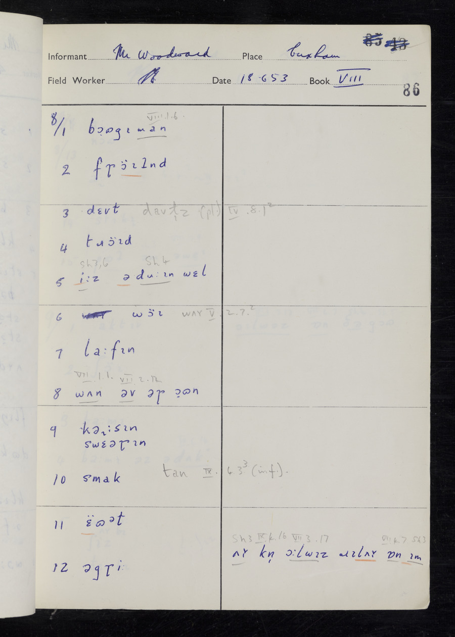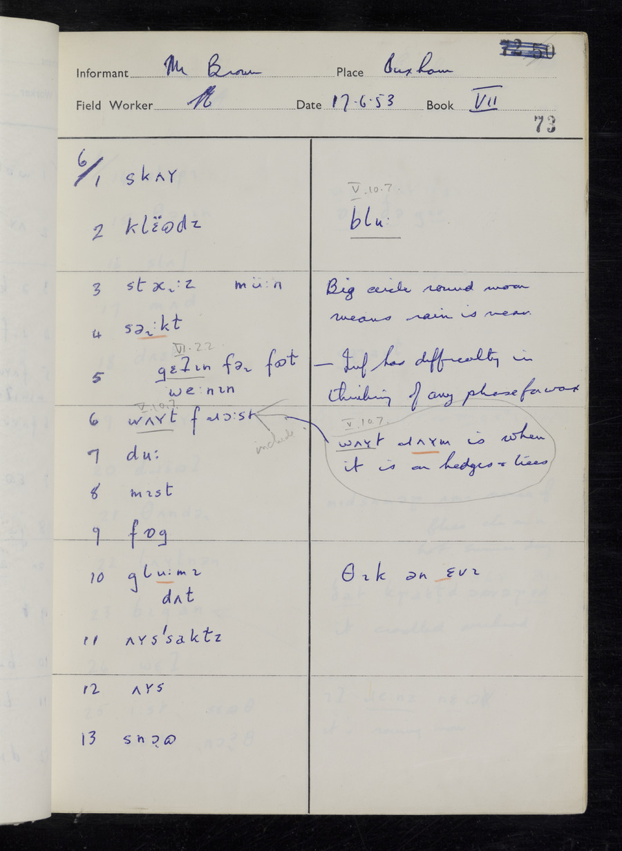 Interviews have been carried out by fieldworker Stanley Ellis. There are three informants for this response book - David Tapping, Amos Brown and George Woodward. Their responses can be found in the following books: David Tapping - I Amos Brown - II, III, IV, V, VI, VII, IX George Woodward - VIII