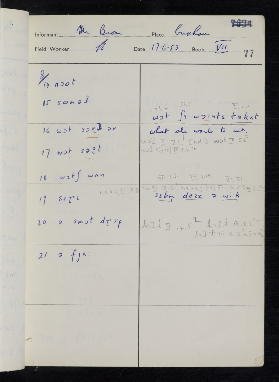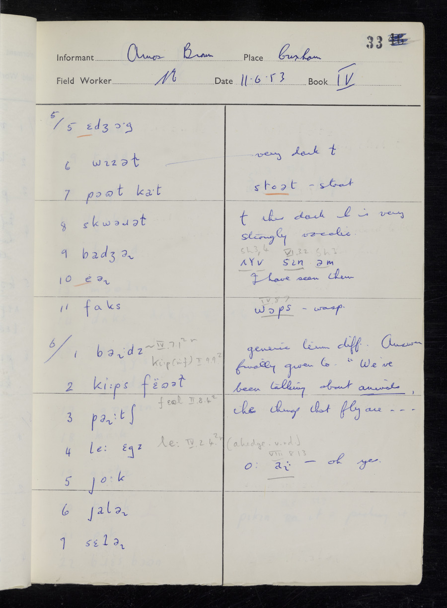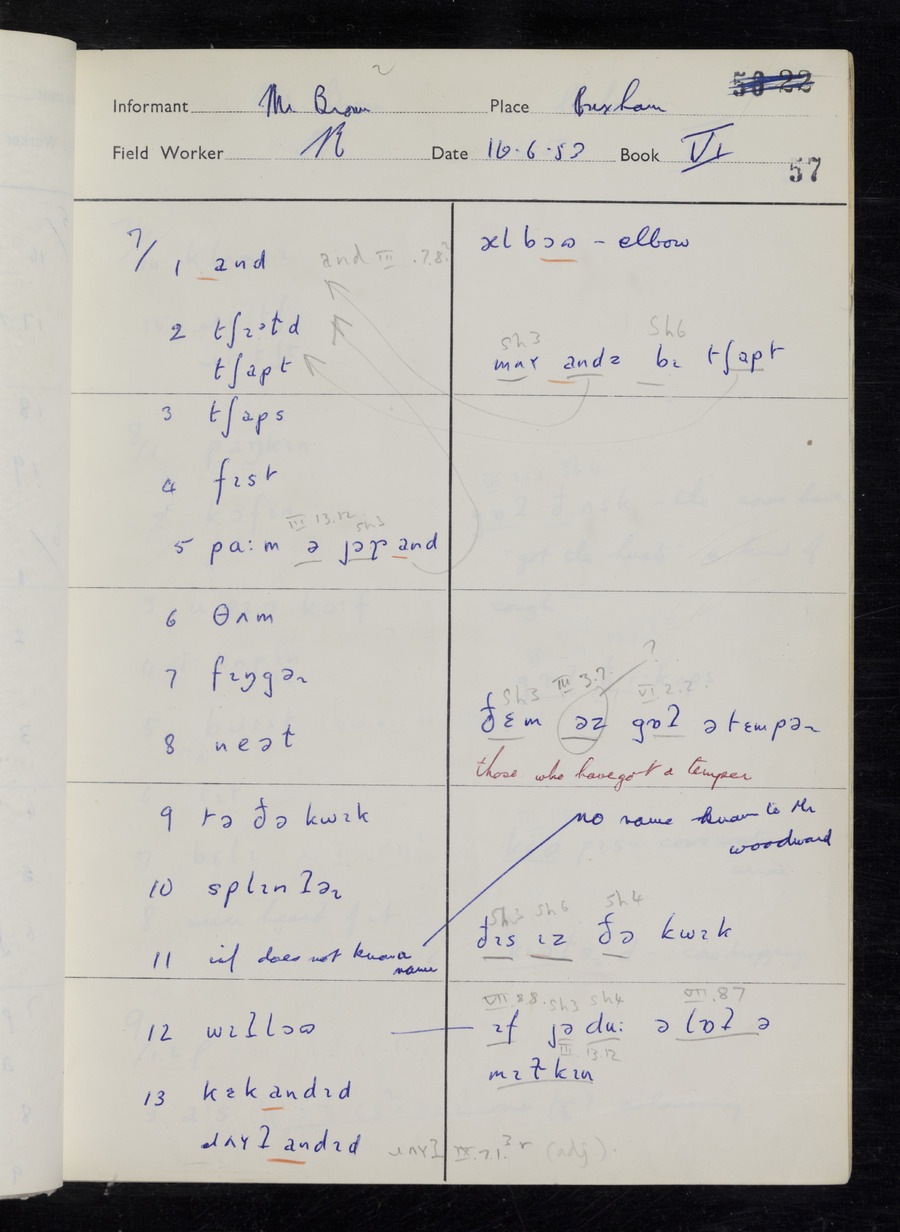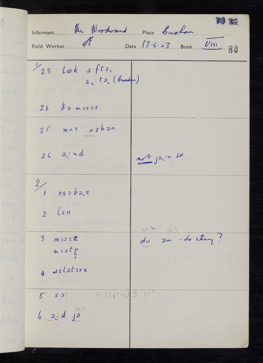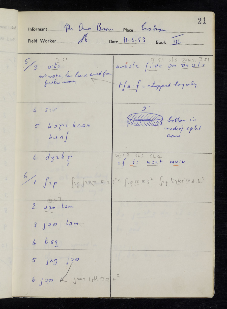 Interviews have been carried out by fieldworker Stanley Ellis. There are three informants for this response book - David Tapping, Amos Brown and George Woodward. Their responses can be found in the following books: David Tapping - I Amos Brown - II, III, IV, V, VI, VII, IX George Woodward - VIII