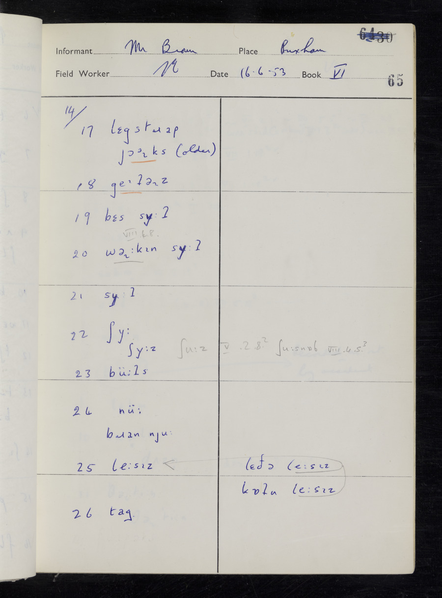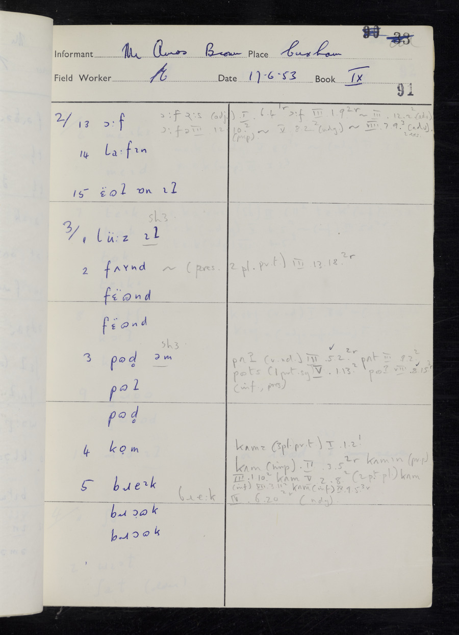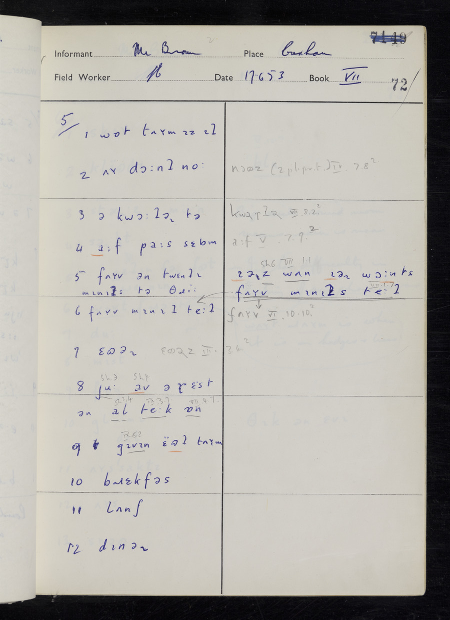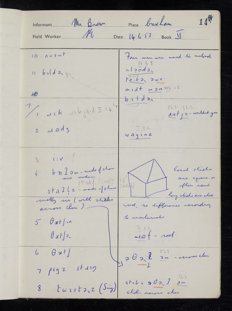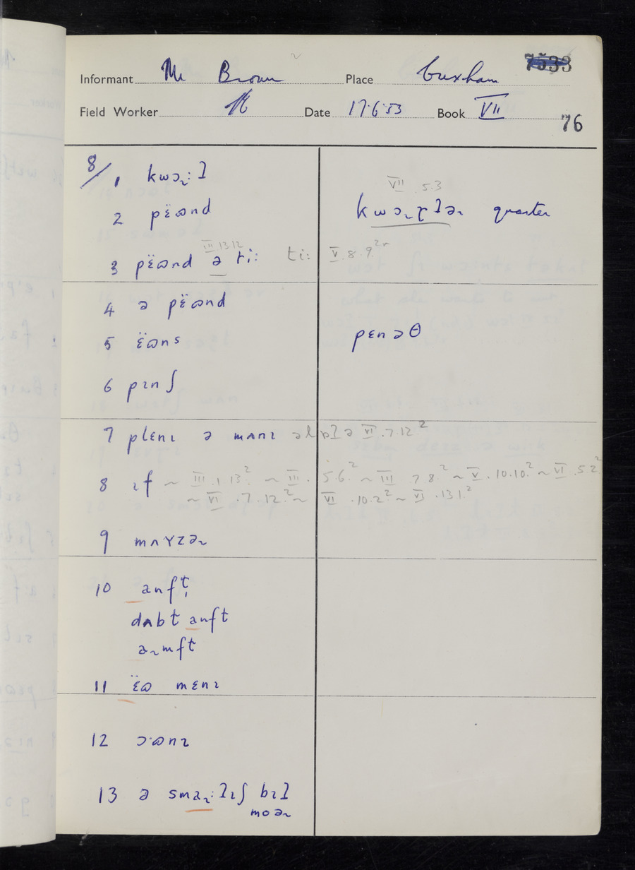Interviews have been carried out by fieldworker Stanley Ellis. There are three informants for this response book - David Tapping, Amos Brown and George Woodward. Their responses can be found in the following books: David Tapping - I Amos Brown - II, III, IV, V, VI, VII, IX George Woodward - VIII