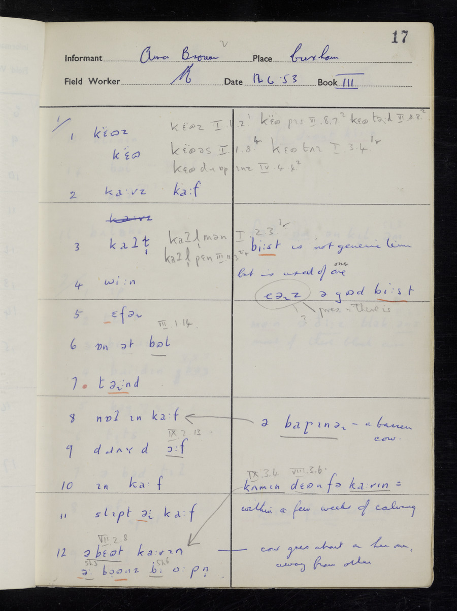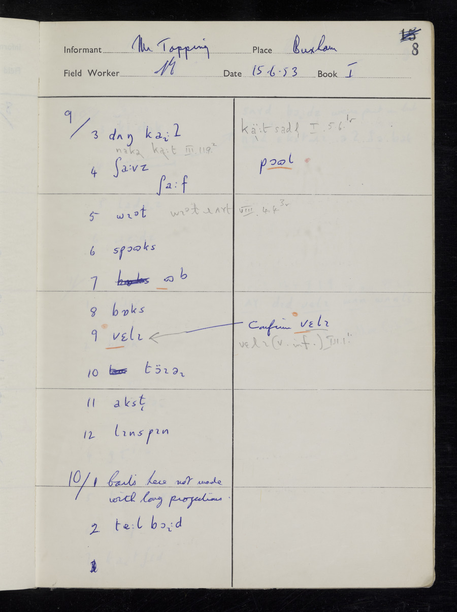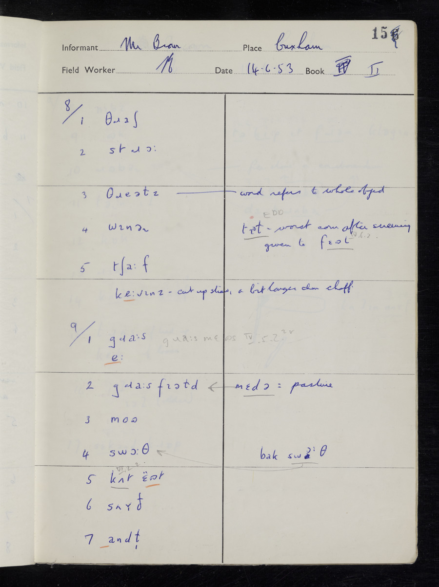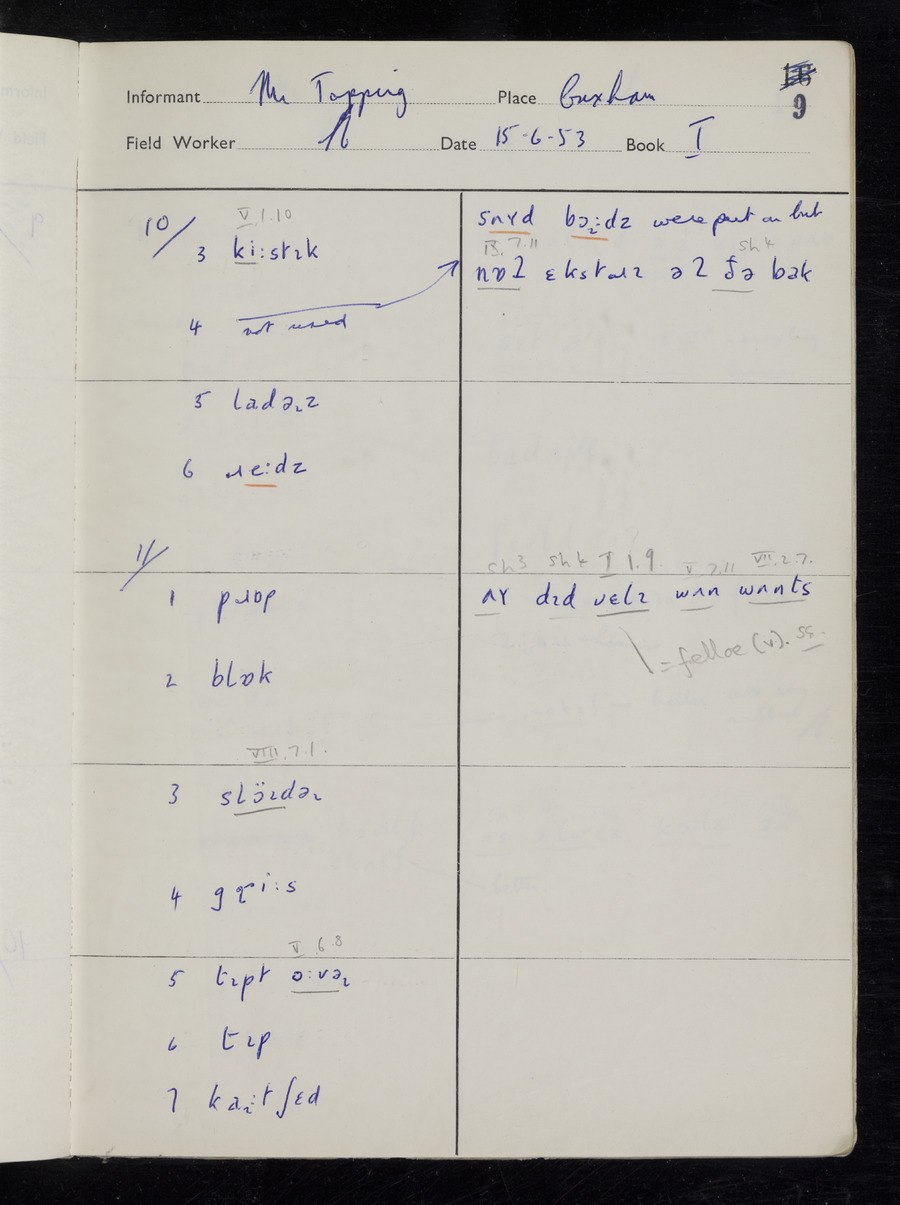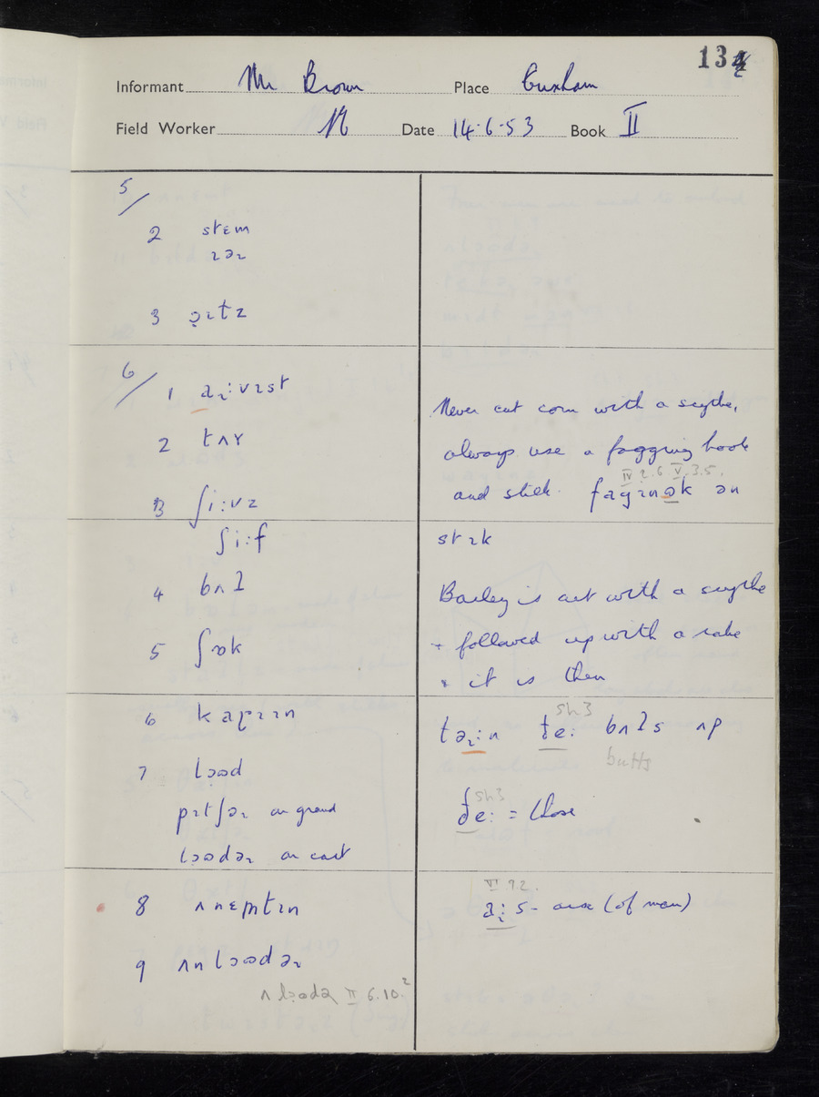 Response book recording the answers given by informants during the Survey of English Dialect. It includes 9 sections that cover a range of topics relating to work, domestic and social life. Answers are recorded in the International Phonetic Alphabet.