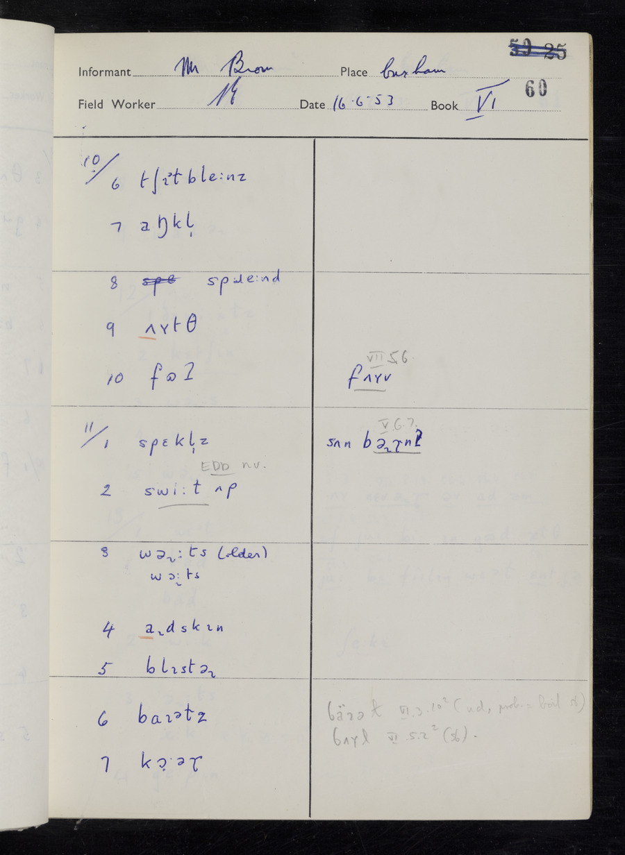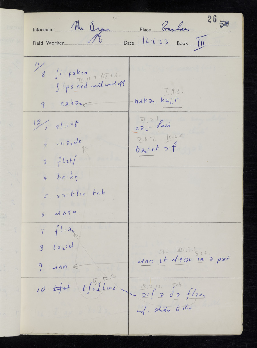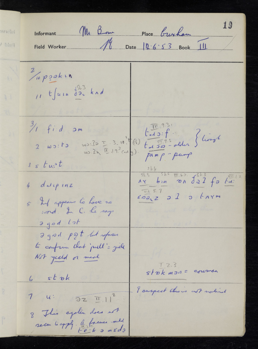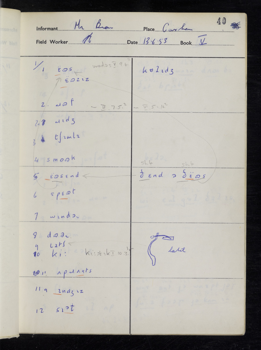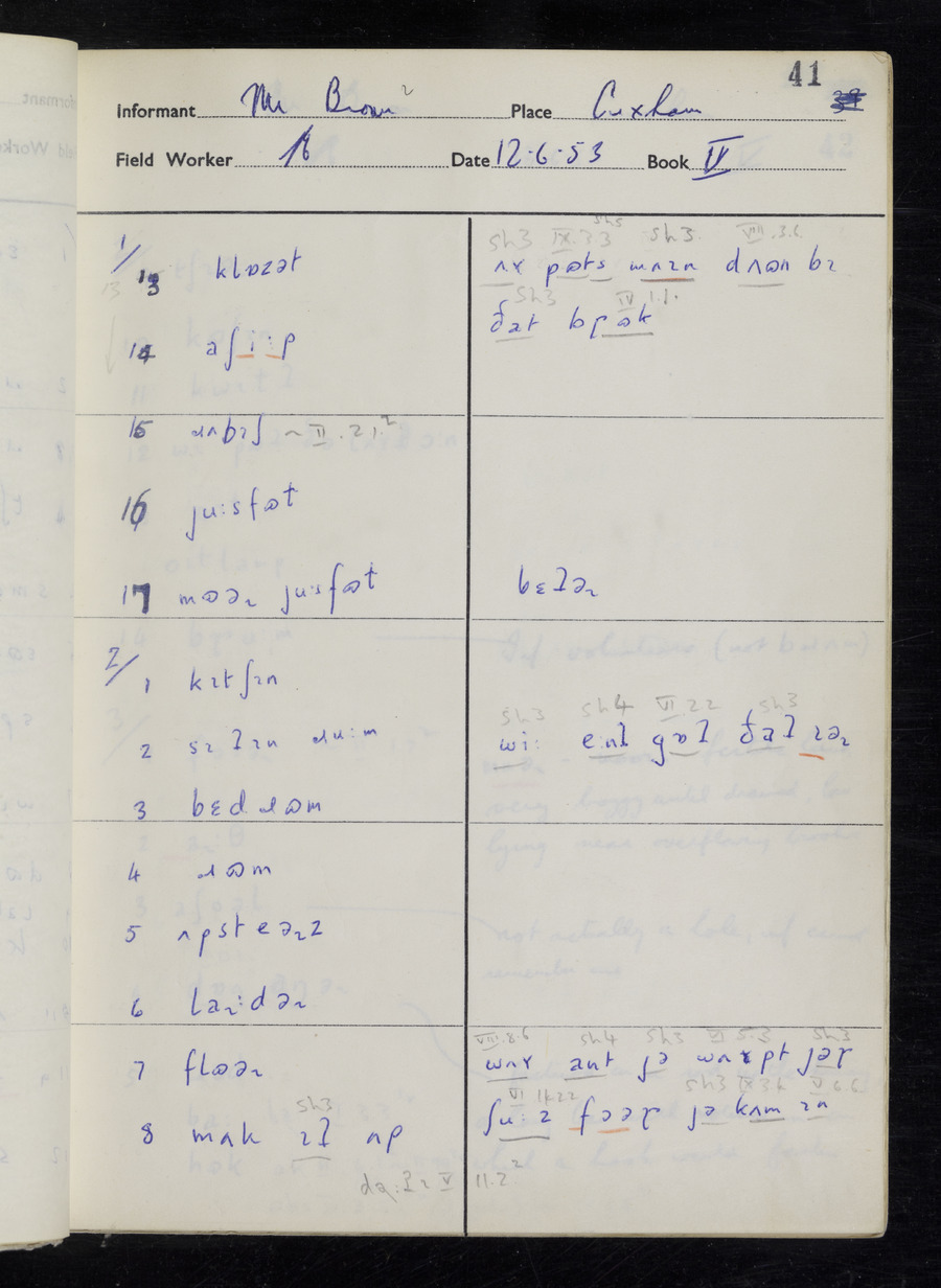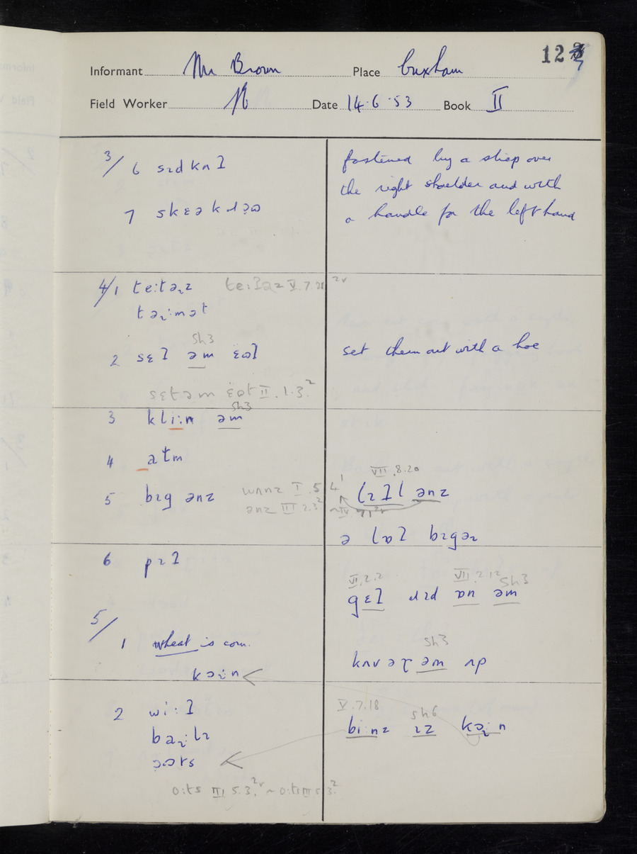 Response book recording the answers given by informants during the Survey of English Dialect. It includes 9 sections that cover a range of topics relating to work, domestic and social life. Answers are recorded in the International Phonetic Alphabet.