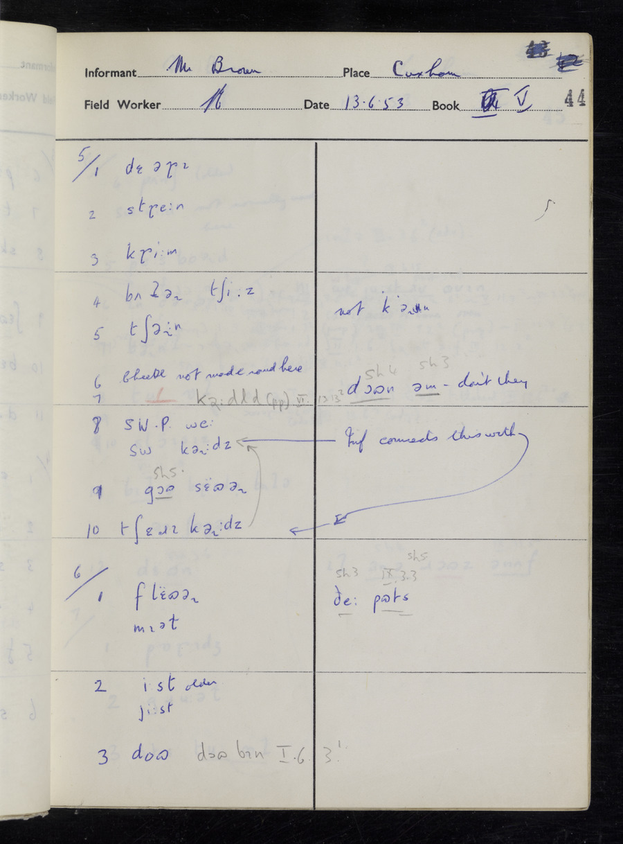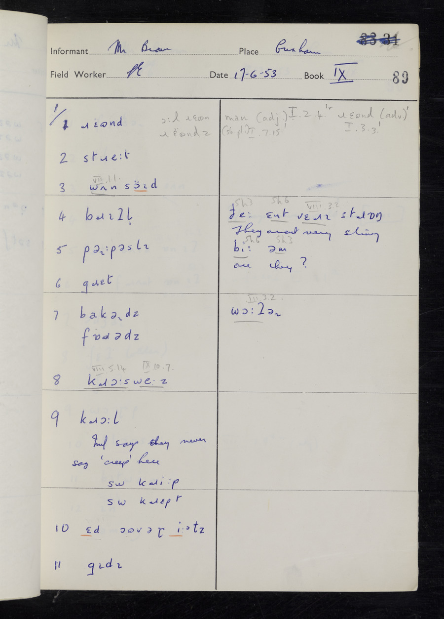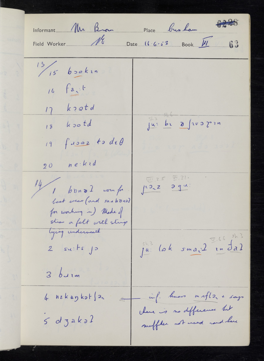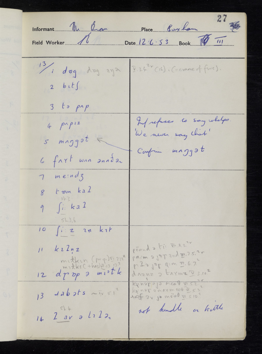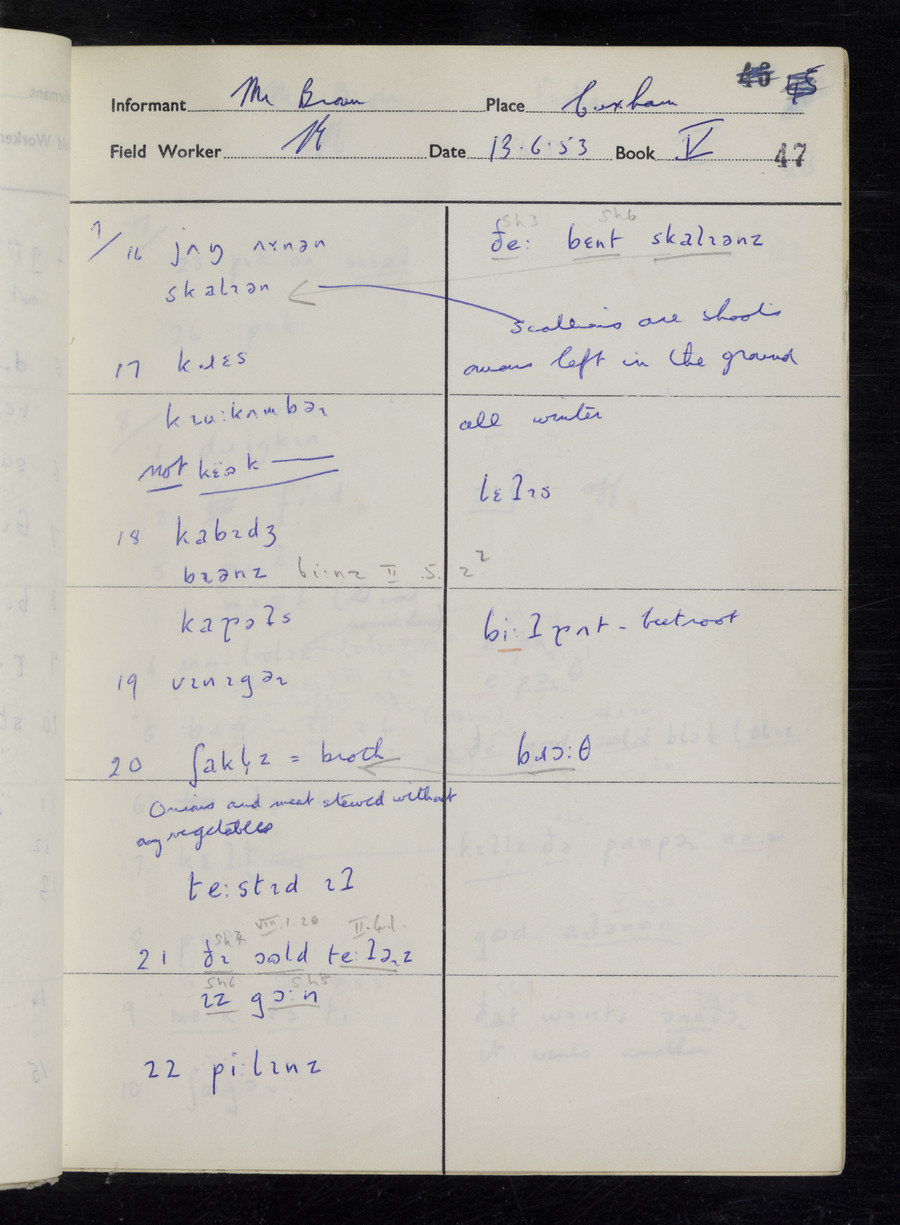 Response book recording the answers given by informants during the Survey of English Dialect. It includes 9 sections that cover a range of topics relating to work, domestic and social life. Answers are recorded in the International Phonetic Alphabet.