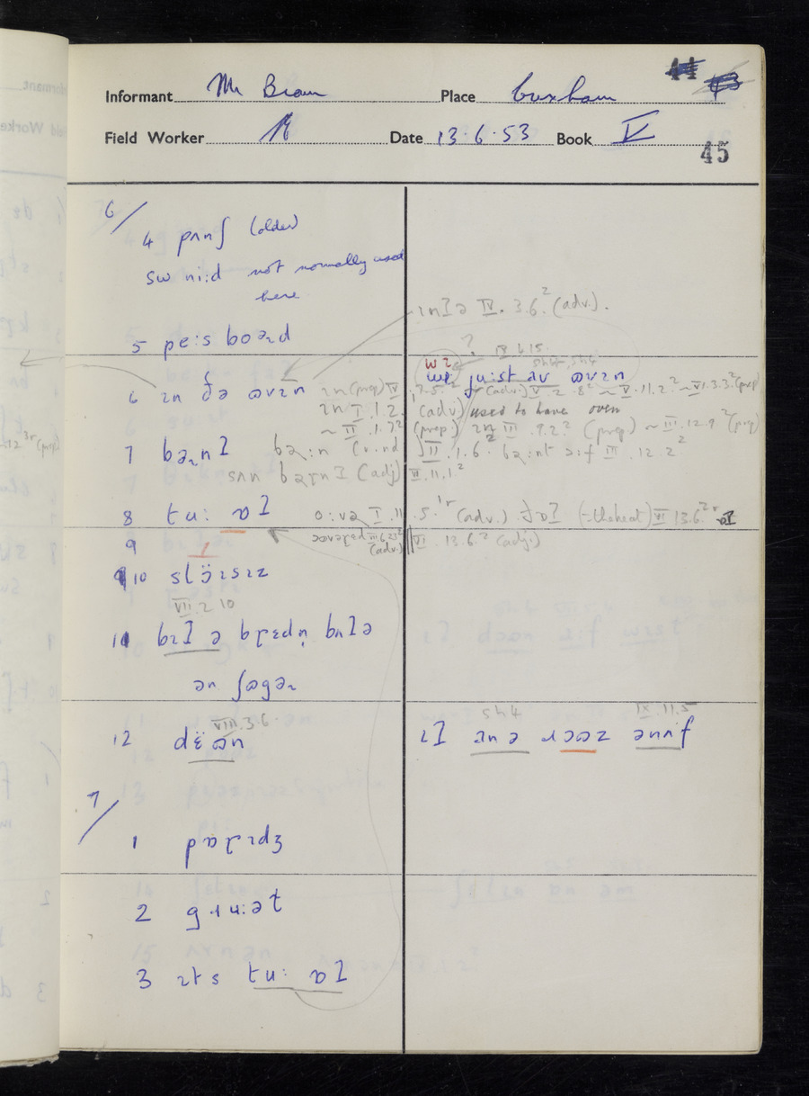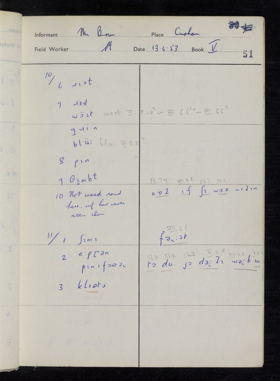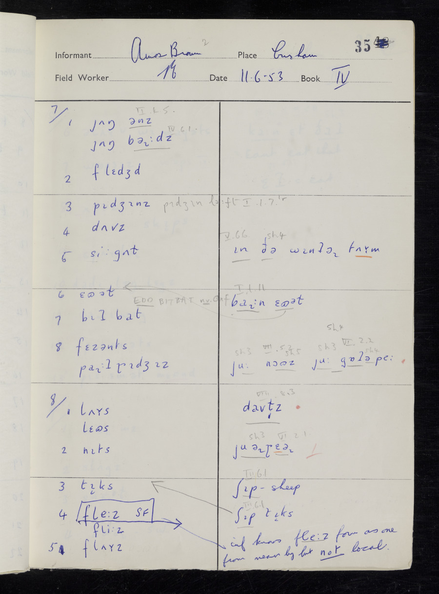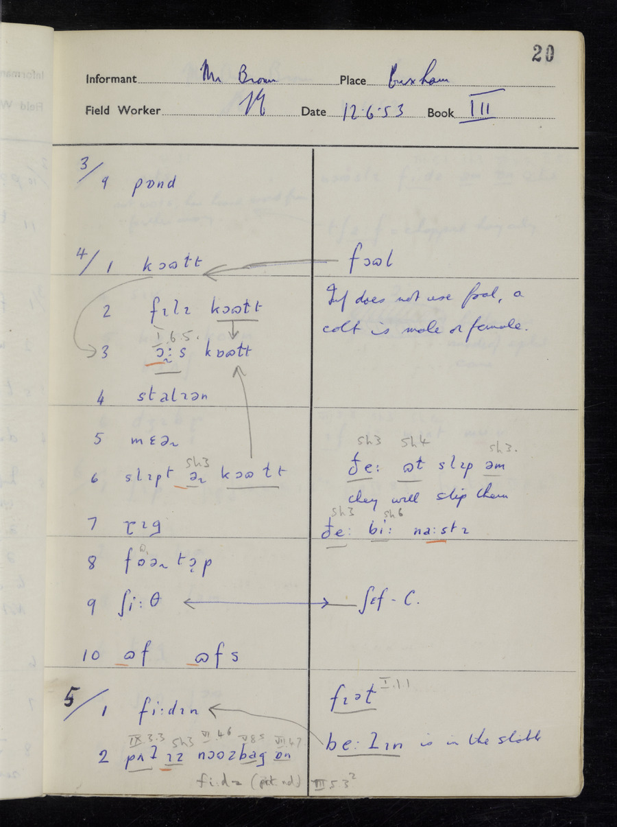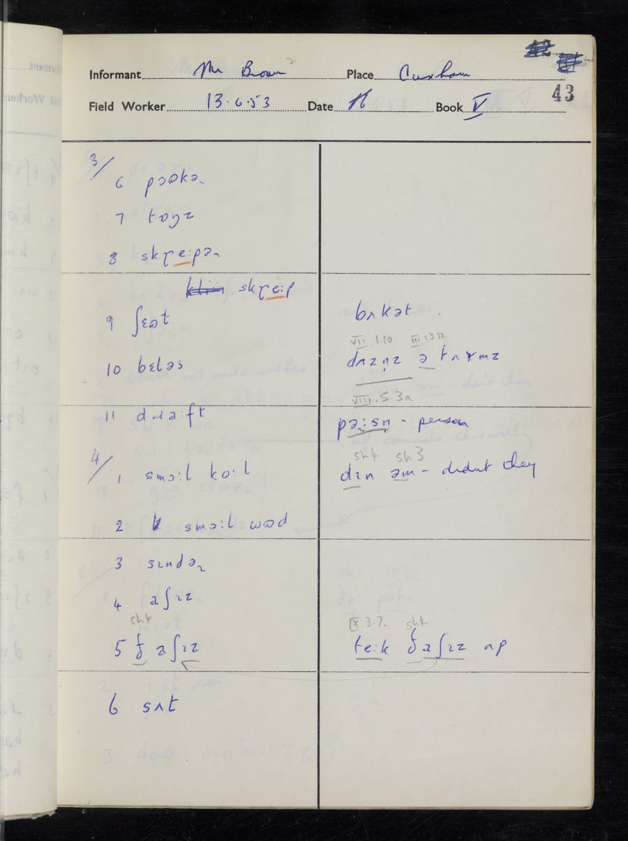 Response book recording the answers given by informants during the Survey of English Dialect. It includes 9 sections that cover a range of topics relating to work, domestic and social life. Answers are recorded in the International Phonetic Alphabet.