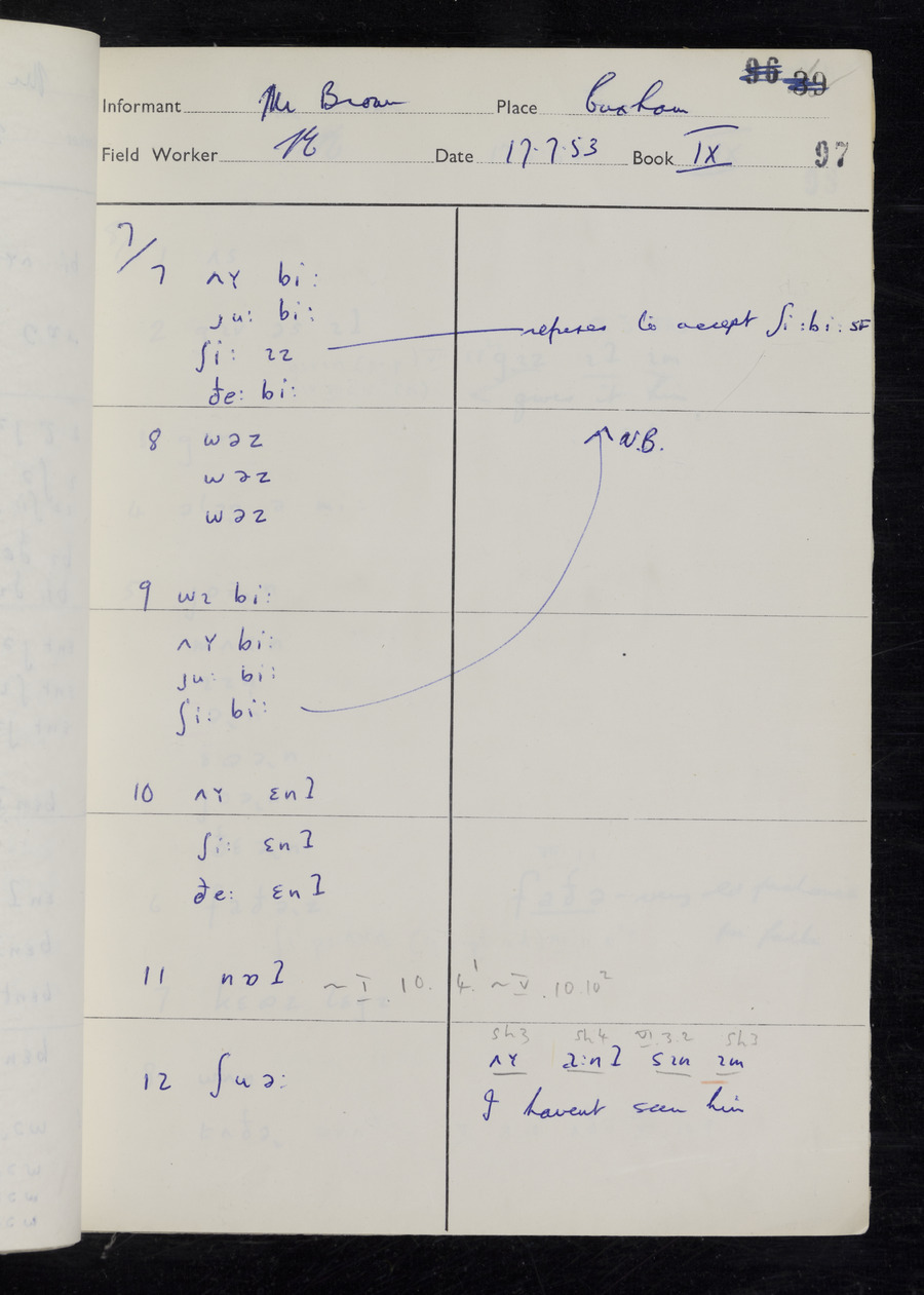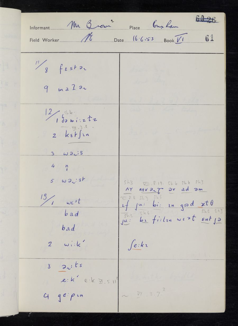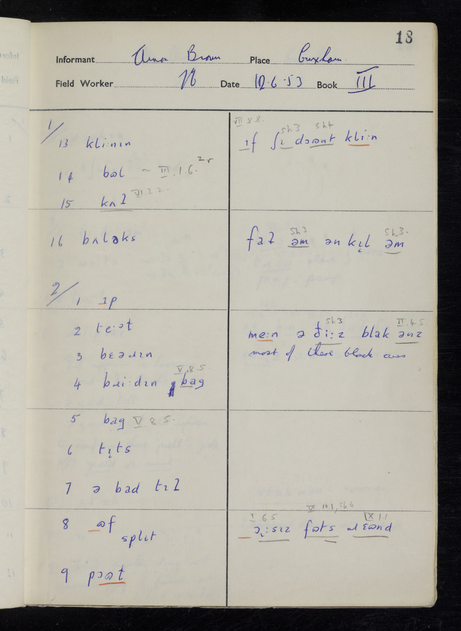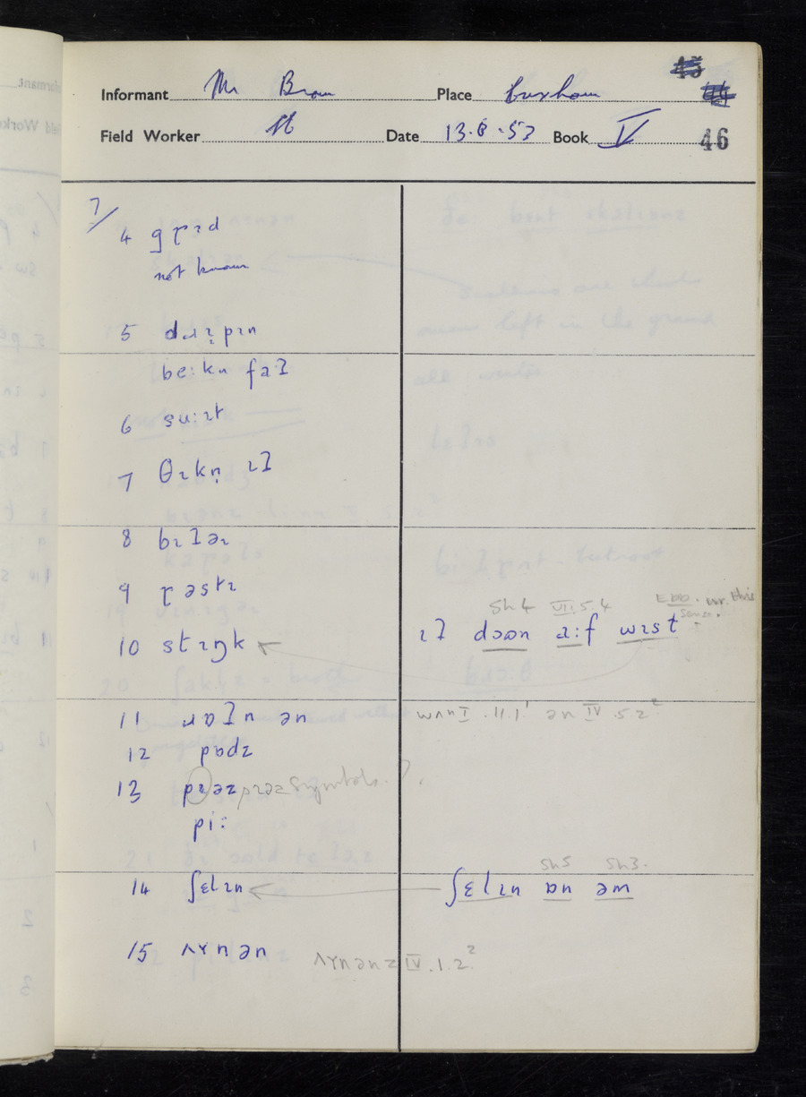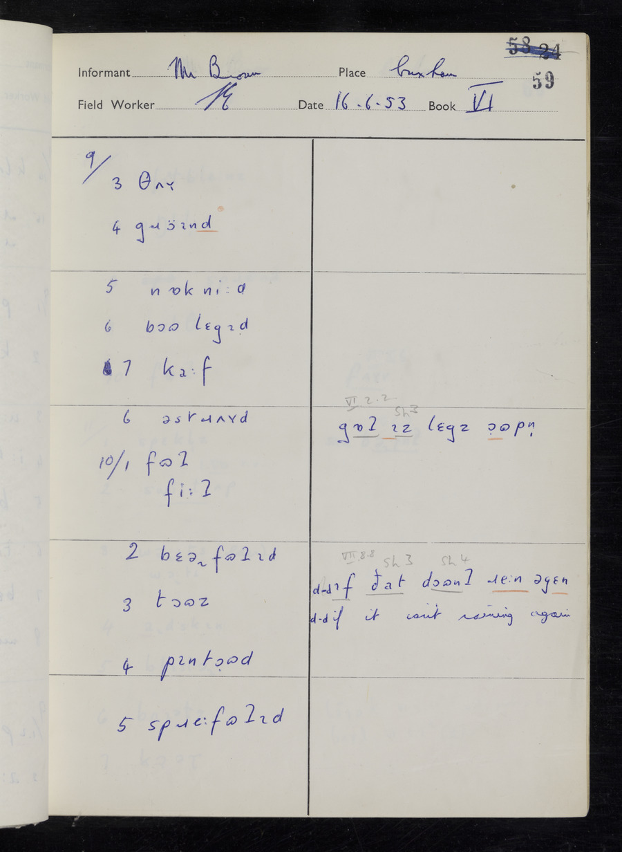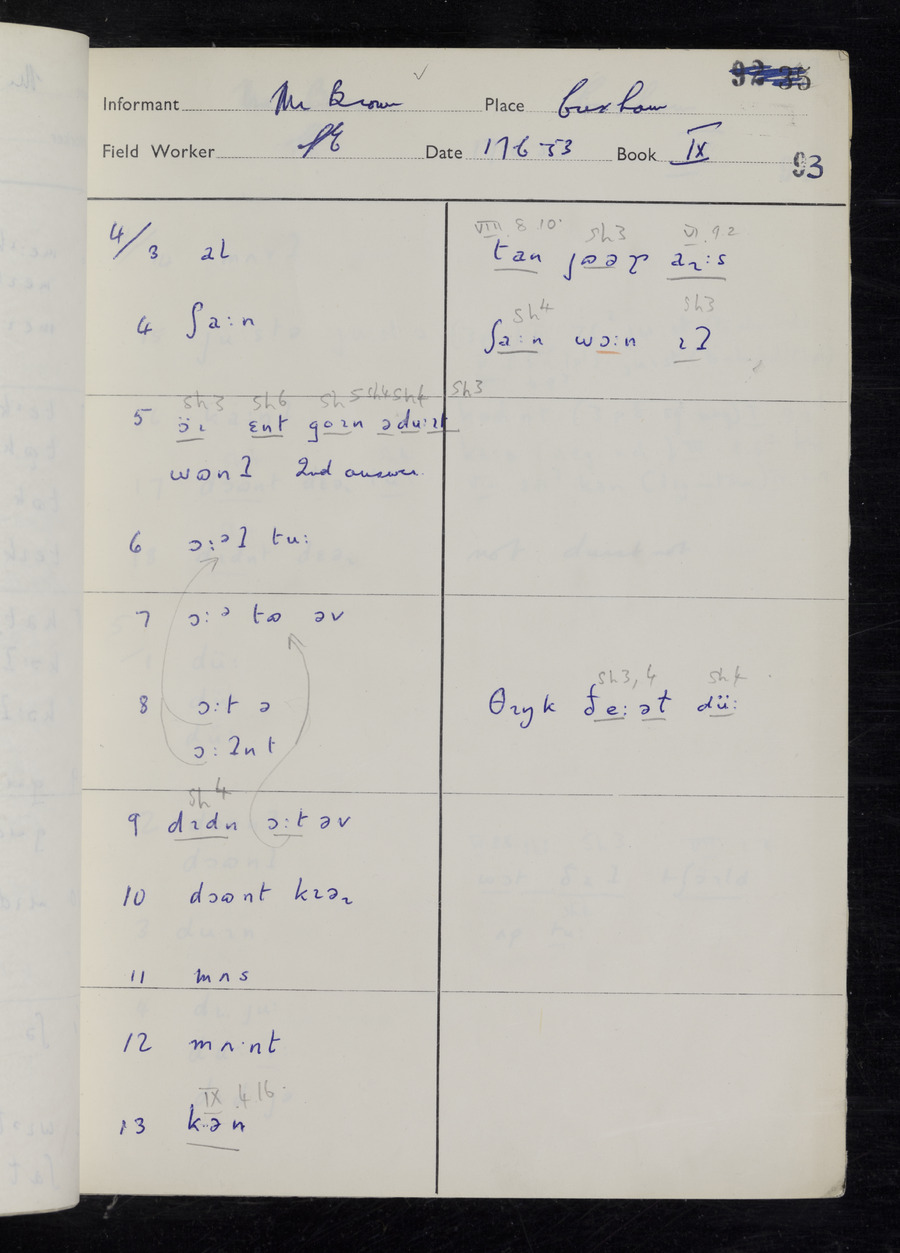 Response book recording the answers given by informants during the Survey of English Dialect. It includes 9 sections that cover a range of topics relating to work, domestic and social life. Answers are recorded in the International Phonetic Alphabet.