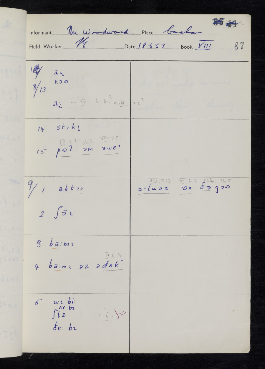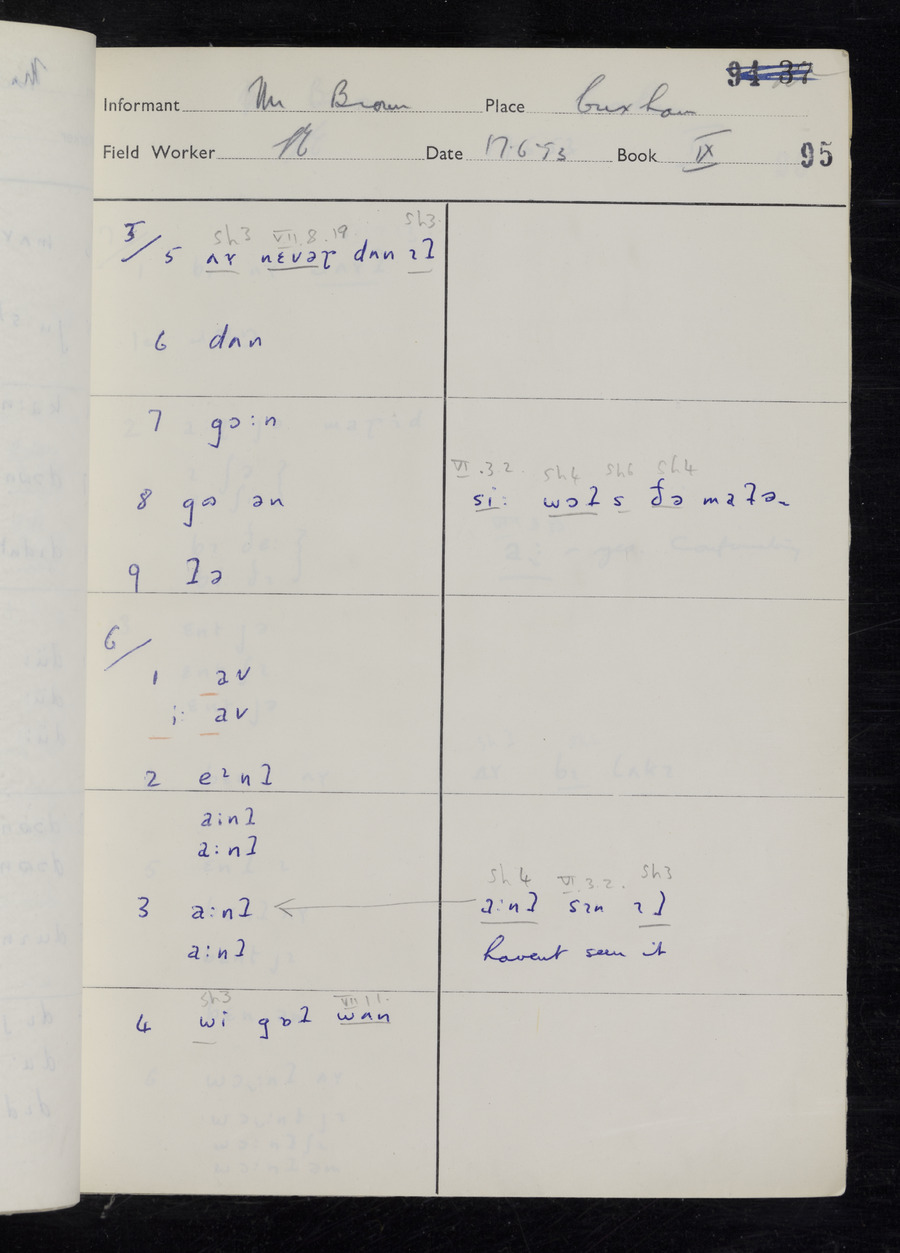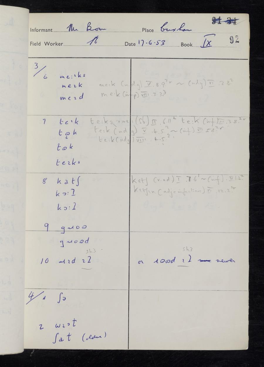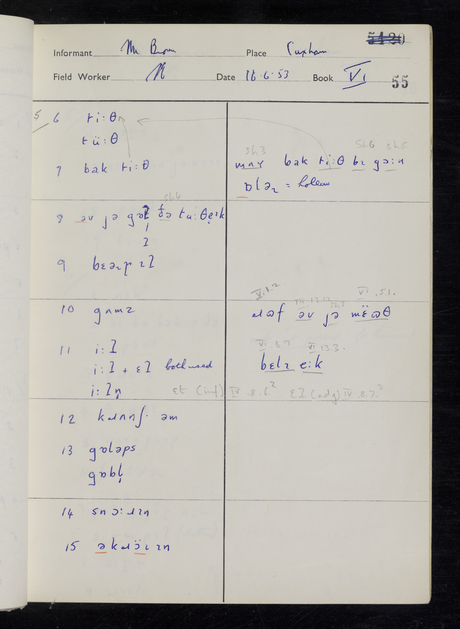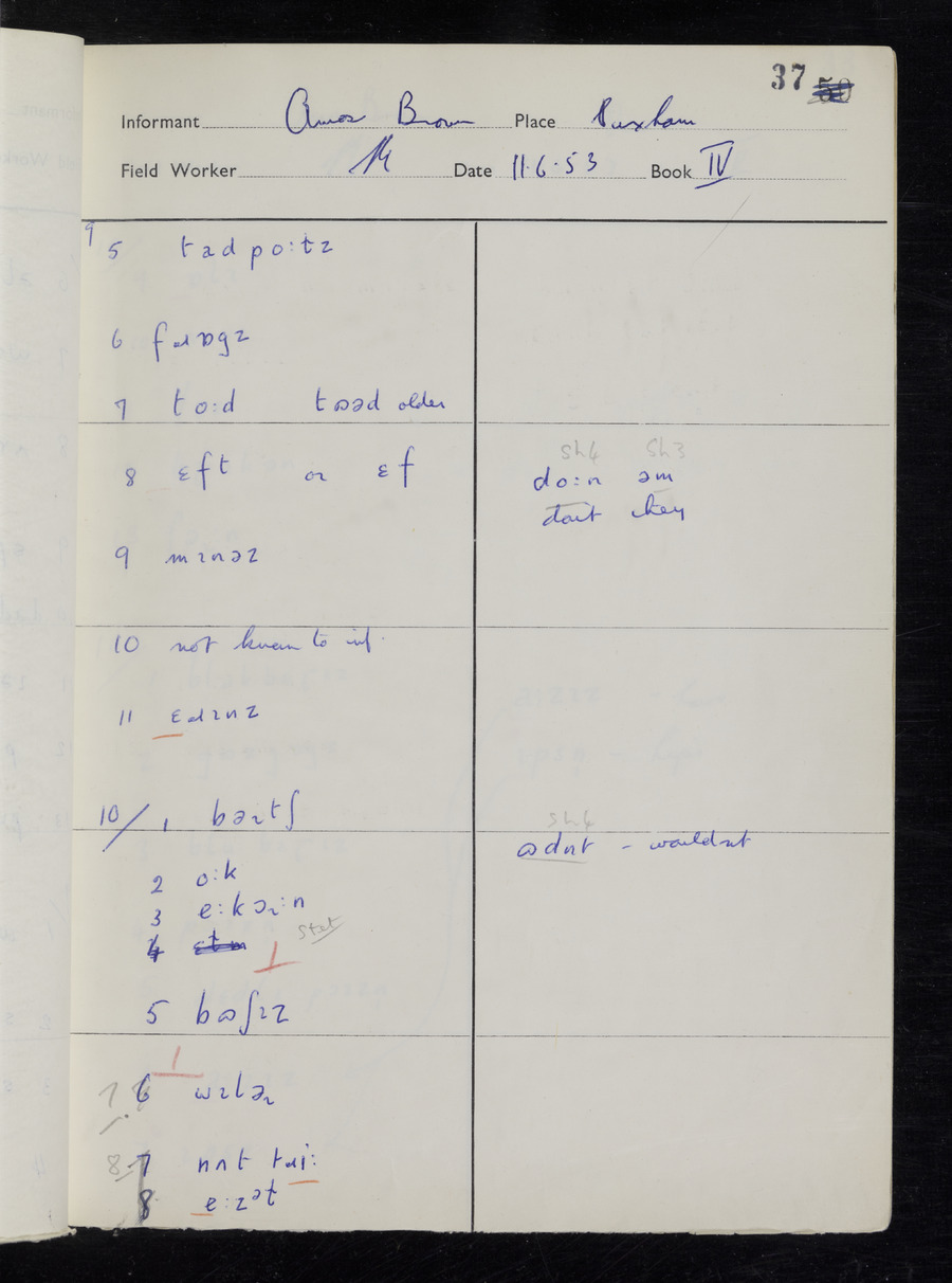 Response book recording the answers given by informants during the Survey of English Dialect. It includes 9 sections that cover a range of topics relating to work, domestic and social life. Answers are recorded in the International Phonetic Alphabet.