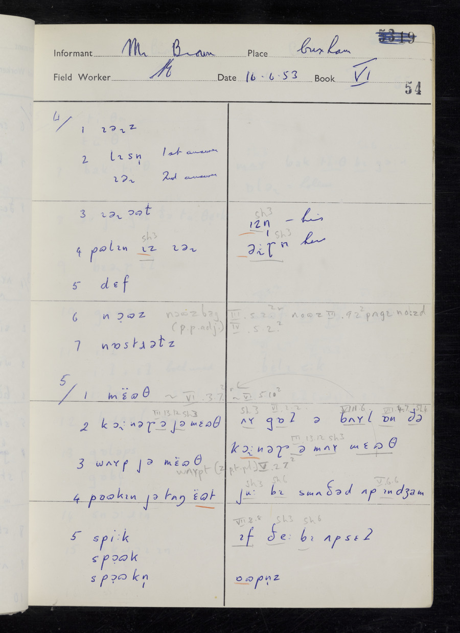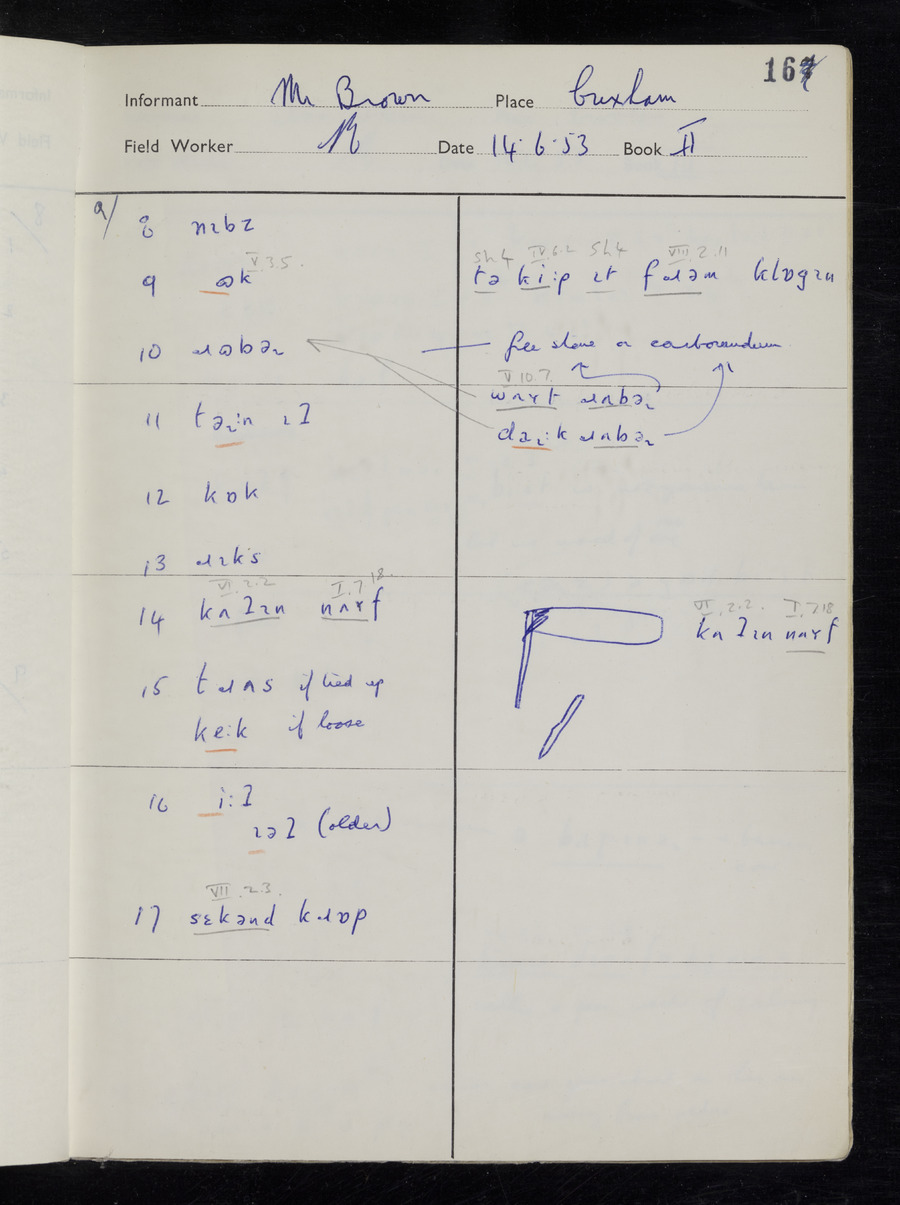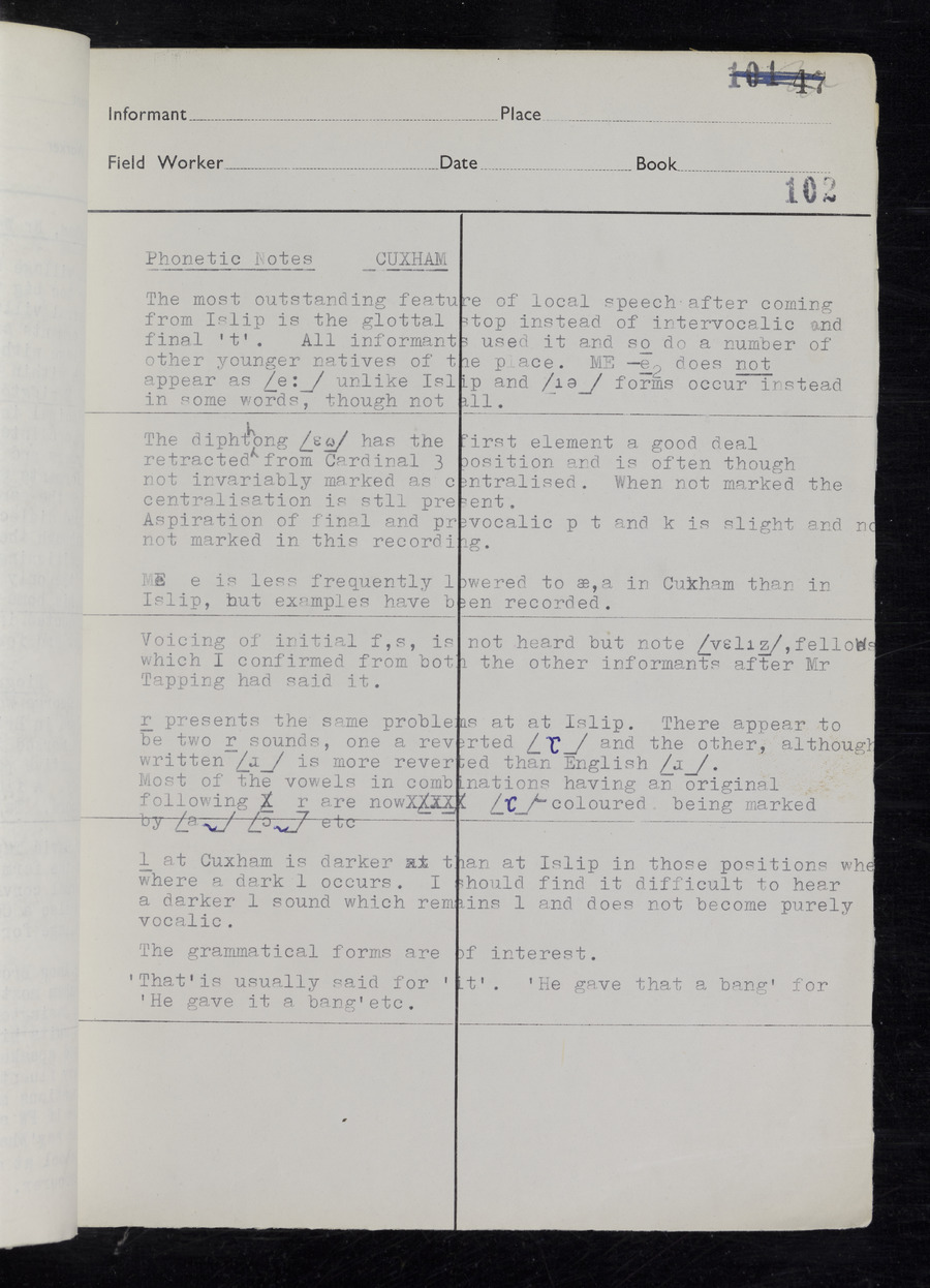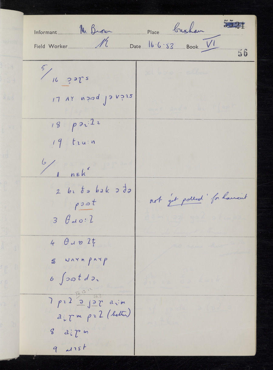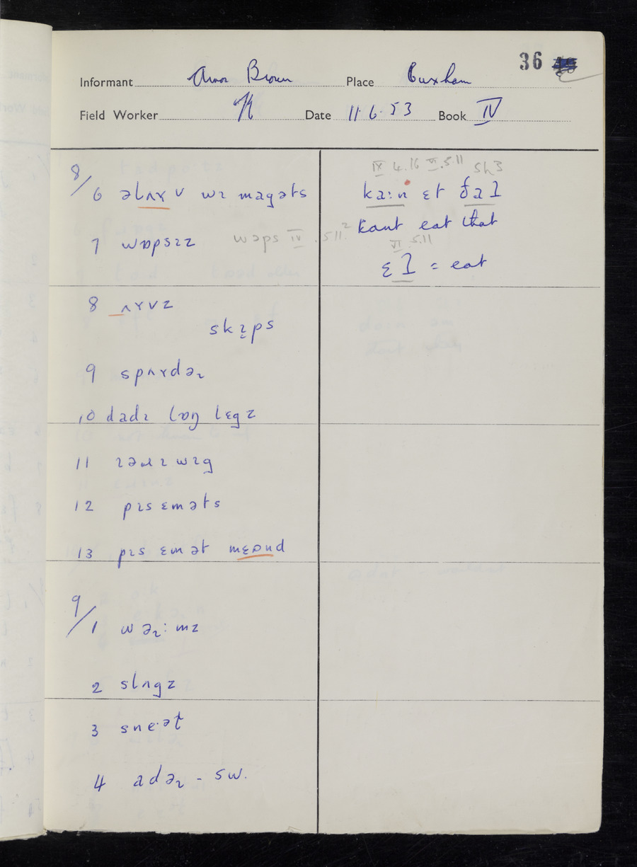 Response book recording the answers given by informants during the Survey of English Dialect. It includes 9 sections that cover a range of topics relating to work, domestic and social life. Answers are recorded in the International Phonetic Alphabet.
