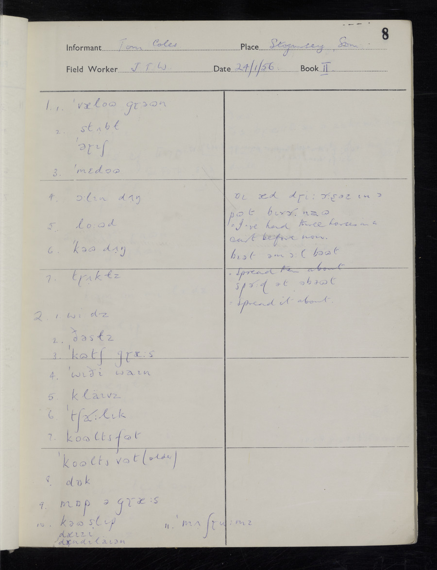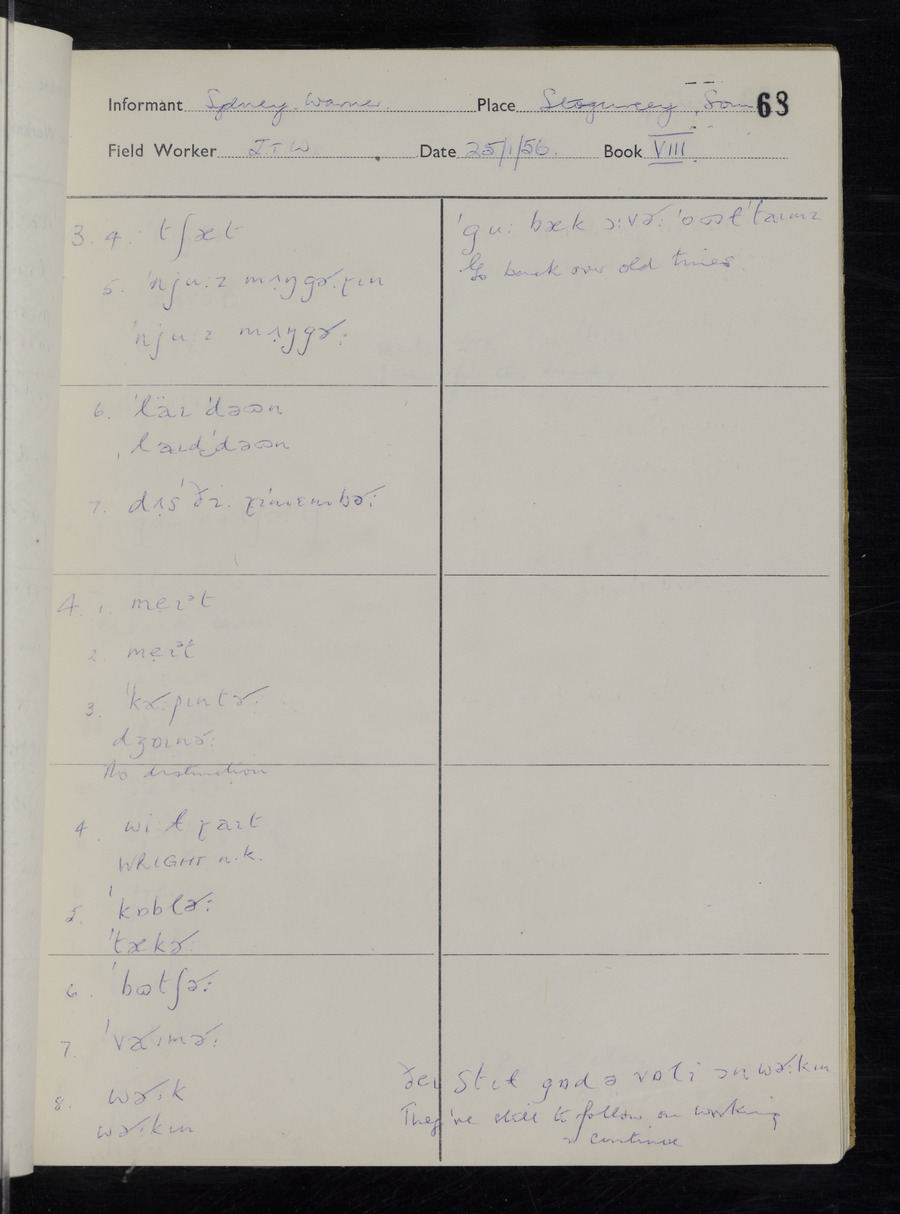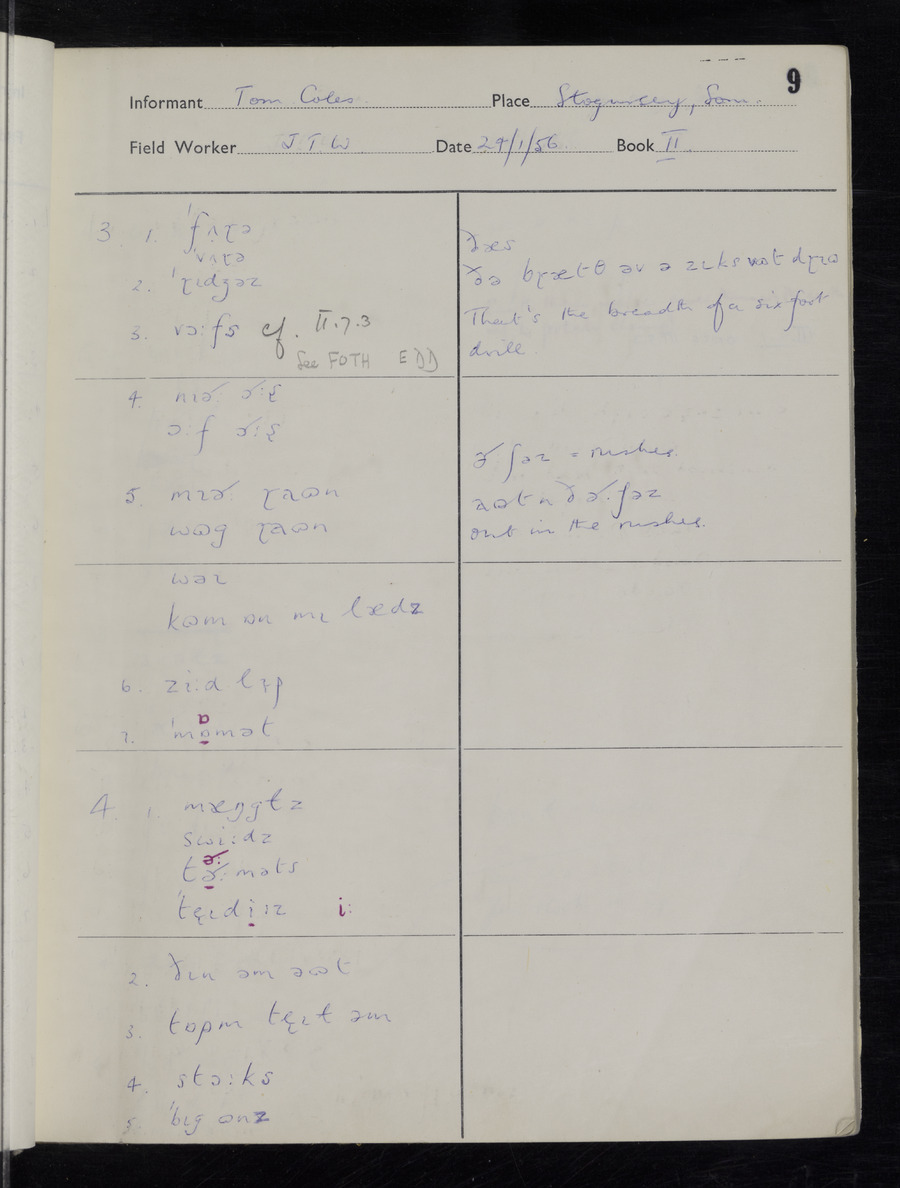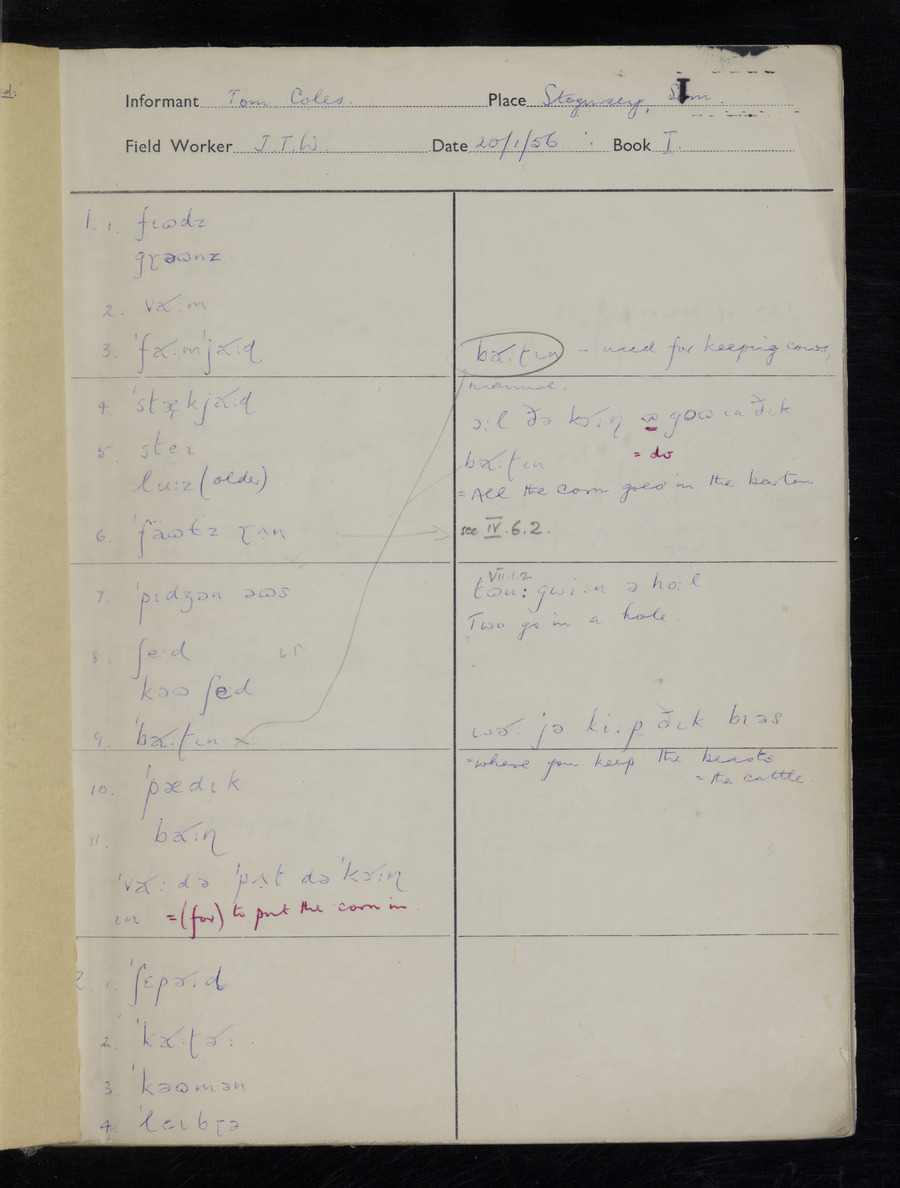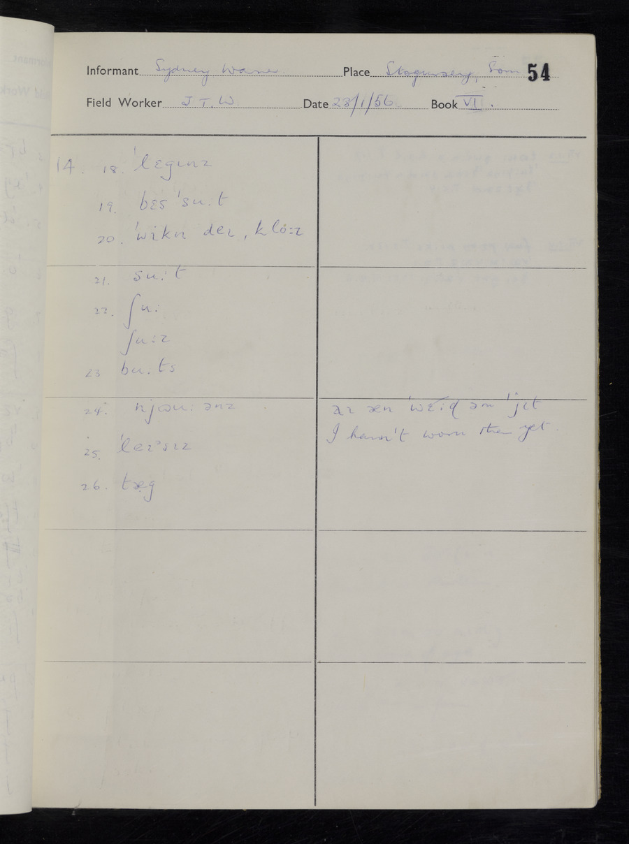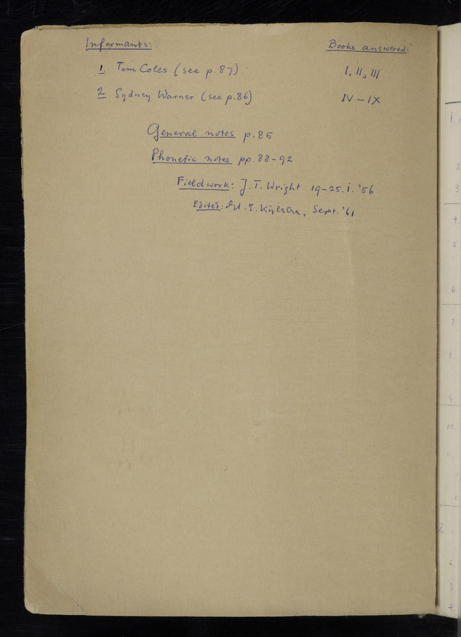Interviews have been carried out by fieldworker John Wright. There are two informants for this response book - Tom Coles and Sydney Vaughan Warner. Their responses can be found in the following books: Tom Coles - I, II, III Sydney Warner - IV, V, VI, VII, VIII, IX