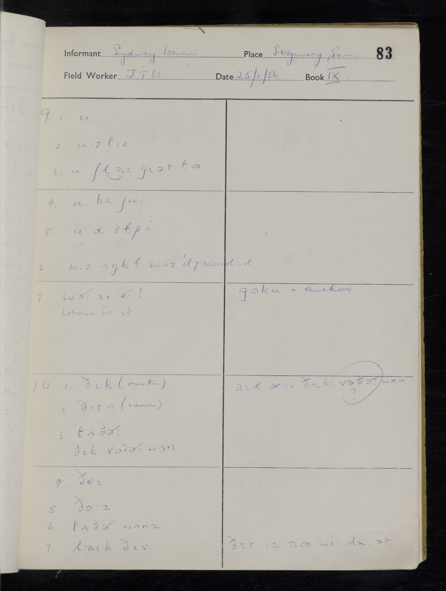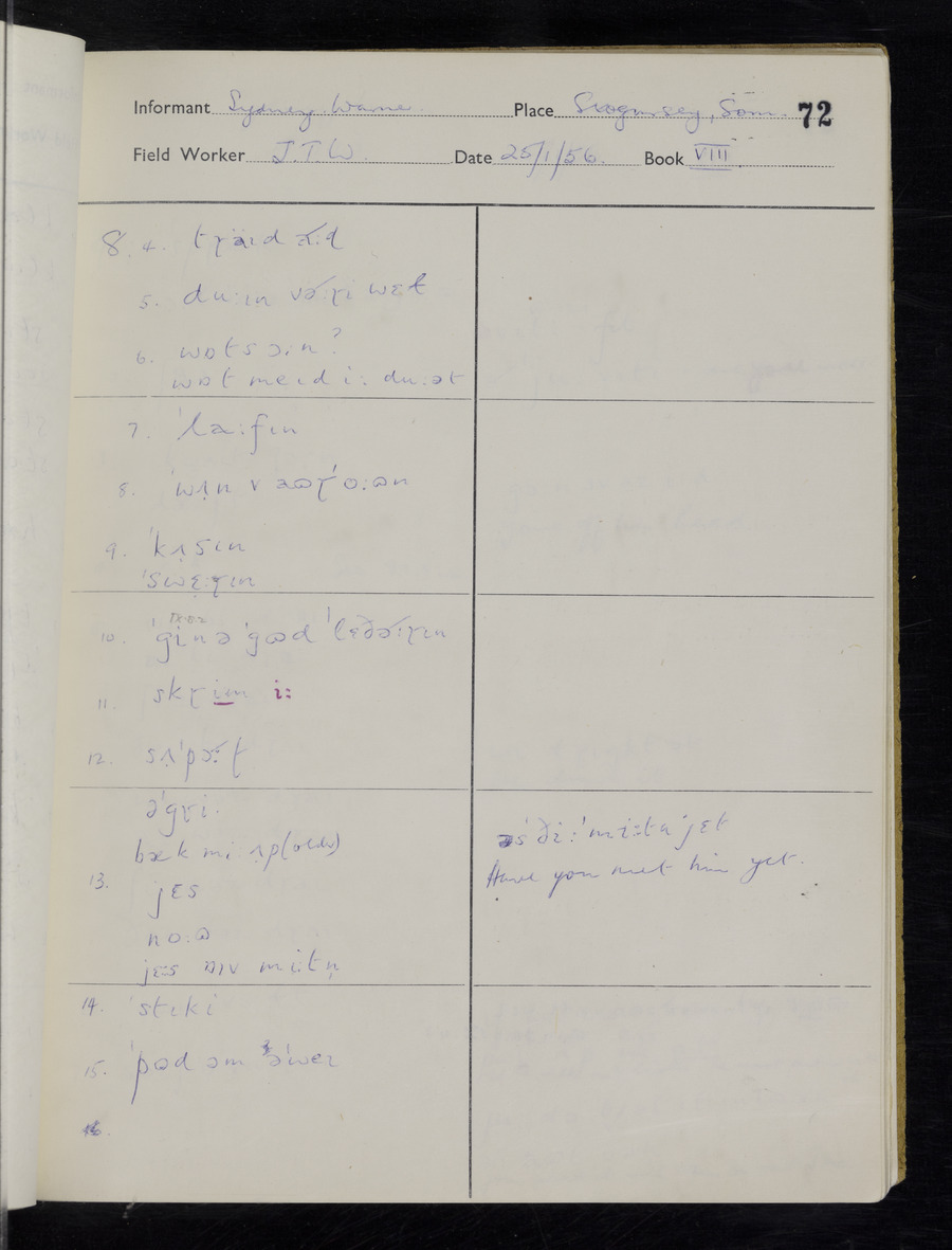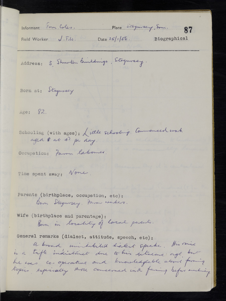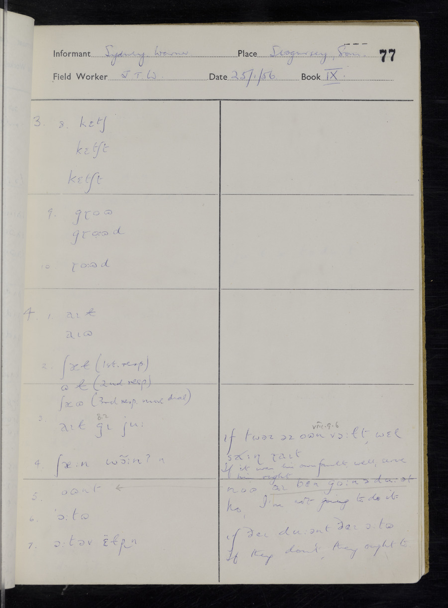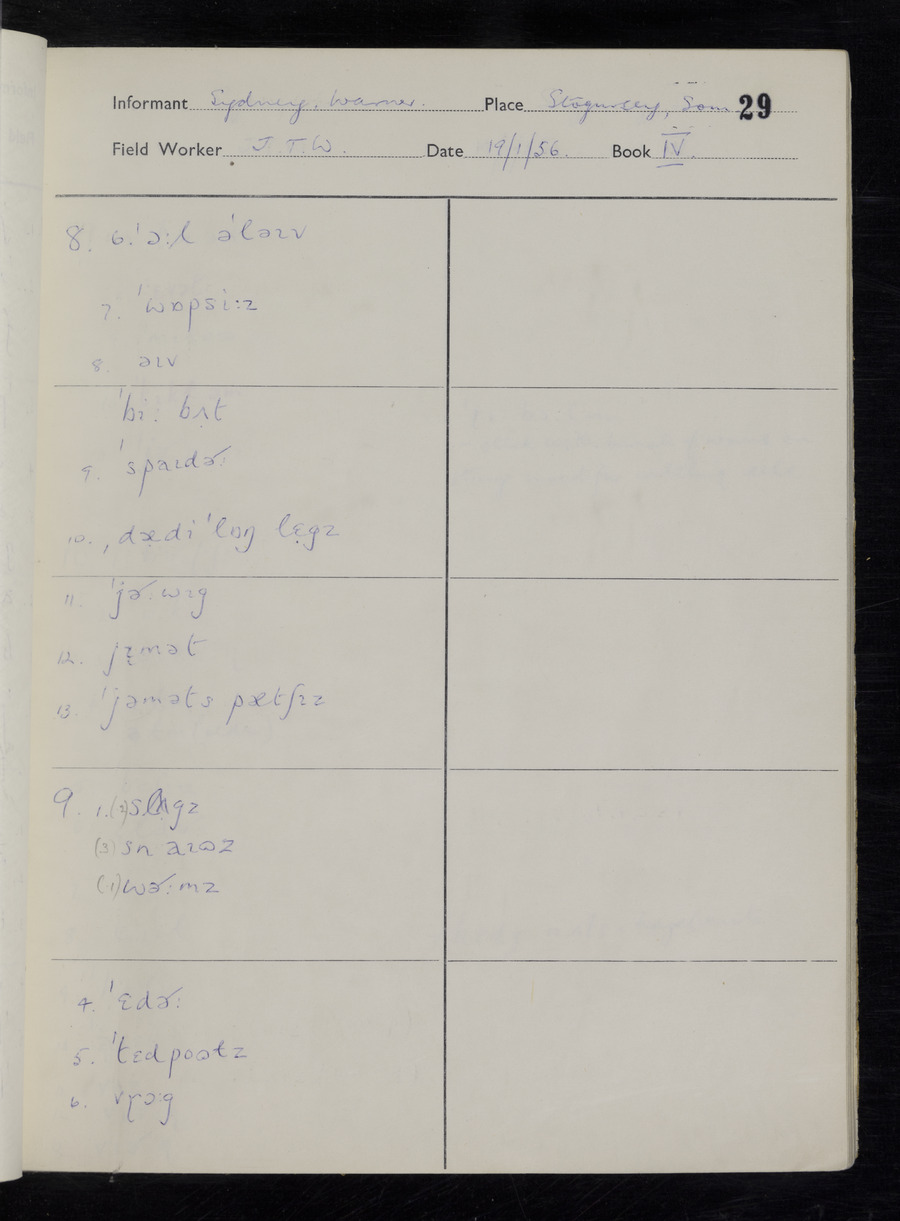 Interviews have been carried out by fieldworker John Wright. There are two informants for this response book - Tom Coles and Sydney Vaughan Warner. Their responses can be found in the following books: Tom Coles - I, II, III Sydney Warner - IV, V, VI, VII, VIII, IX